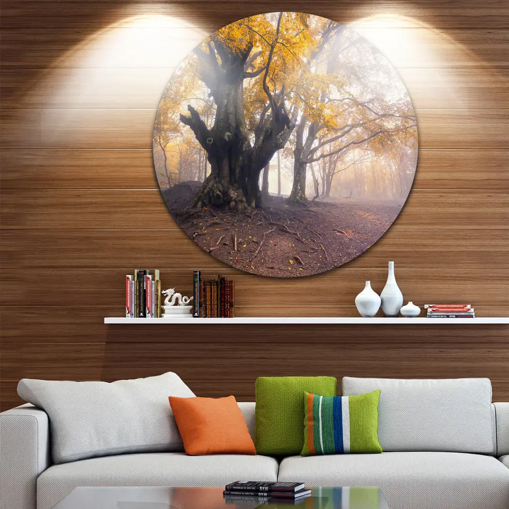 Bring Contemporary Abstraction to your home with this large Circle Metal wall art. This Dark Tree with Yellow Leaves Metal Artwork makes it the focal point of any room or office. - White Gloss Coating ensures colors are extra vibrant with light reflection.- Aluminum grade Sheet Metal with 1 inch mounting frame on the back giving the illusion that the artwork is floating on the wall..- Mounting Brackets are included along with instructions.- High Quality Digital images are created directly into a glossy aluminum panel producing a stunning and captivating print into the glossy finish of the metal.- Water, Fire and Scratch resistant HD Aluminum panels.- Looks better than any photo paper and guaranteed to last at least 20 years- Easy to clean with a microfiber cloth. Colors are far superior to regular Canvas Art. - Easy to Hang