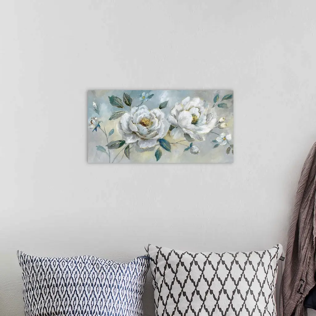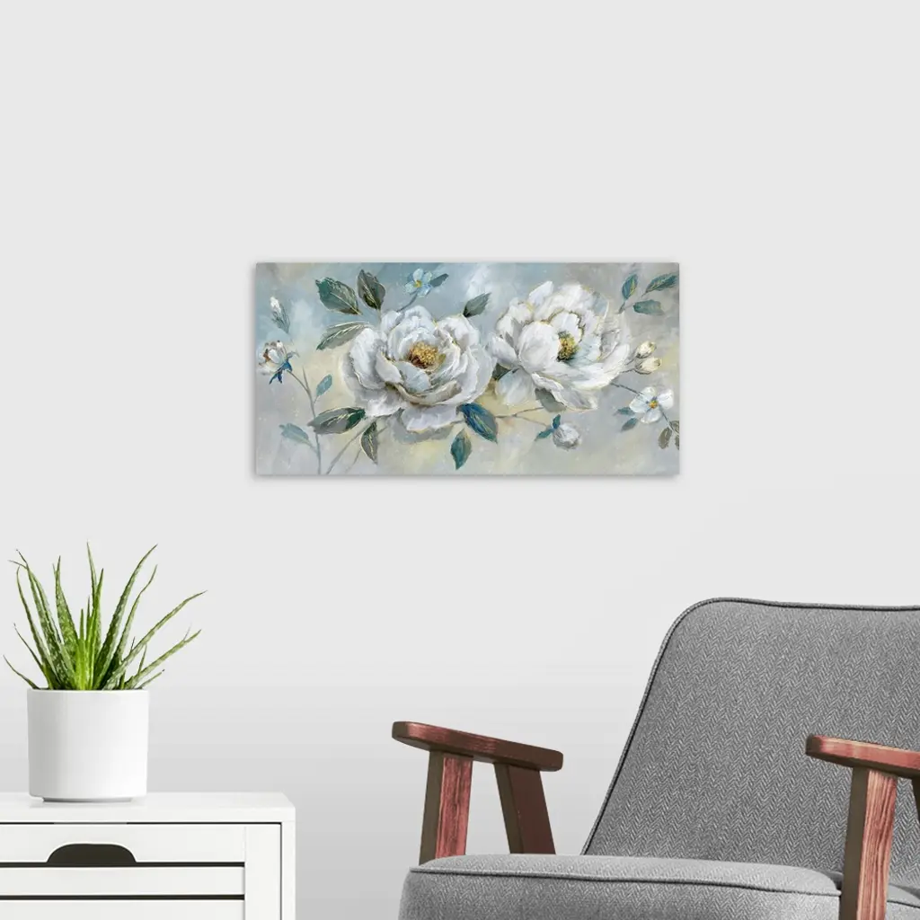 Large horizontal painting of white flowers with gold outlines on a blue, yellow, and gray background.