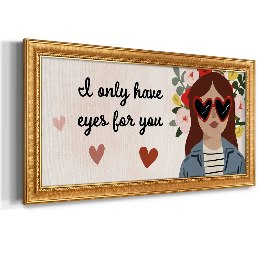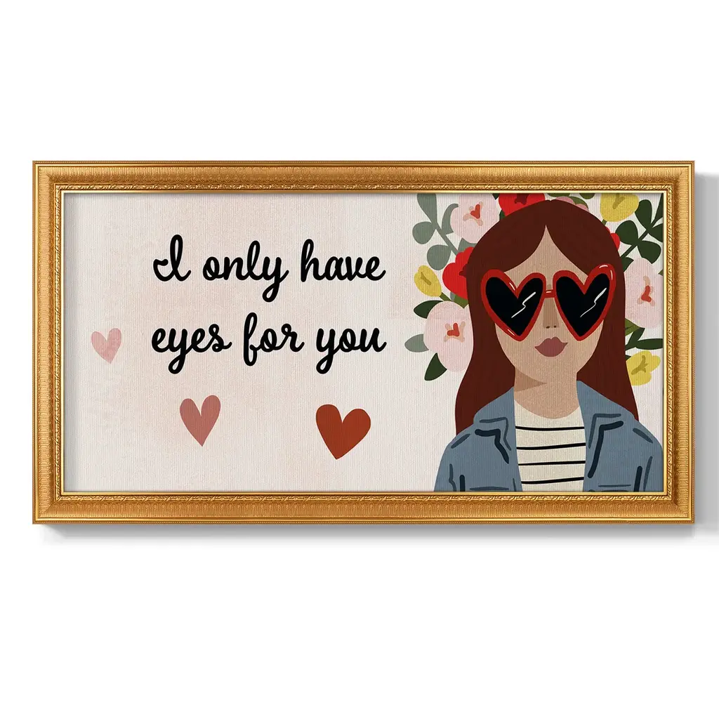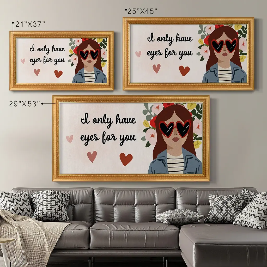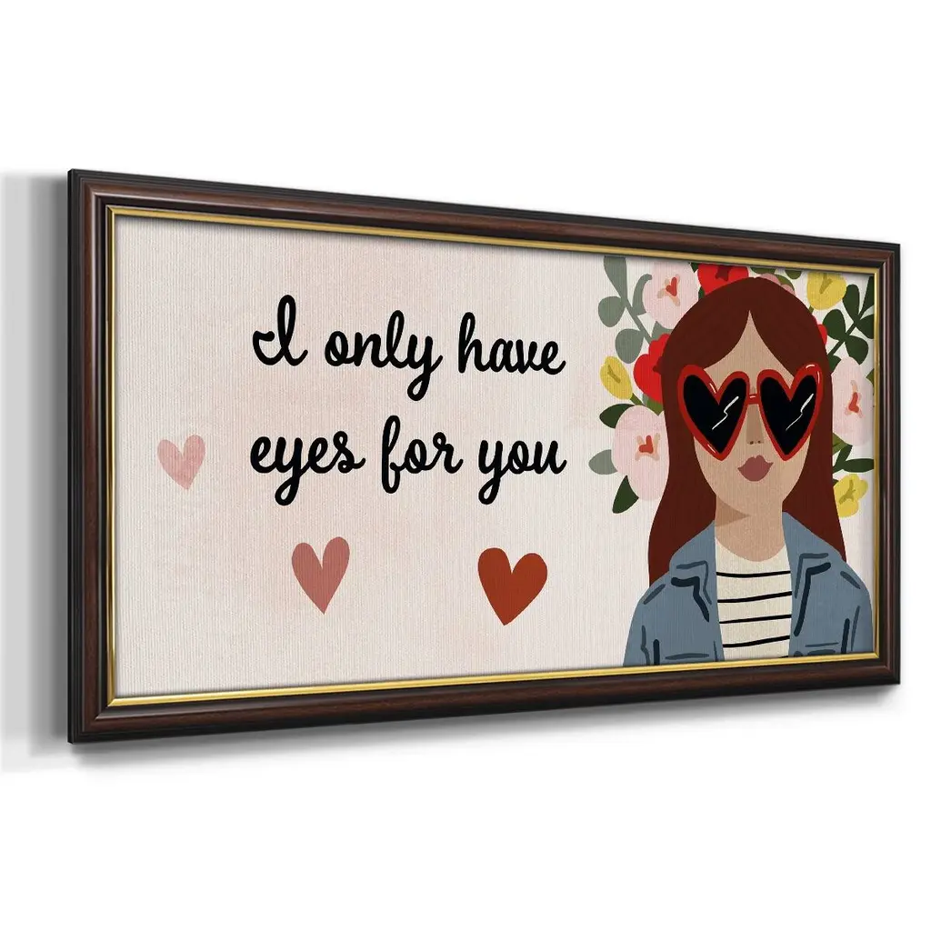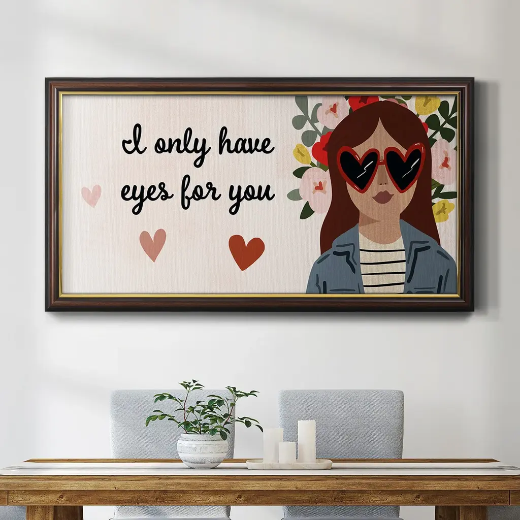 Darling Valentine Collection D Premium Framed Canvas- Ready to Hang A Premium Framed Canvas created to last. Framed in distressed wood and available in an array of sizes and colors Featuring a beveled a solid wood stretcher bar, each piece comes ready to hand 3 SIZES AVAILABLE 21''X37'' - Overall Size 25''X45'' - Overall Size 29''x53'' - Overall Size Each piece is made to order. Each piece comes with hanging hardware. Made in the USA Ready to Hang Giclee Paper Print Acrylic Glass Beveled Matt Board