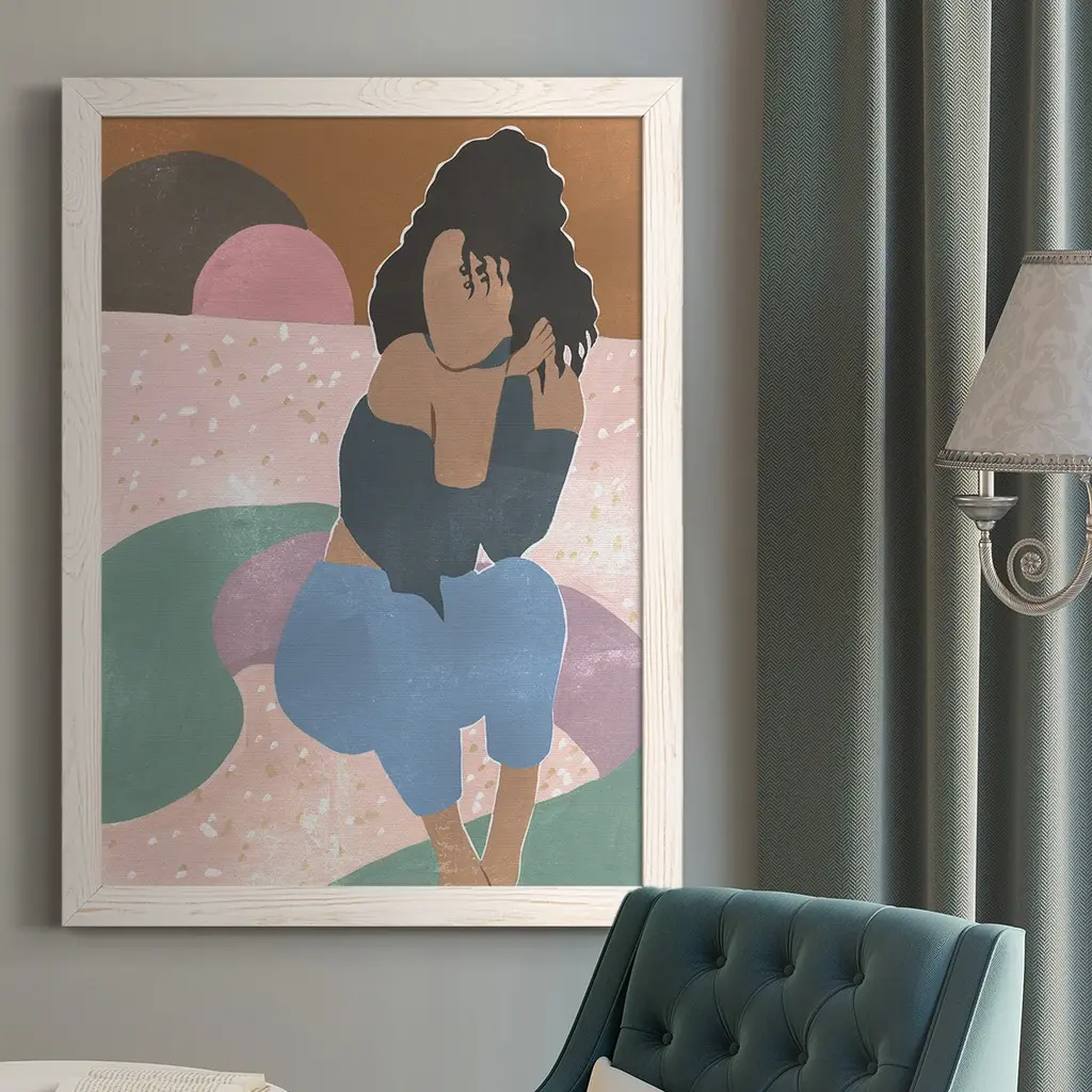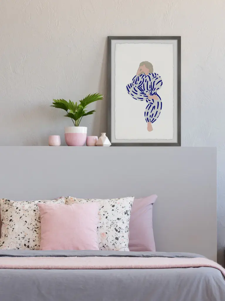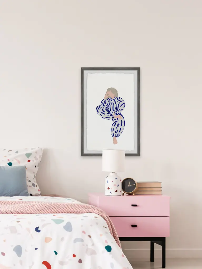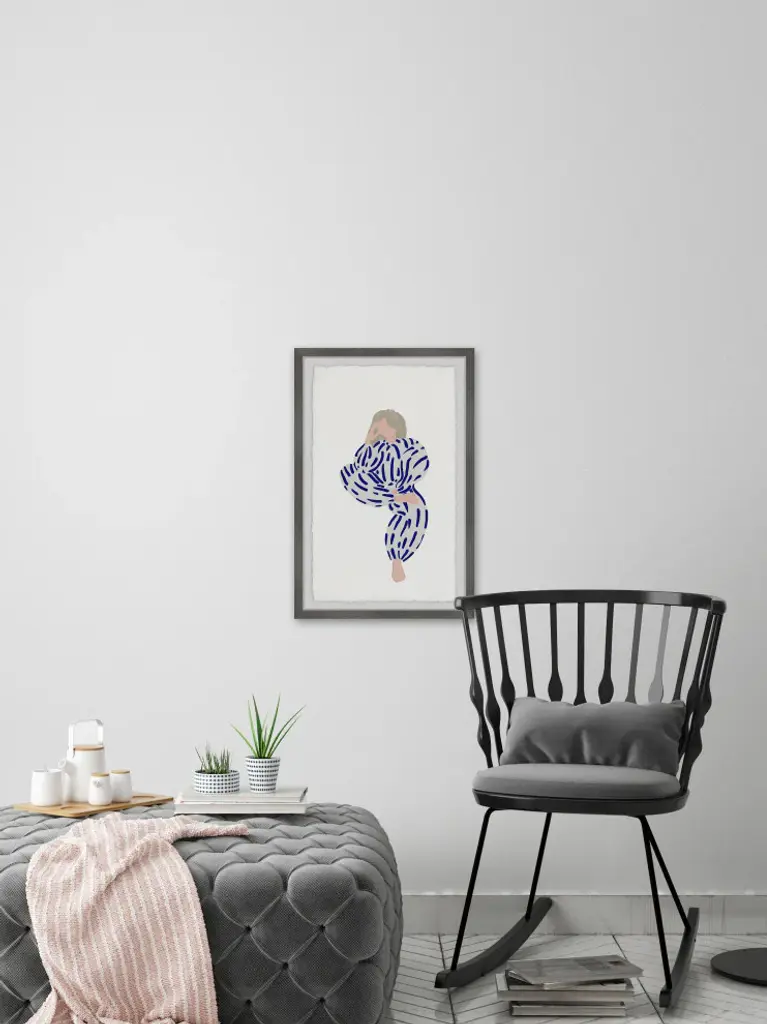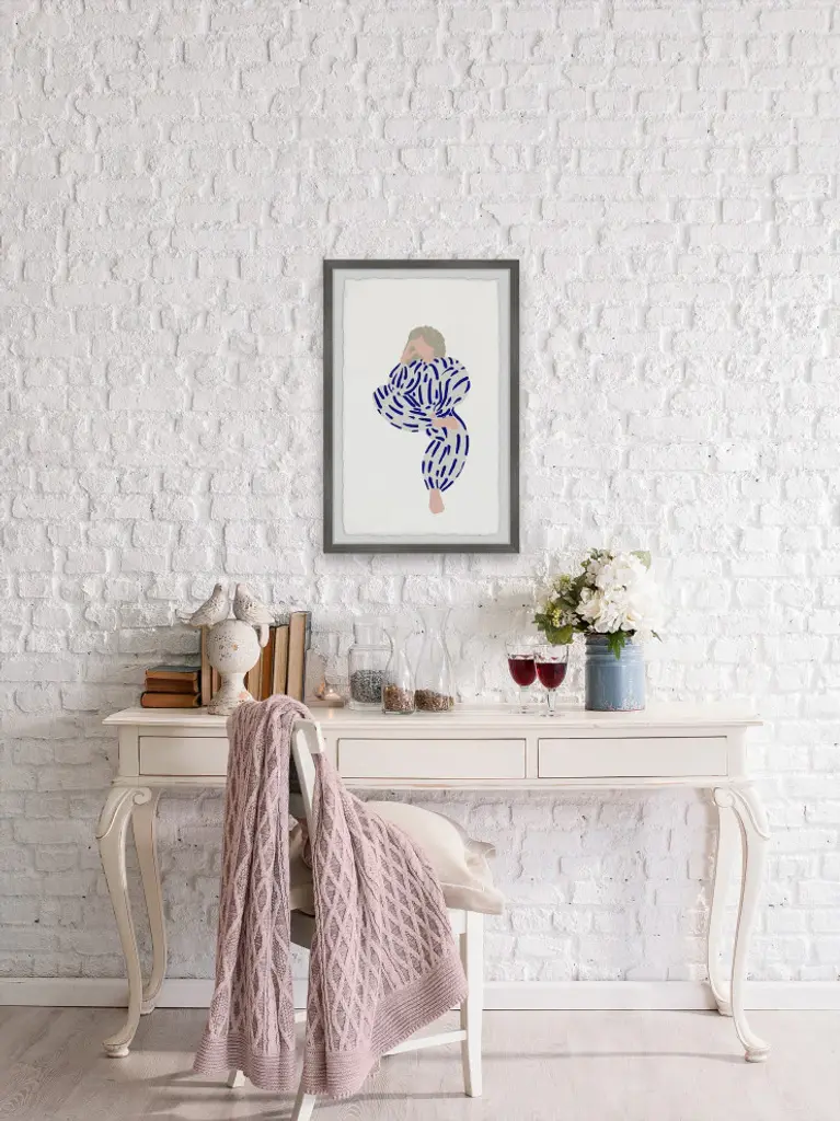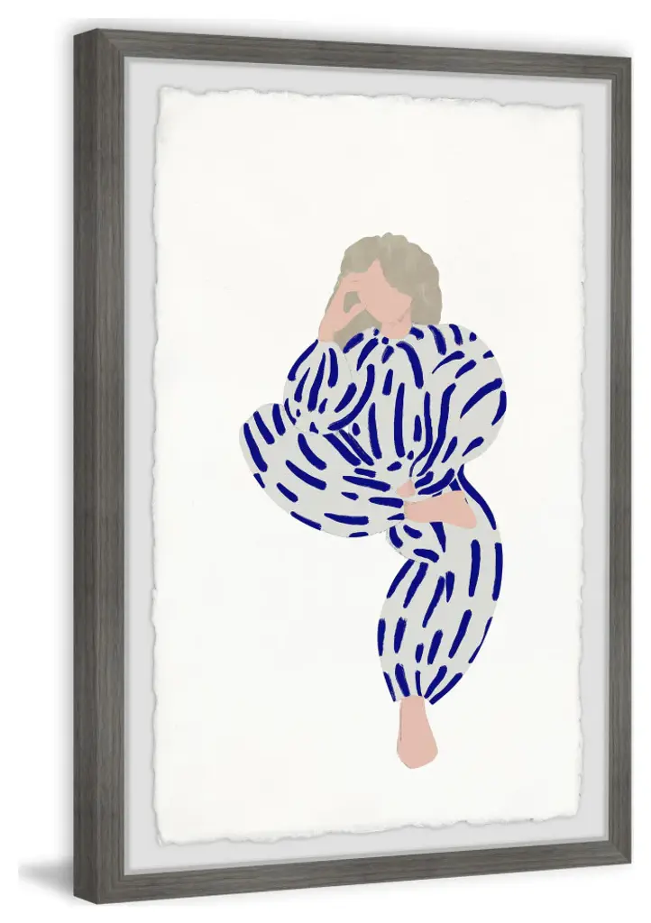 Make your space more eclectic with this drawing print that features a woman lounging in a patterned blue and grey outfit. Proudly printed in the USA, this piece is printed on high quality archive paper and professionally hand-framed. With wall-mounting hooks included, this artful accent is ready to hang up as soon as it reaches your front door.- Top quality Giclee print on high resolution Archive Paper- Hand cut deckled edges- High quality durable non-warping frame- Finished under shatter resistant plexiglass- Arrives ready to hang- Includes a certificate of authenticity- Printed in the USA