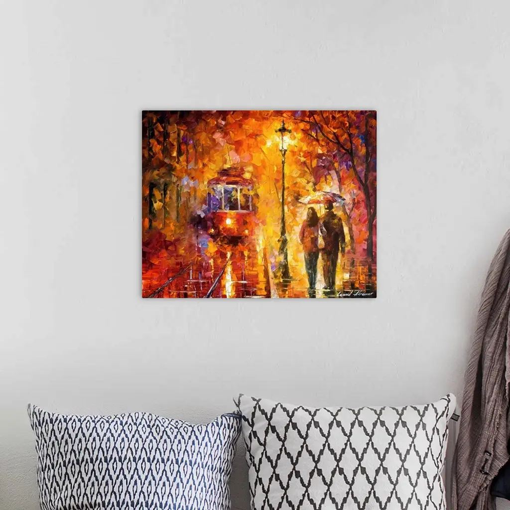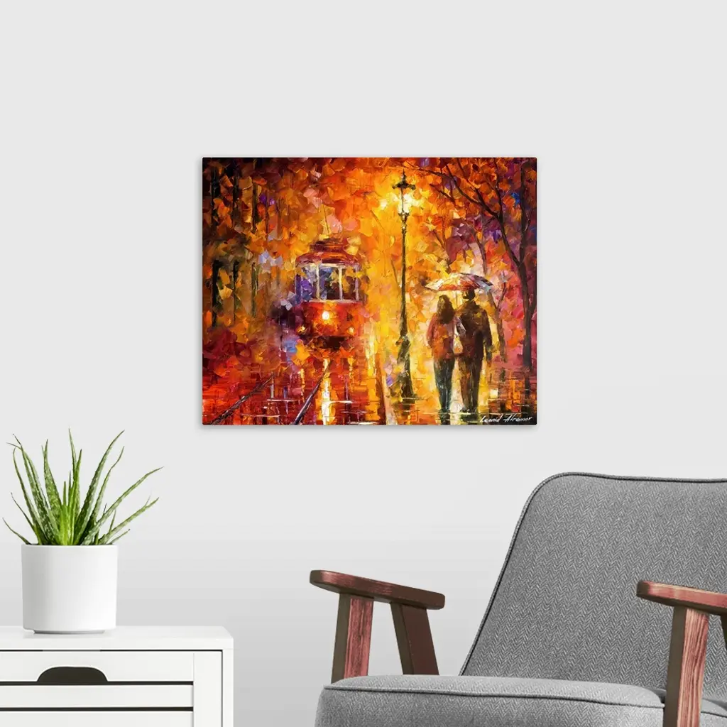 Contemporary colorful painting of a couple sharing an umbrella walking down a sidewalk in the rain.