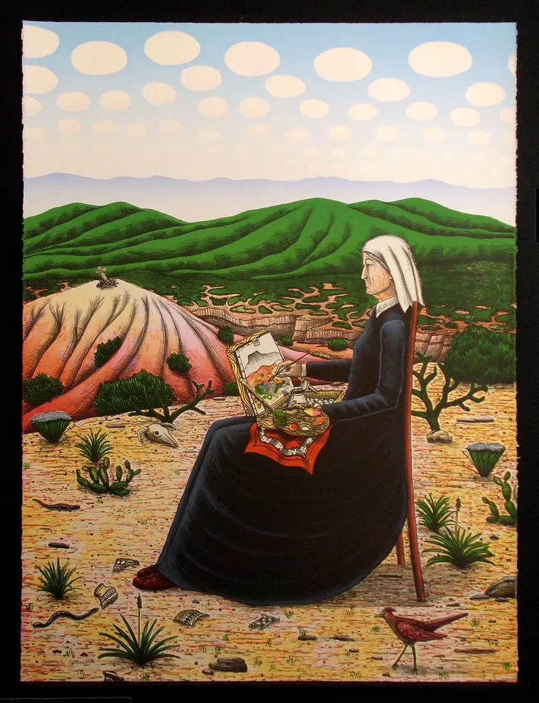 Signed lithograph print, unframed by David Bradley depicting Georgia O'Keefe sketching in the desert. Edition size of 100. Comes with certificate of authenticity. Circa 1980s. Make an offer! DAVID BRADLEY David Bradley was born in 1954. He attended several educational institutions including the University of Arizona, Tucson, Arizona, the Institute of American Indian Arts, Santa Fe, New Mexico, and the College of St. Thomas, St. Paul, Minnesota. Some of his one-man exhibitions include: 1981-84, Elaine Horwitch Gallery, Santa Fe, New Mexico; 1982, Guest Artist Seminar and Show, Bemidji State University, Bemidji, Minnesota; 1980, Judith Stern Gallery, Minneapolis, Minnesota; 1980, institute of American Indian Arts, Santa Fe, New Mexico; 1979, "Sculpture and Painting," IAIA, Santa Fe, New Mexico. Some selected group exhibitions include: "Contemporary Native American Art," Museum of Fine Arts, Santa Fe, New Mexico; Innovations: "New Expressions in Native American Painting," National Invitational Exhibit, Heard Museum, Phoenix, Arizona; "Visions of the Earth," Native American Rights Fund Benefit, Boulder, Colorado; Mel Pfaelzer Collection of Northern Illinois University at the Lobby Gallery, Illinois Bell Company, Chicago, Illinois; 2nd Annual Invitational "Wild West Show," Alberta College of Art Gallery, Calgary, Alberta, Canada; "Eight Native Minnesota Artists," Minneapolis Institute of Art, Minneapolis, Minnesota; and "Nptive American Pictorial Traditions," Aspen Institute, Crestone, Colorado.