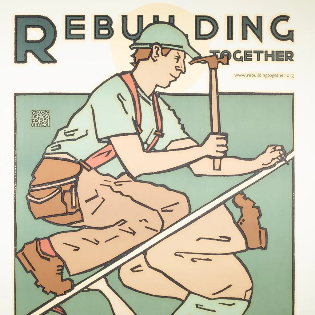 ABOUTAn original lithograph poster for the Rebuilding Together organization. Can be flipped over and hung two ways. Printed on thick archival paper. Artist stamp and date top left in two areas. Unsigned. Two available. CREATOR David Lance Goines (1945-2023). DATE OF MANUFACTURE c.2006. MATERIALS AND TECHNIQUES Archival Paper, Lithograph. CONDITION Good. Near mint condition. DIMENSIONS Sheet: H 24 in. W 16.5 in.HISTORYArtist and writer David Lance Goines was born May 29, 1945 in Grants Pass, Oregon. He attended the University of California at Berkeley as a Classics major, but in his second year was expelled as a consequence of his participation in the Free Speech Movement. Though later readmitted, he had by then lost his taste for higher education and in 1965 apprenticed with a Berkeley printer, becoming in the fullness of time a journeyman of that Art and Mystery. He is the author of five books, collaborated on three, and his work has been the subject of six others.His evocative posters helped define the aesthetic of Berkeley’s counterculture, beginning with his sensuous images for Chez Panisse, the artisanal French restaurant opened by Alice Waters, a former girlfriend.