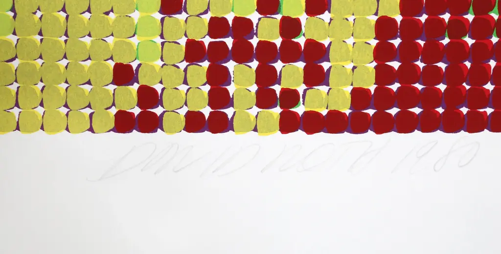 This screenprint was created by American artist David Roth. Roth's images are proportioned according to a strict mathematical formula - the pictures are composed according to horizontal and vertical divisions on the graph paper. The optical quality of color, deliberately sought, has its roots in the Bauhaus investigations of illusion, and thus has a direct relationship to the Op art produced in postwar Europe. This screenprint is signed and numbered in pencil, and comes from an edition of 150. It measures 29.5 x 29.5 inches and is in excellent condition.