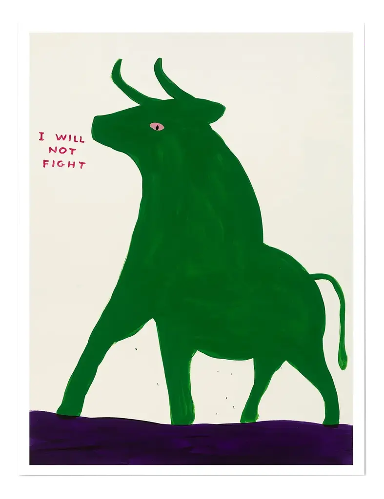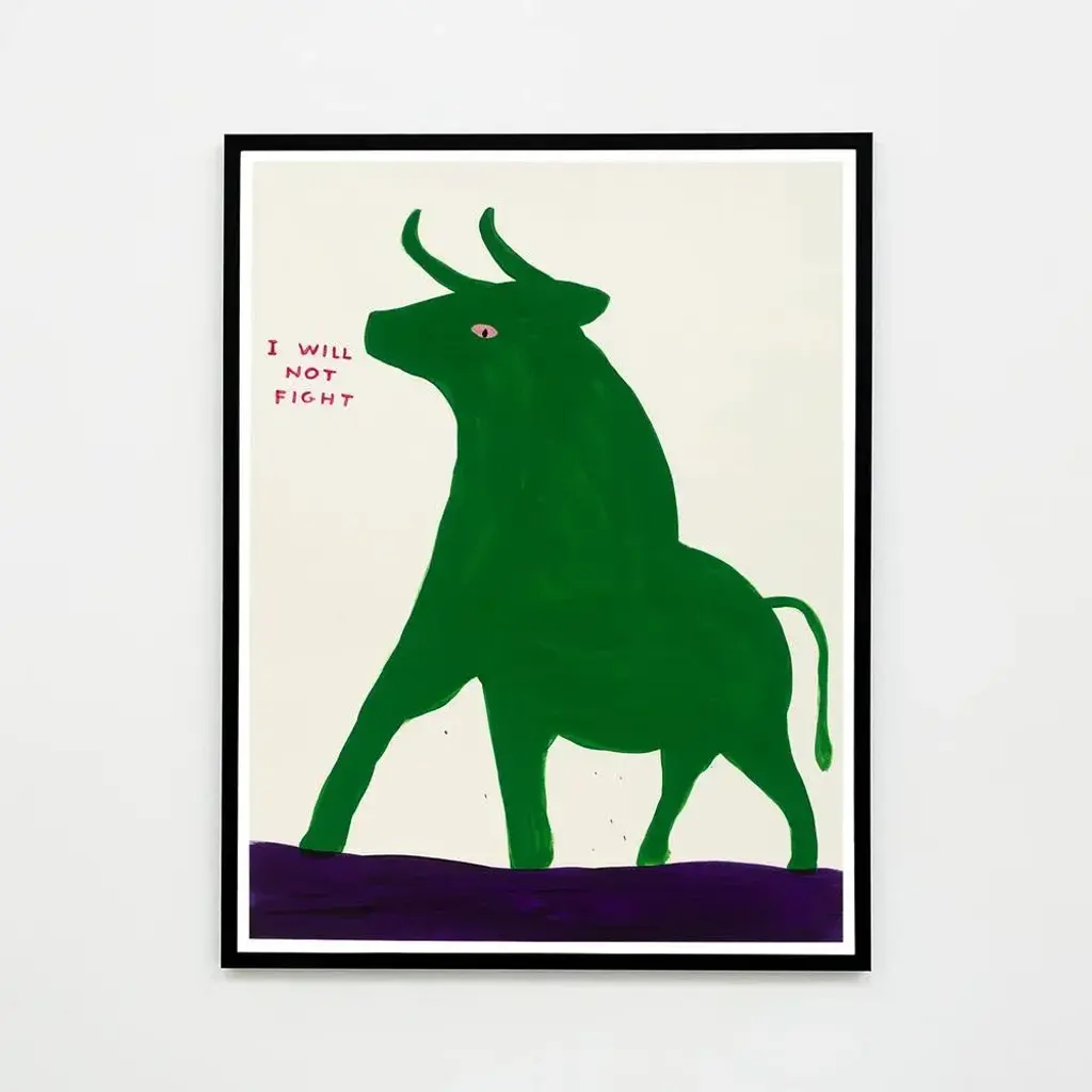 David shrigley, i will not fight, 2019 (framed) 64 x 84 cm (25.2 x 33.07 in) off-set lithography open edition printed on 200g munken lynx paper narayana press in denmark accompanied by a certificate of authenticity a forest green bull stands on navy blue ground. Red text above reads 'i will not fight' david shrigley, born in macclesfield in 1968, is a british artist based in brighton. Having graduated from the glasgow school of art in 1991, shrigley has since gained international recognition for his distinctive drawings, sculptures, and text-based works. Known for his dark humour and deliberately crude style, shrigley explores the absurdities of everyday life with wit and sharp social commentary. A 2013 turner prize nominee, his work has been exhibited globally.