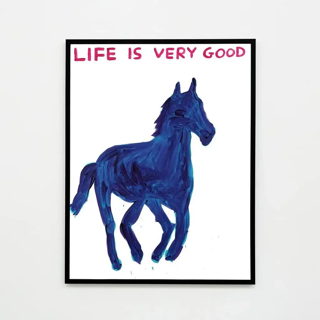 David Shrigley, Life Is Very Good, 2016 64 x 84 cm (25.2 x 33.07 in) Off-set lithography Open edition Printed on 200g Munken Lynx paper Narayana Press in Denmark Accompanied by a Certificate of Authenticity A naive image of a running blue horse. Above, red text reads 'Life is very good' David Shrigley, born in Macclesfield in 1968, is a British artist based in Brighton. Having graduated from the Glasgow School of Art in 1991, Shrigley has since gained international recognition for his distinctive drawings, sculptures, and text-based works. Known for his dark humour and deliberately crude style, Shrigley explores the absurdities of everyday life with wit and sharp social commentary. A 2013 Turner Prize nominee, his work has been exhibited globally.