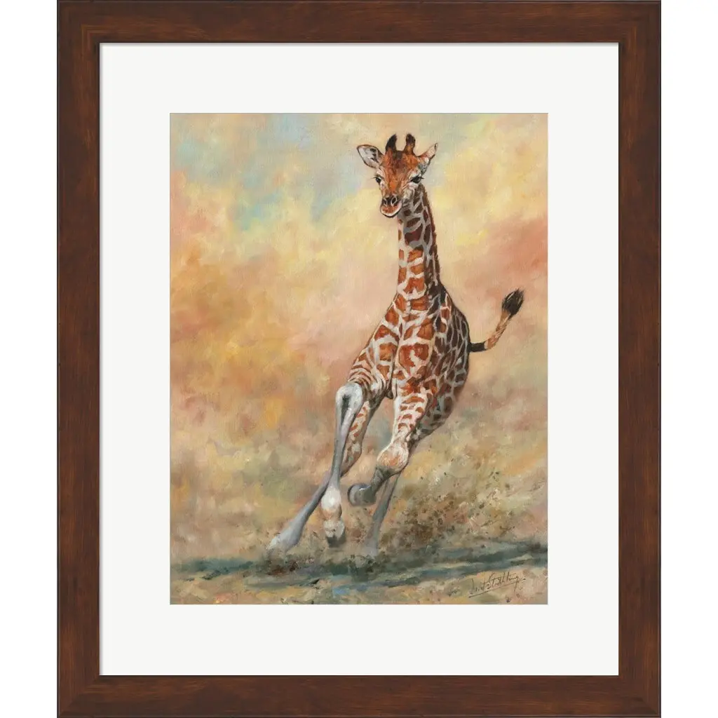 Young Giraffe Running by David Stribbling is a high quality piece of framed artwork. The finished size of this piece is 18.75" X 22.25". It has a Slim Solid Pecan Brown Flat with Satin Finish frame, is single matted and finished with high quality Acrylic Plexiglass. 100% Satisfaction Guaranteed.