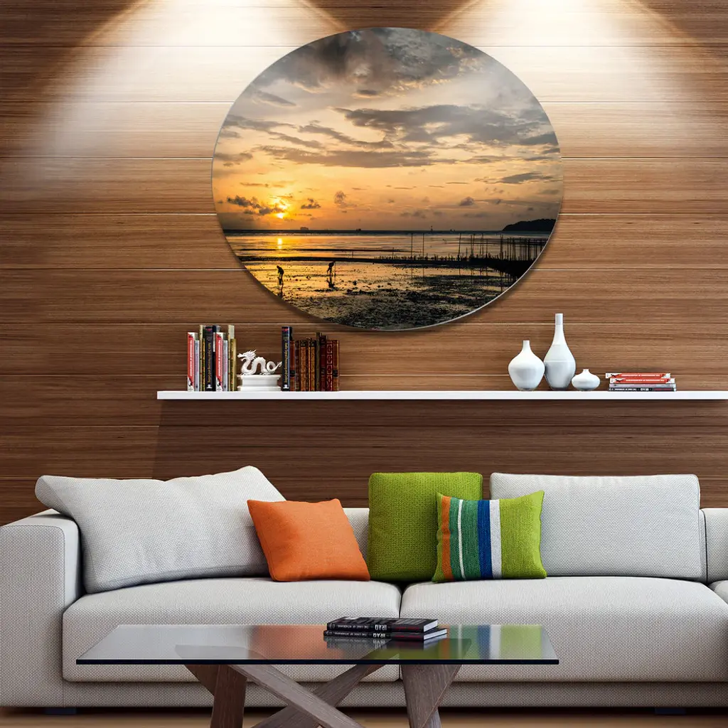 Bring Contemporary Abstraction to your home with this large Circle Metal wall art. This Dawn at Seaside during Low Tide Metal Artwork makes it the focal point of any room or office. - White Gloss Coating ensures colors are extra vibrant with light reflection.- Aluminum grade Sheet Metal with 1 inch mounting frame on the back giving the illusion that the artwork is floating on the wall..- Mounting Brackets are included along with instructions.- High Quality Digital images are created directly into a glossy aluminum panel producing a stunning and captivating print into the glossy finish of the metal.- Water, Fire and Scratch resistant HD Aluminum panels.- Looks better than any photo paper and guaranteed to last at least 20 years- Easy to clean with a microfiber cloth. Colors are far superior to regular Canvas Art. - Easy to Hang