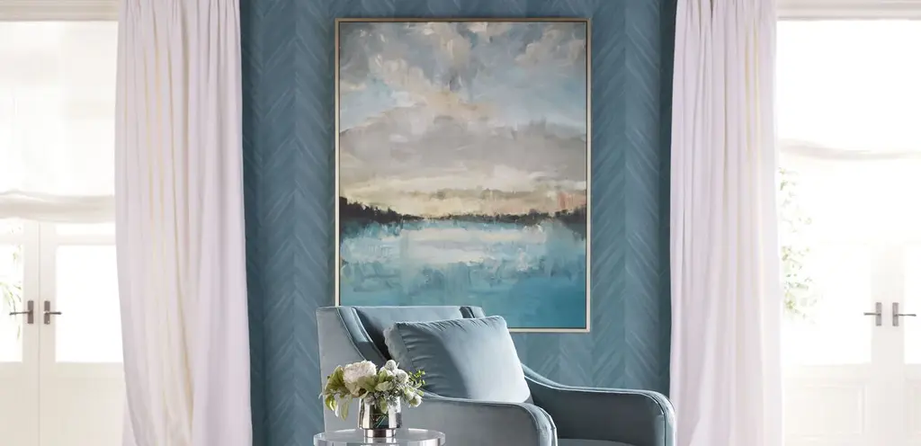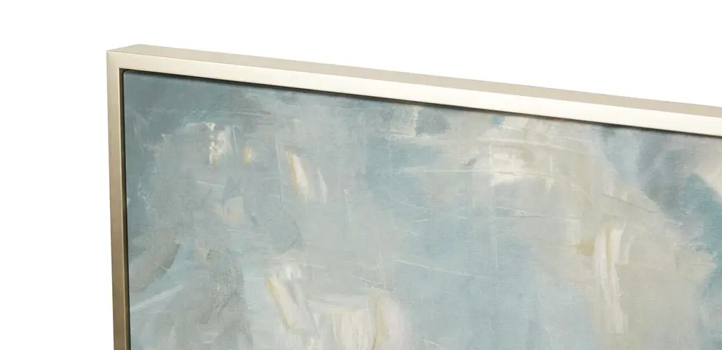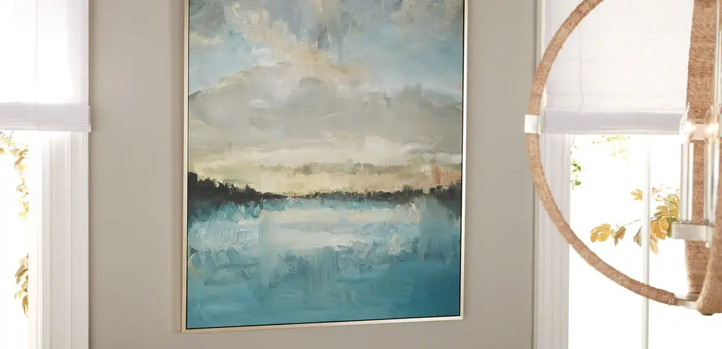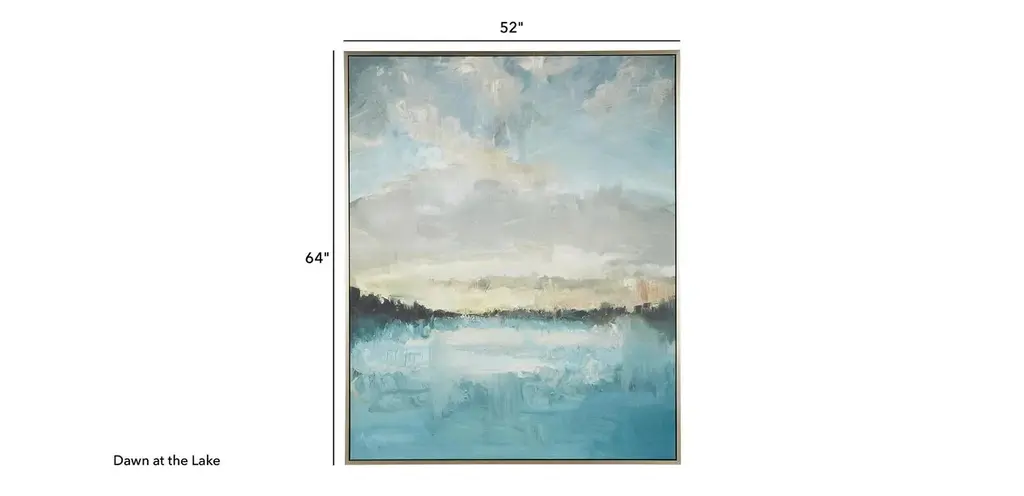 This interpretation of a lake nestled between serene mountains adds a sense of calm to formal or casual rooms. The artist's choice to contrast the water's cool hues with the sky's warm tones conveys nature's balance, while the mountains' dark shadows create a border between Earth and horizon.
