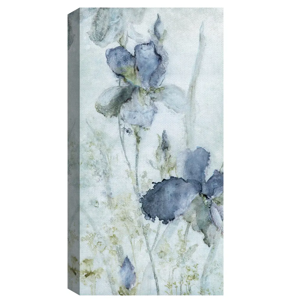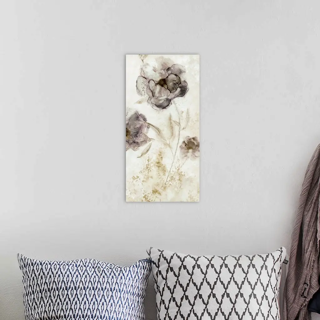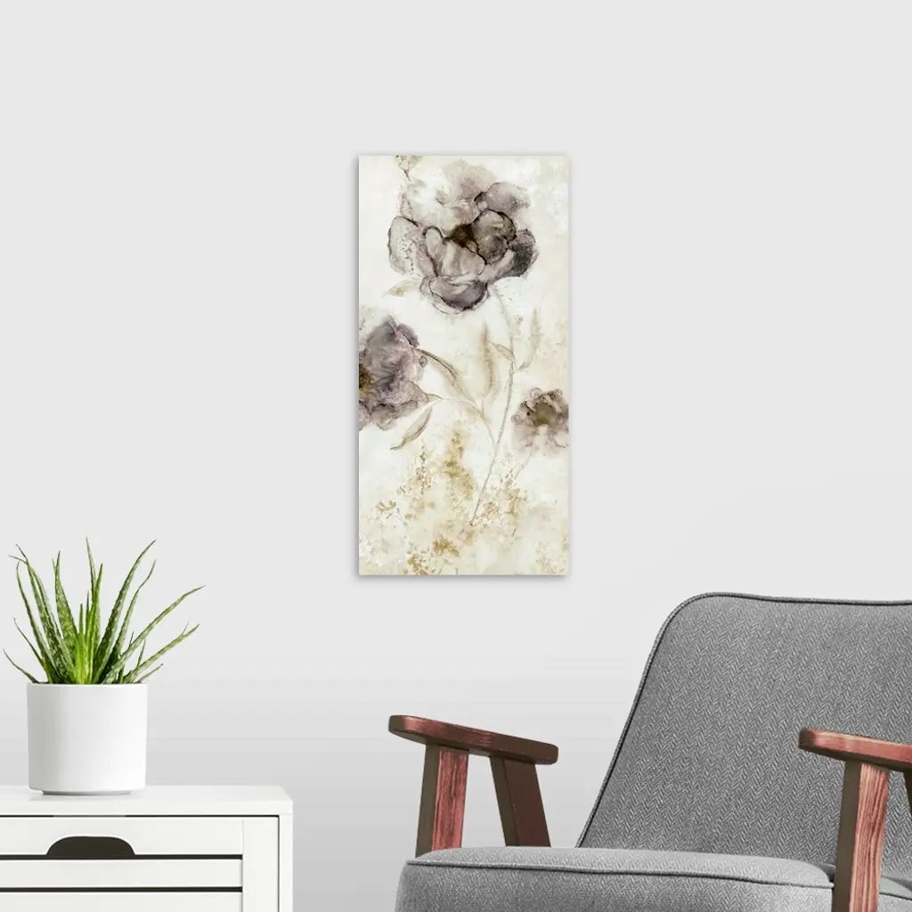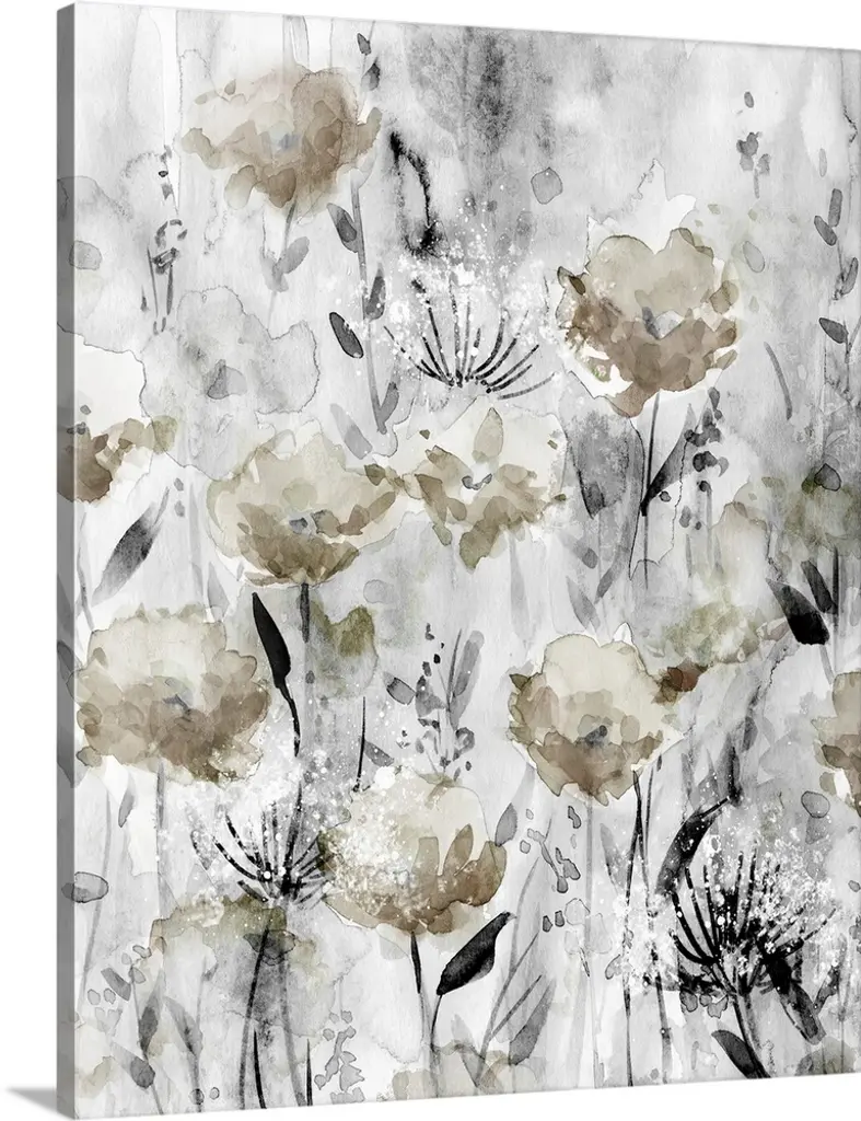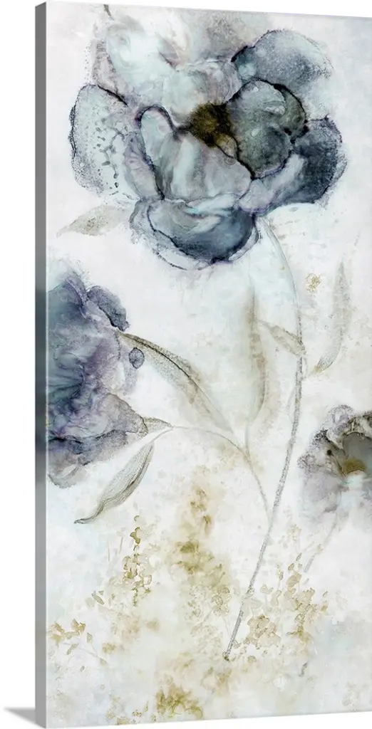 Droplets and splattered paint in subdued colors create this contemporary artwork of peony flowers.