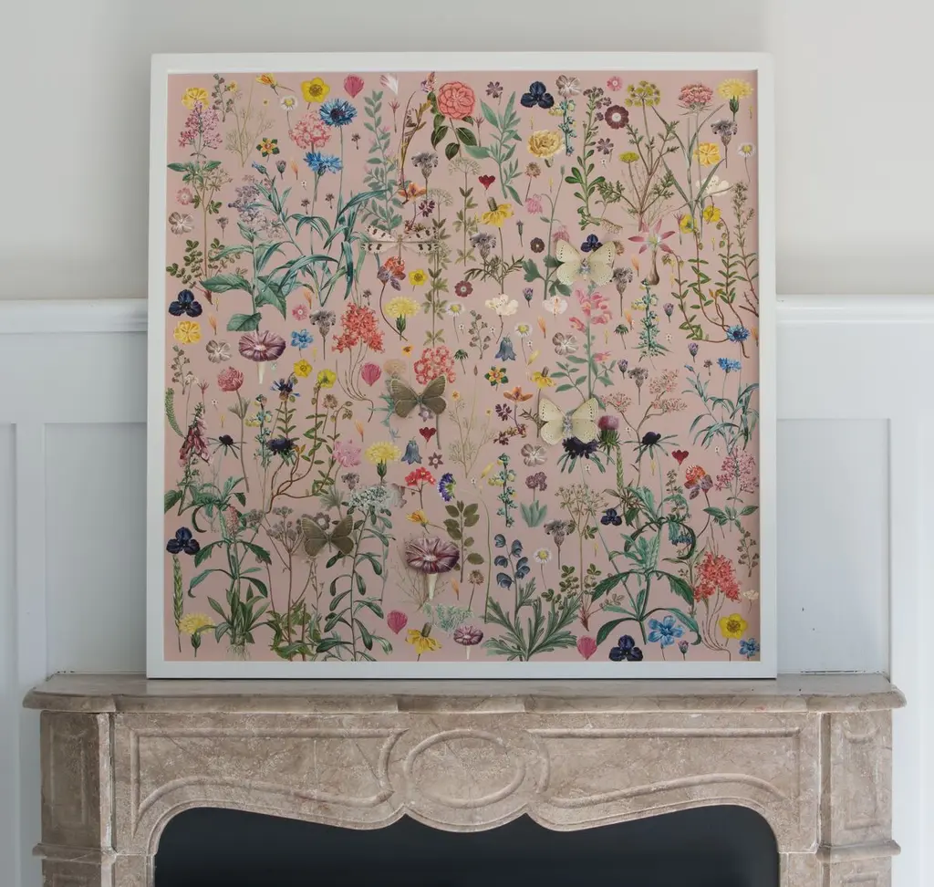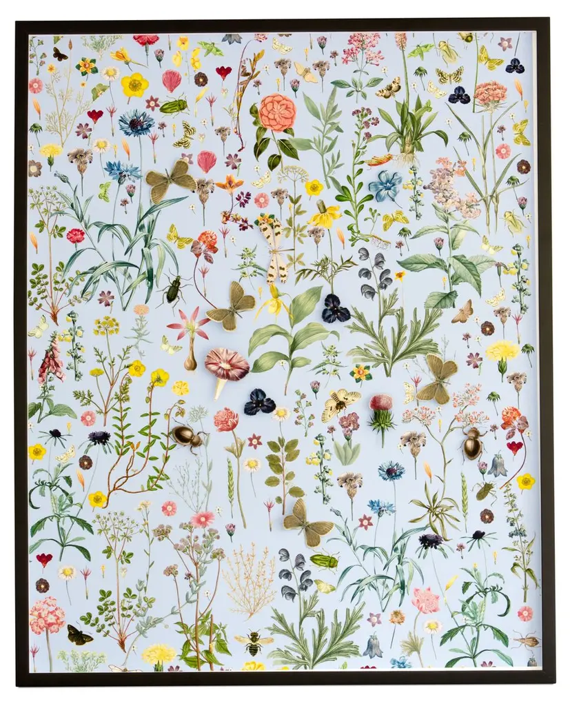 Seen first at One Kings Lane: This limited-edition work from Dawn Wolfe features an expressive montage of plants, flowers, and leaves embellished with impressively cut, three-dimensional paper butterflies and flowers that add contrast and depth. Signed, dated, and numbered by the artist, this piece is displayed under glass in a custom shadowbox frame and arrives ready to hang.