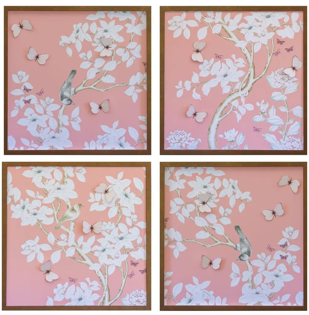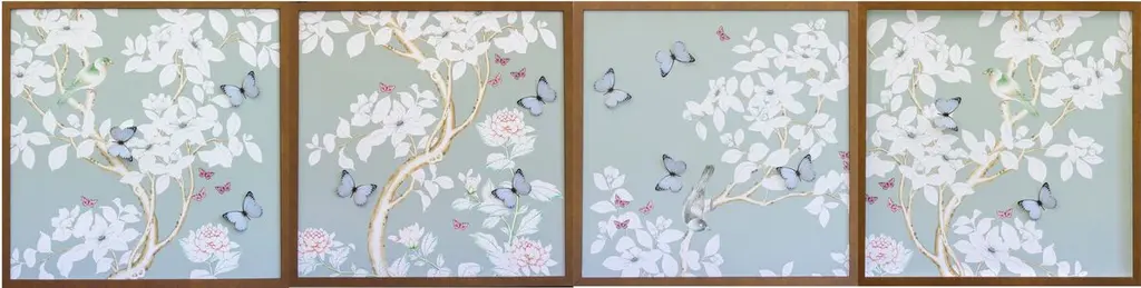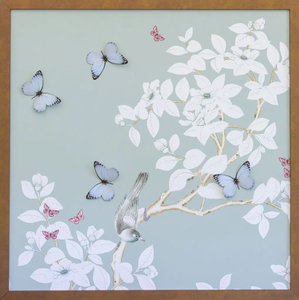 Seen first at One Kings Lane: This series from Dawn Wolfe features a chinoiserie-inspired pattern embellished with impressively cut, three-dimensional paper butterflies that add contrast and depth. Each piece is displayed under glass in a custom shadowbox frame and arrives ready to hang.