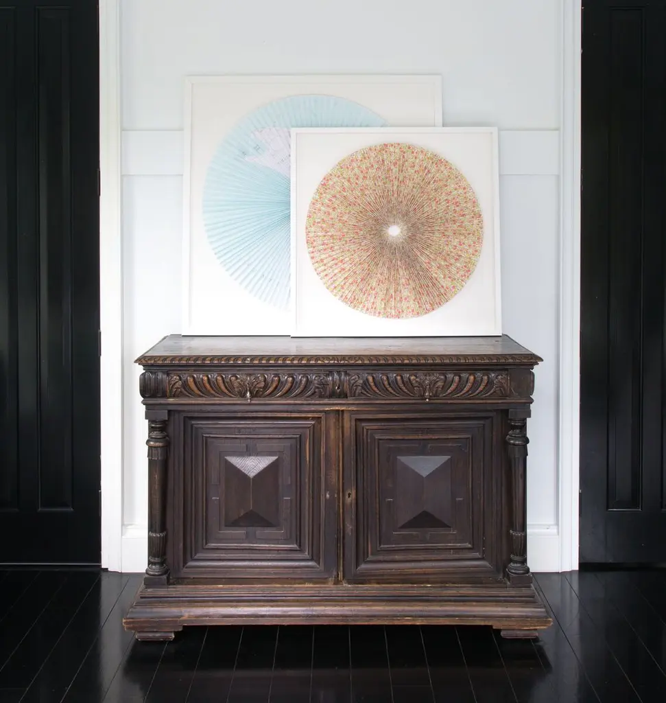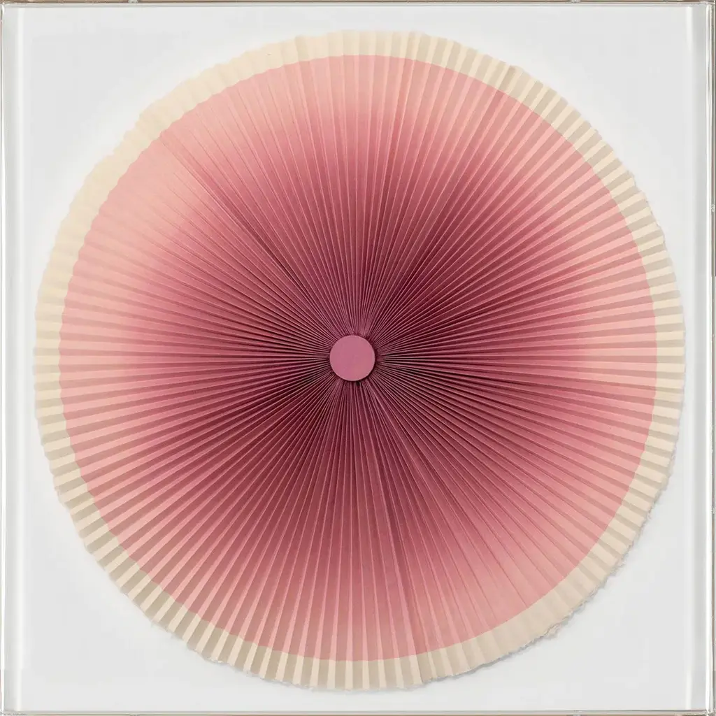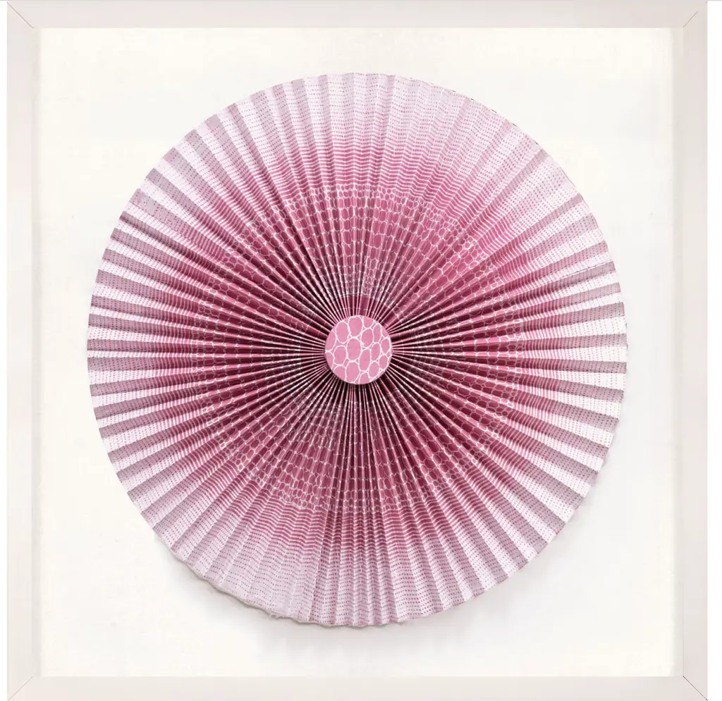 Seen first at One Kings Lane: In this limited-edition work from Dawn Wolfe, a large piece of paper with a printed floral pattern is meticulously hand-pleated into a fan-like circle and displayed in a custom shadowbox frame. Full of color and depth, this piece is signed, dated, and numbered by the artist. Arrives ready to hang.
