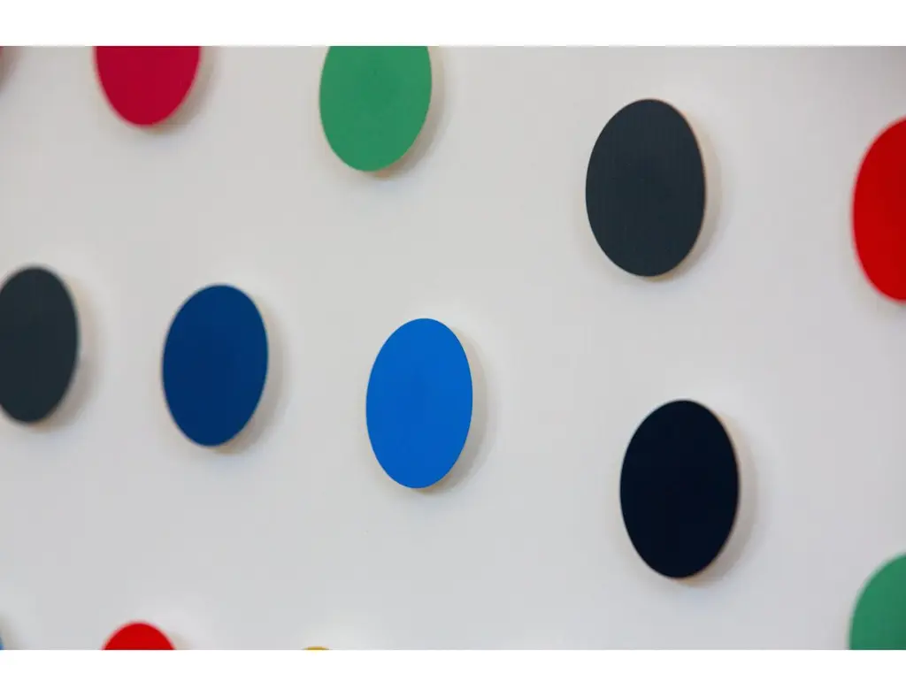 Seen first at One Kings Lane: In this limited-edition work from Dawn Wolfe, colorful paint chip circles are cut out, mounted on individual foam-core pieces, and assembled in a three-dimensional collage. Full of color and depth, this piece is signed, dated, and numbered by the artist and arrives ready to hang in a custom shadowbox frame.