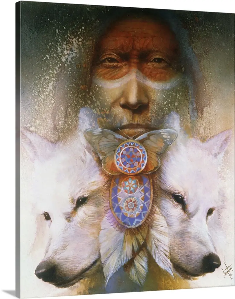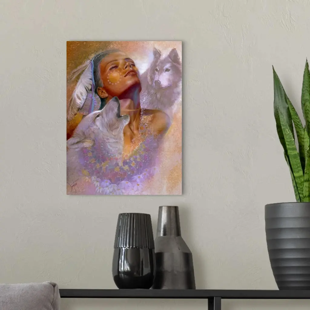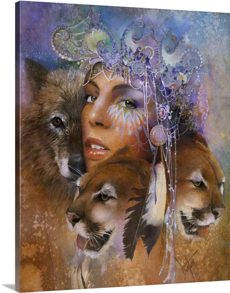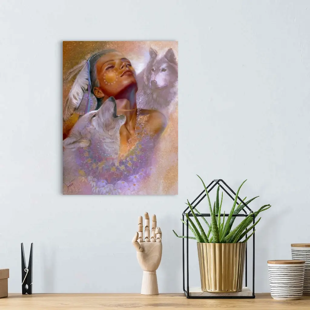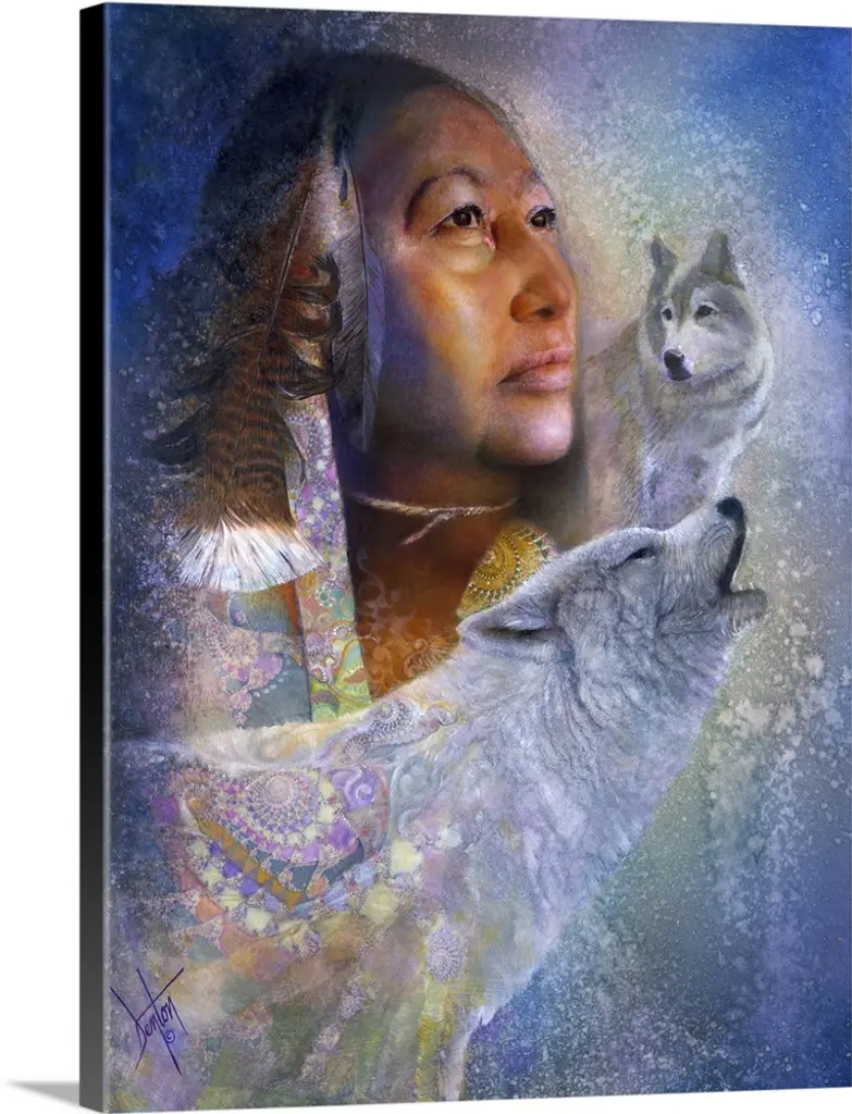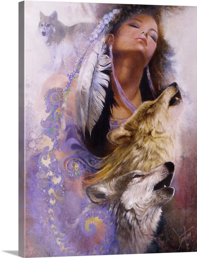 A contemporary painting of a Native American woman with her head and surrounded by wolf portraits.