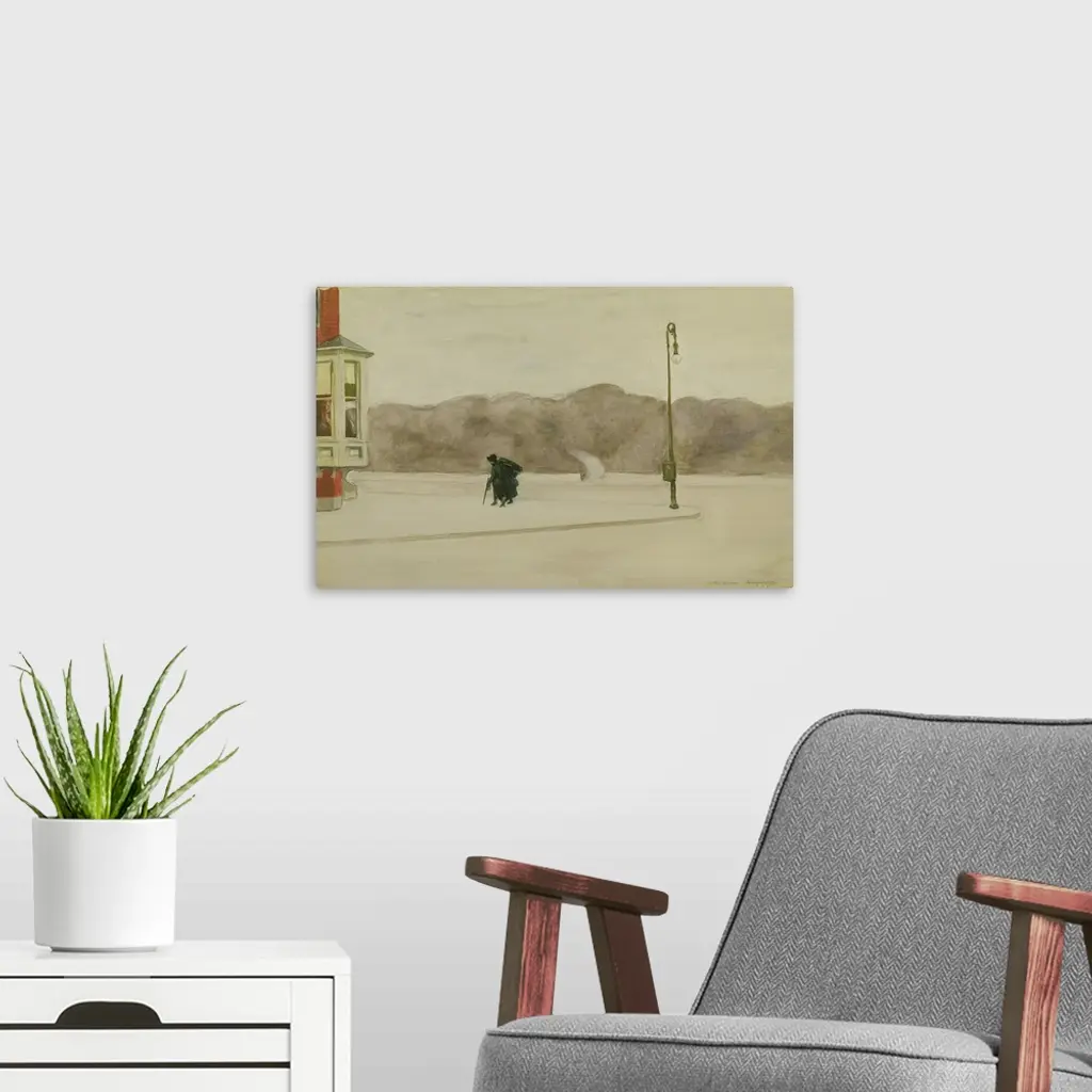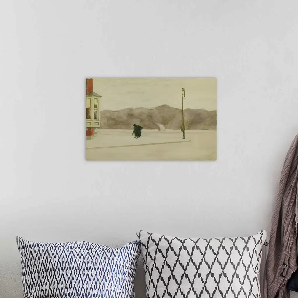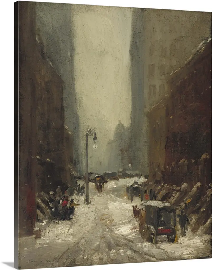 Painting of a woman in black walking along the side of the street mourning after a funeral.