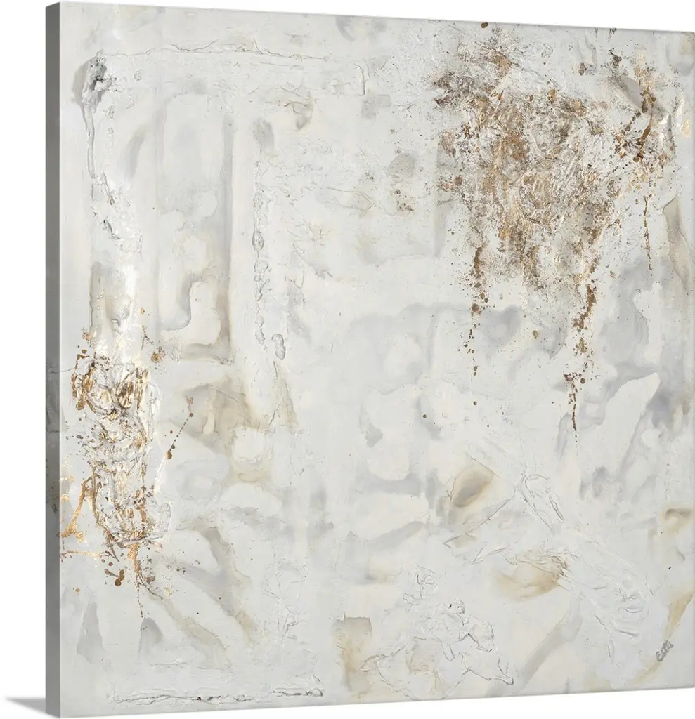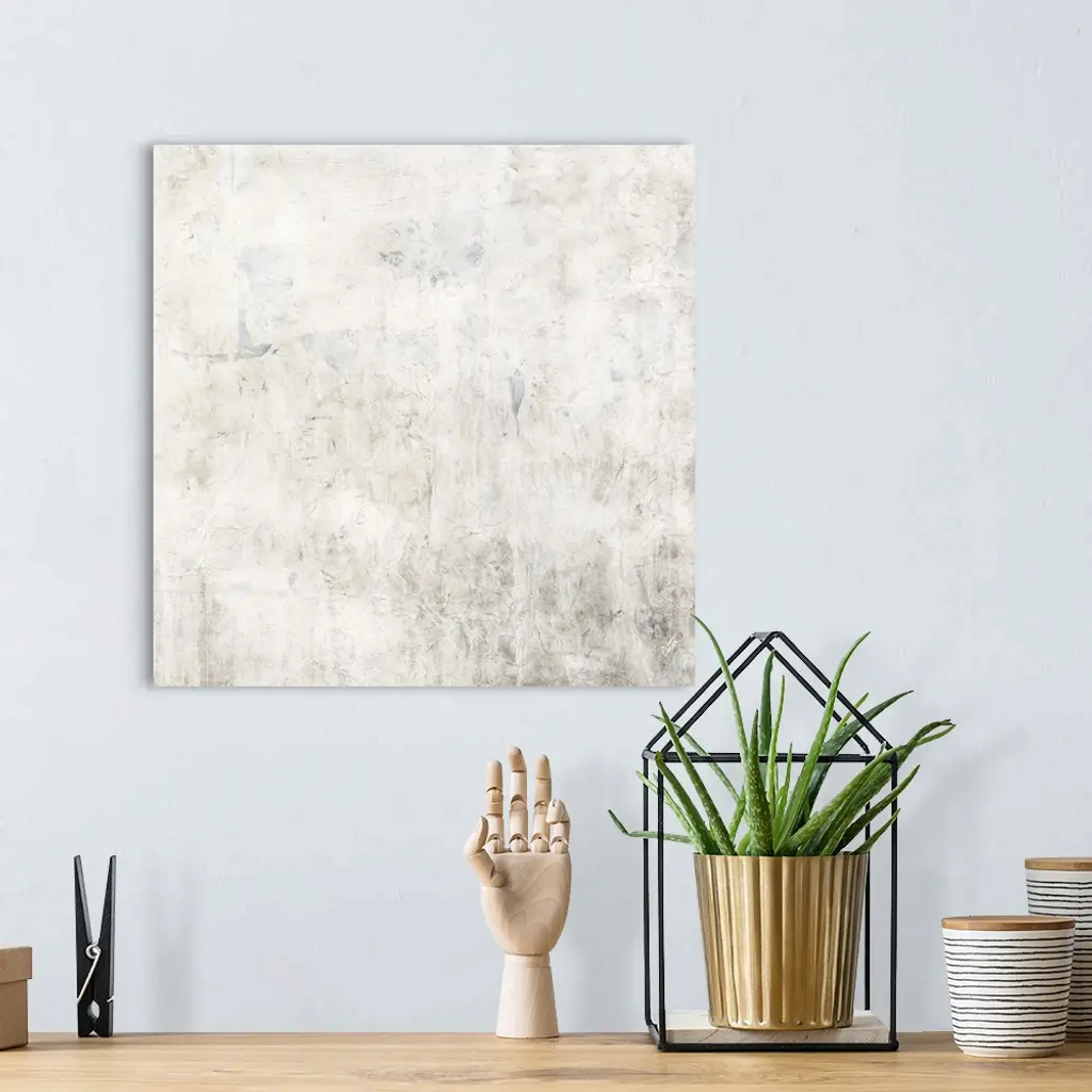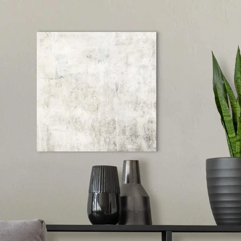 Abstract painting of textured paint in light shades of white, tan and gray.