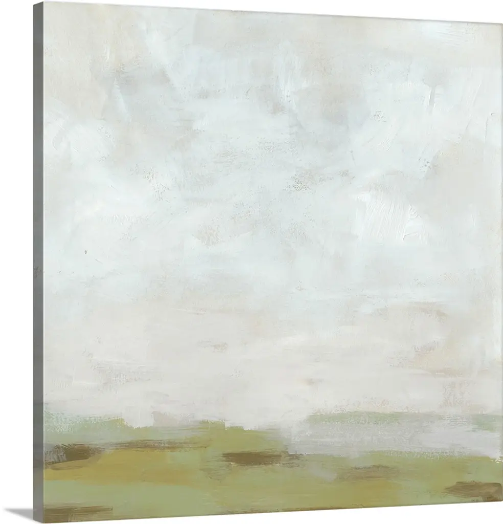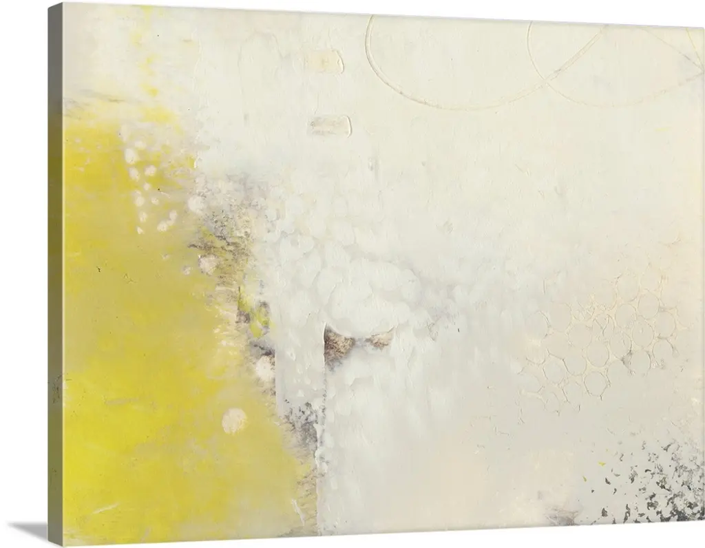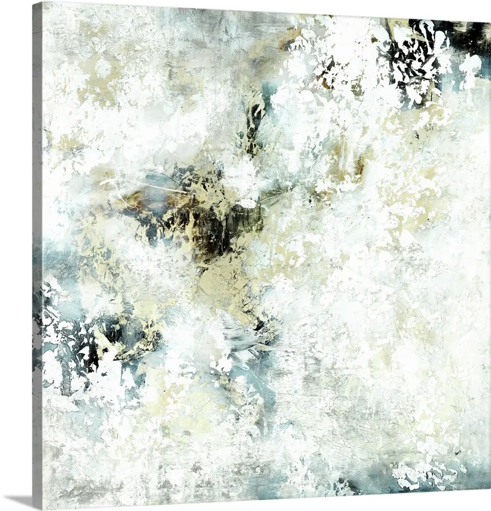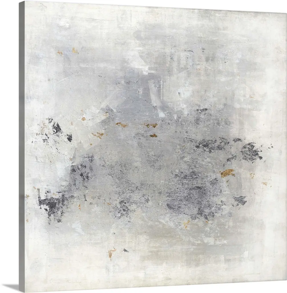 Abstract painting of textured paint in light shades of white, tan and gray.