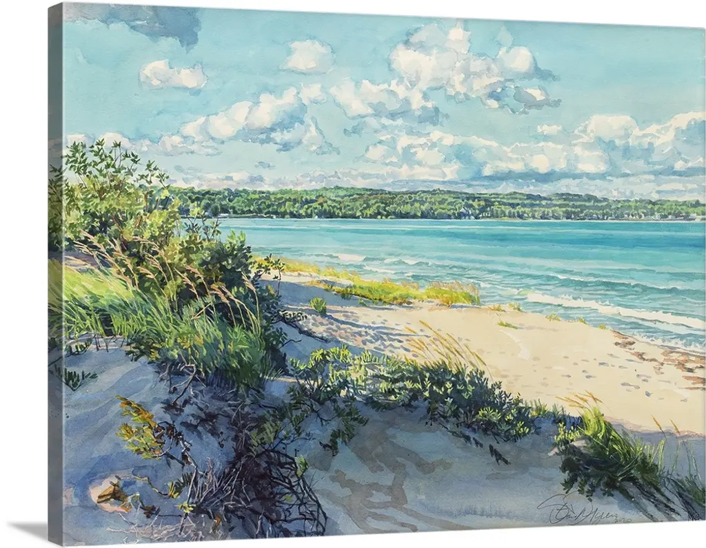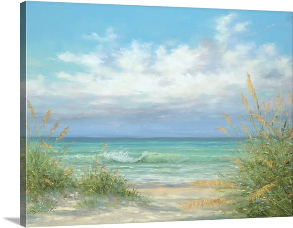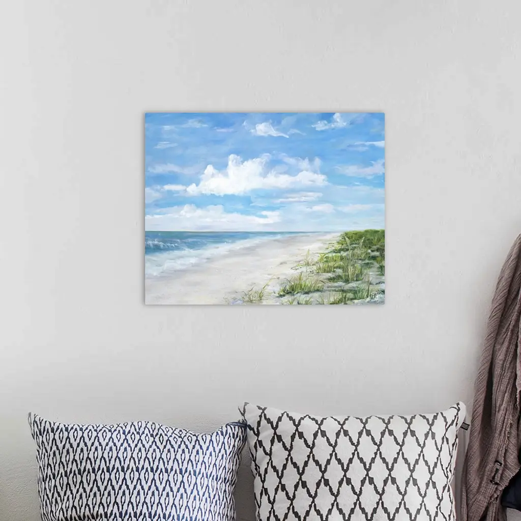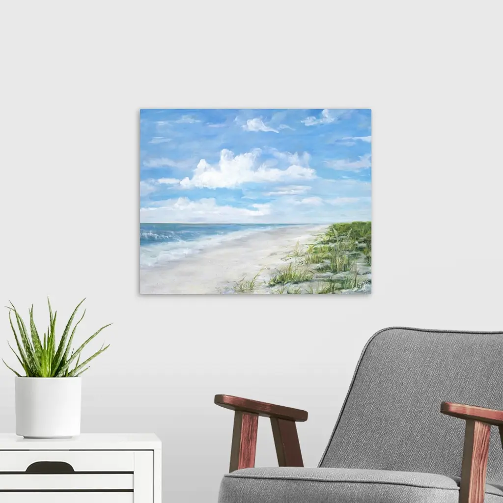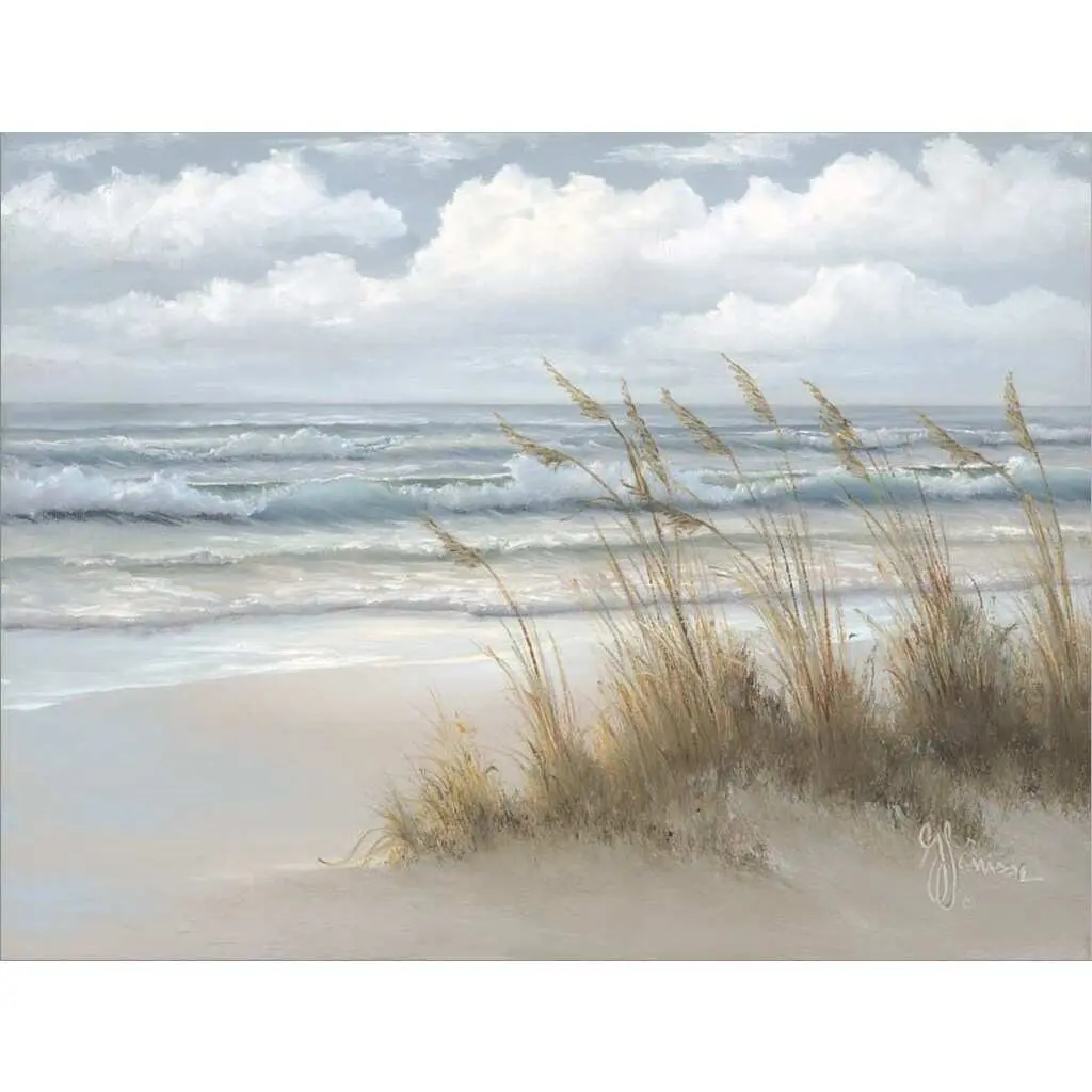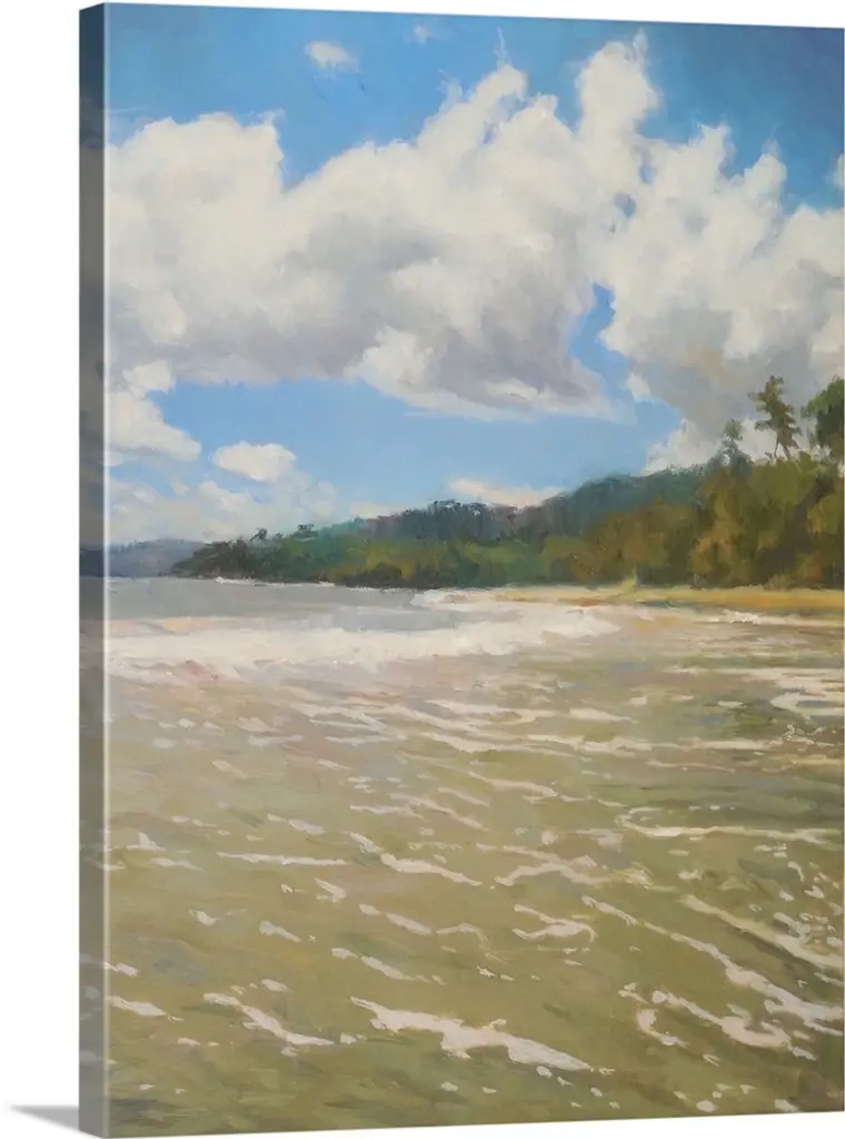 Contemporary painting of a sandy beach with ocean waves crashing on shore.
