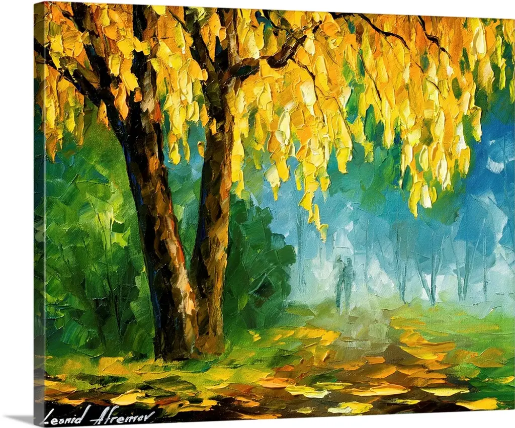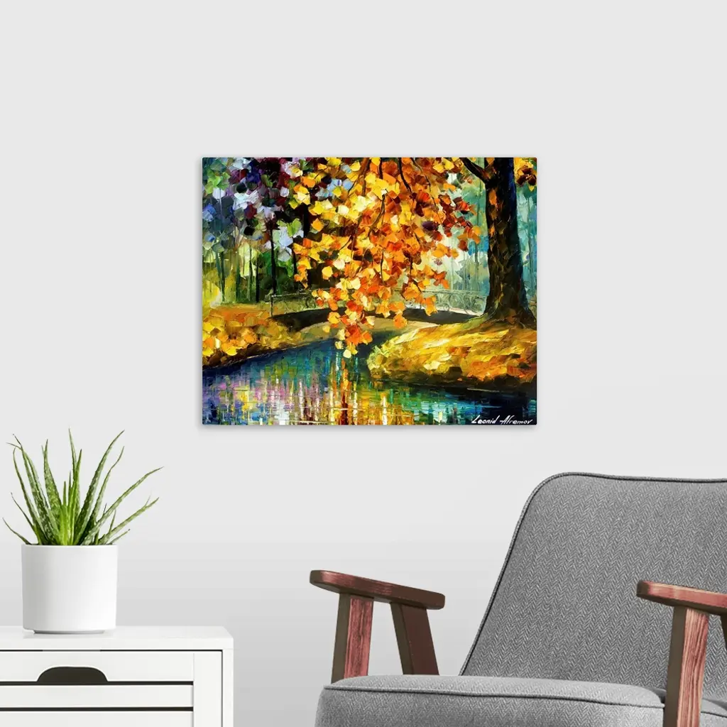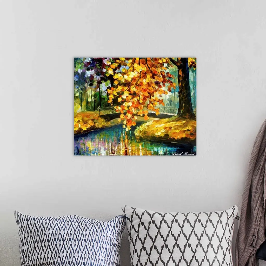 Contemporary colorful painting of a branch from a tree with autumn foliage hanging over a small river.