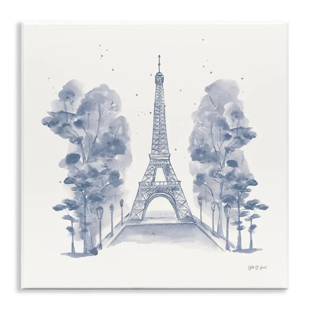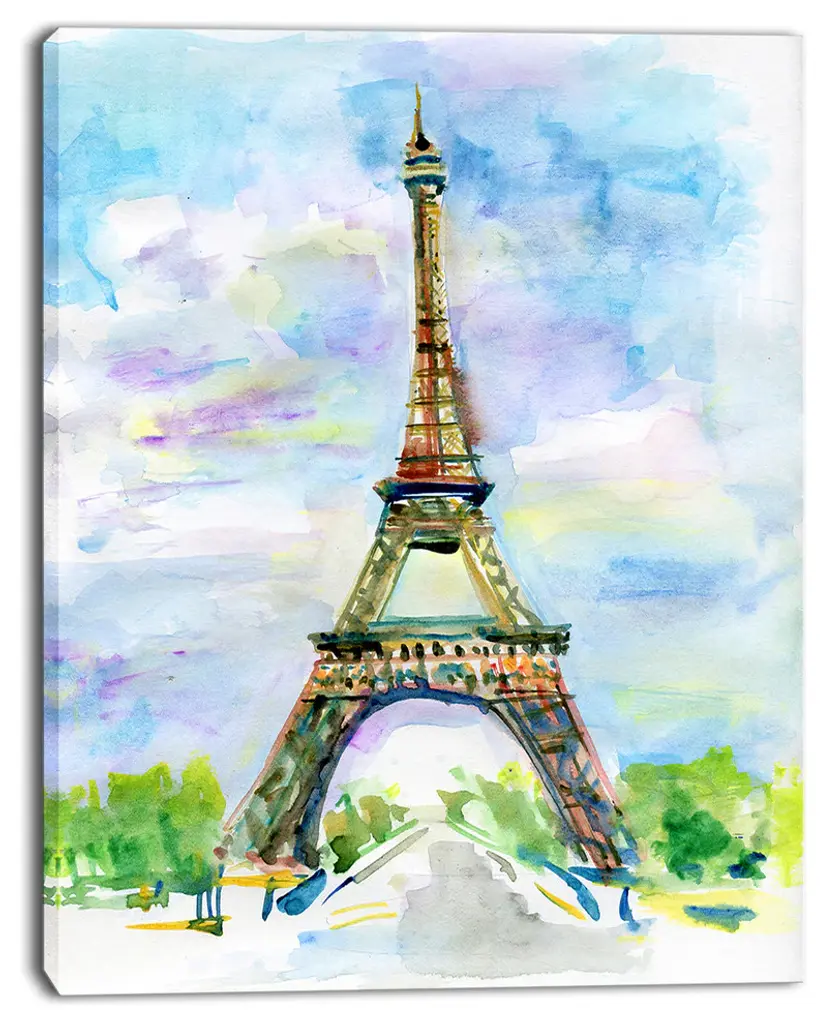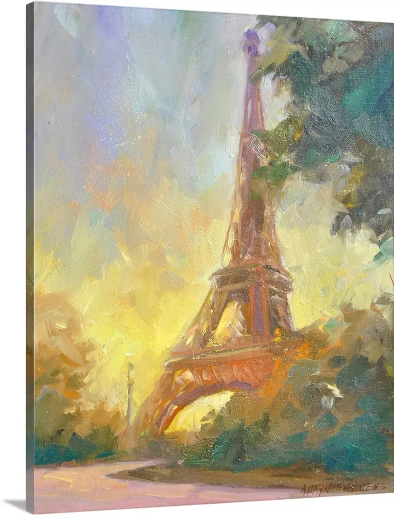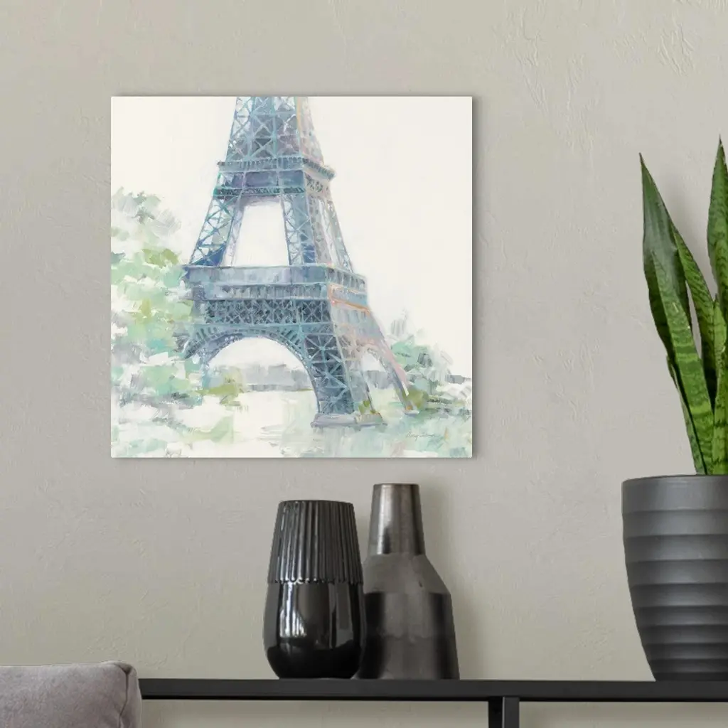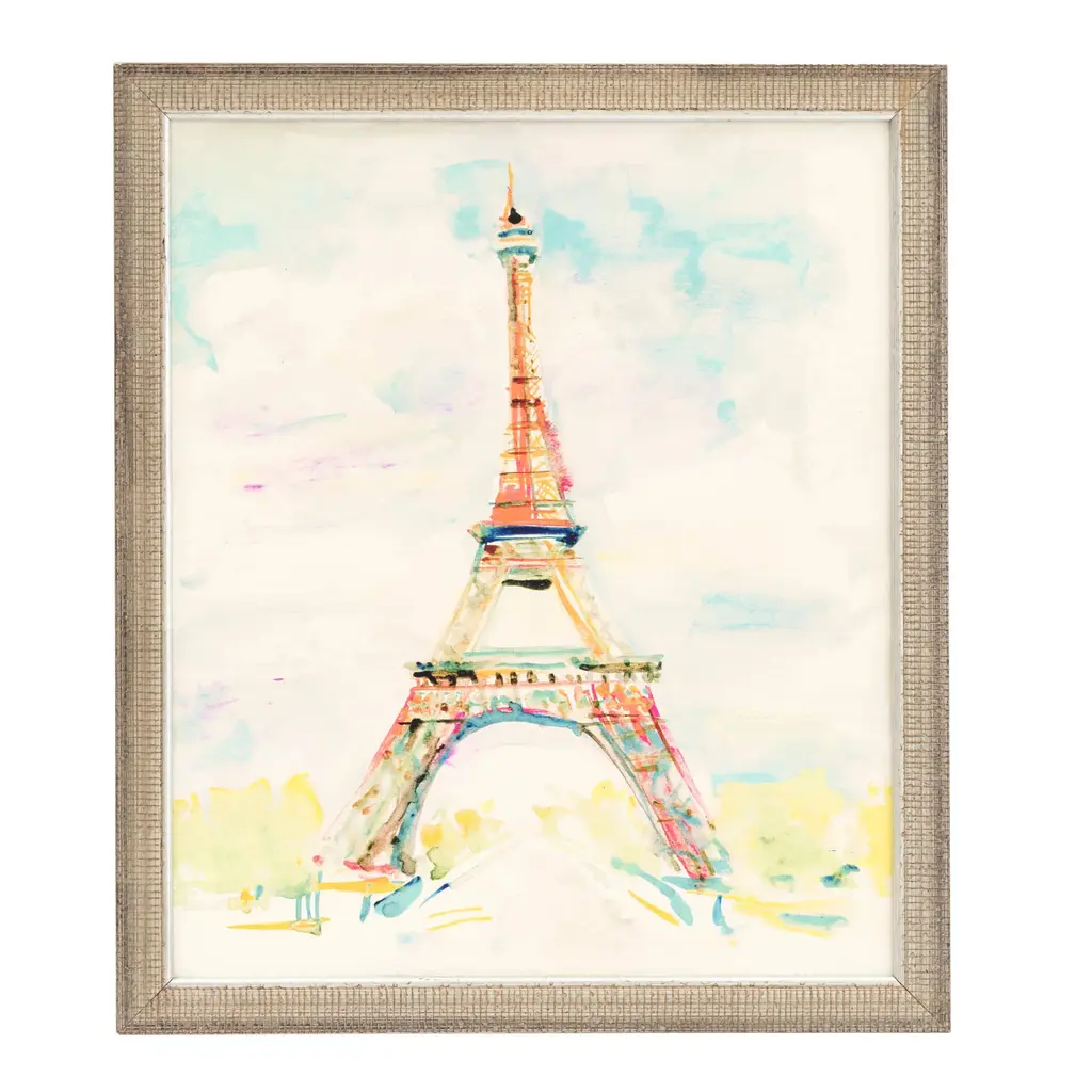 Contemporary painting of the bottom part of the Eiffel Tower made with pastel hues on a white, square background.