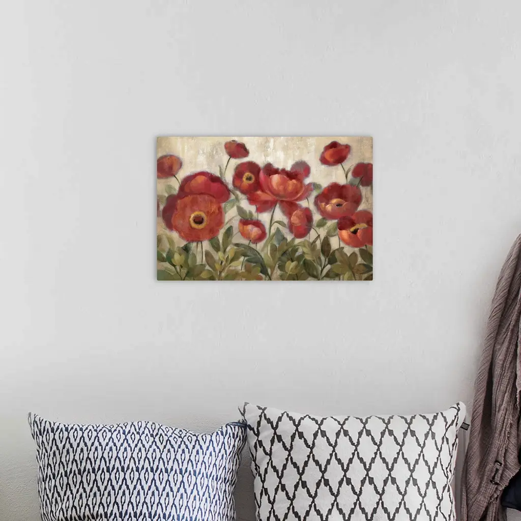 Soft, dreamy contemporary painting of a group of round poppies in a garden with short leaves, on a pale neutral background.