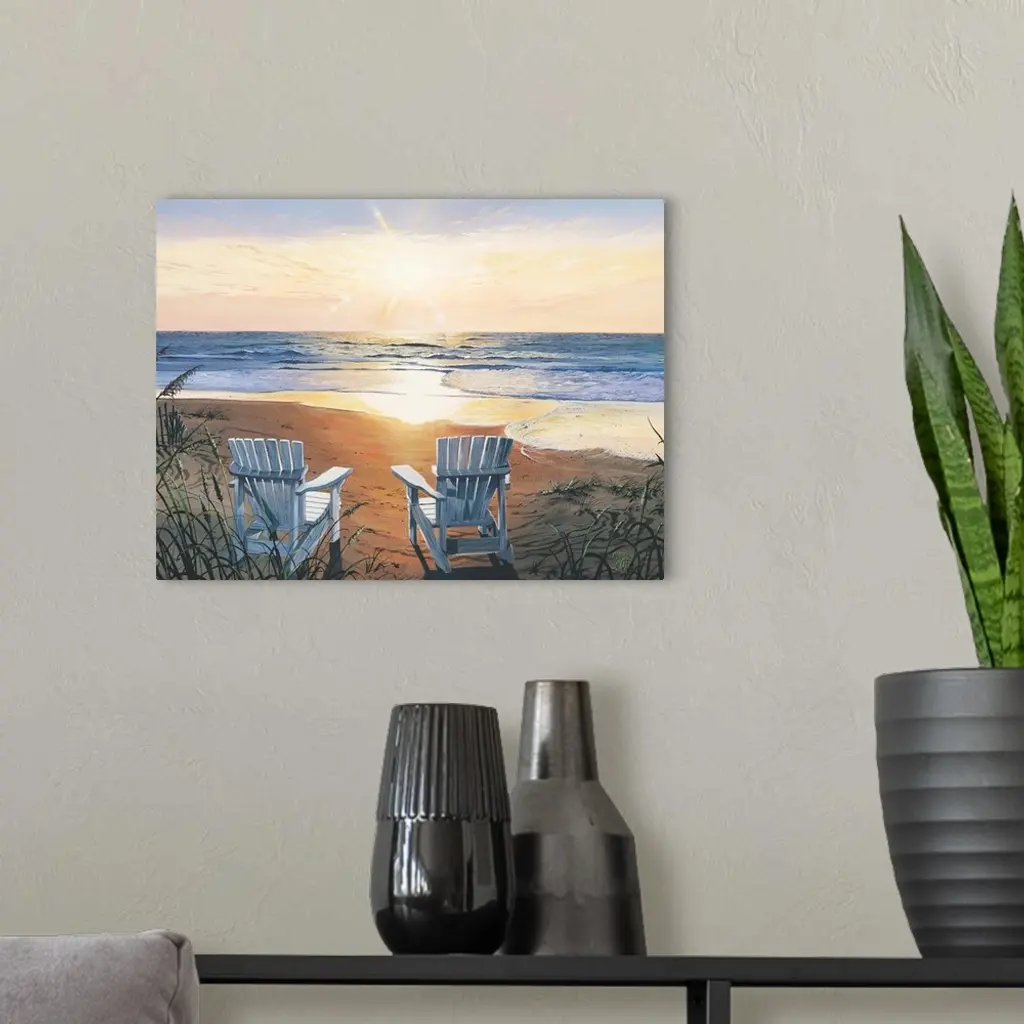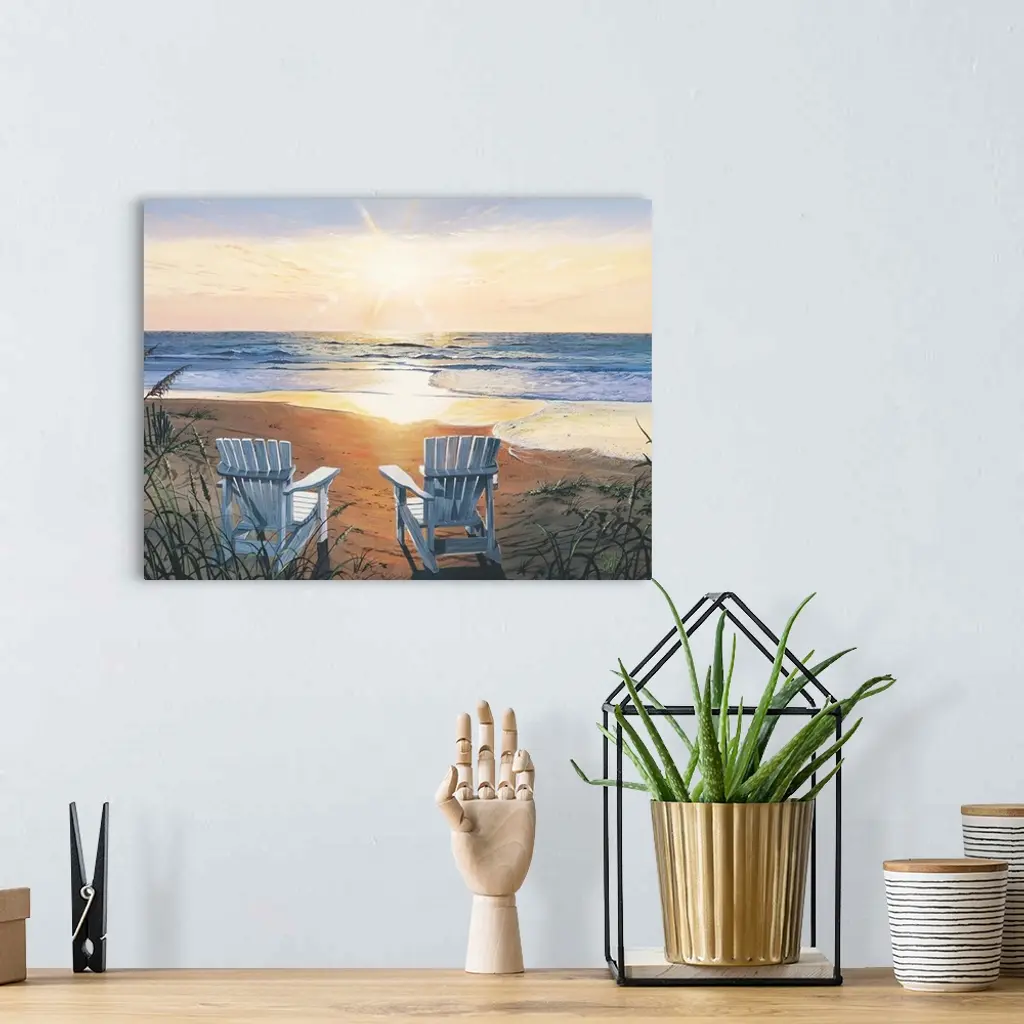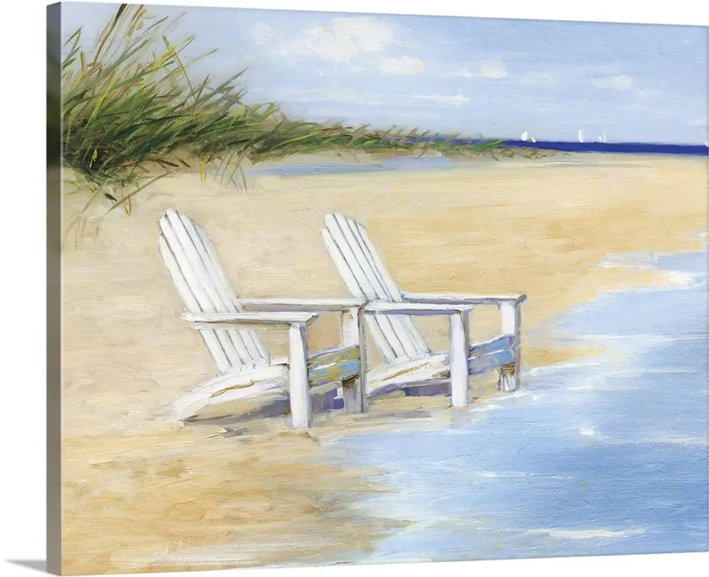 Painting of two beach chairs on sand near shoreline under a sunny sky.