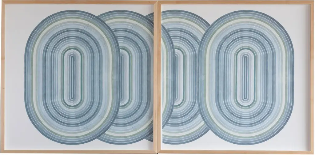 Concentric ovals rendered in restful hues make this diptych a serene addition to a room. Reproduced on heavy cotton rag paper, the pair of giclée prints arrive framed and ready to hang.