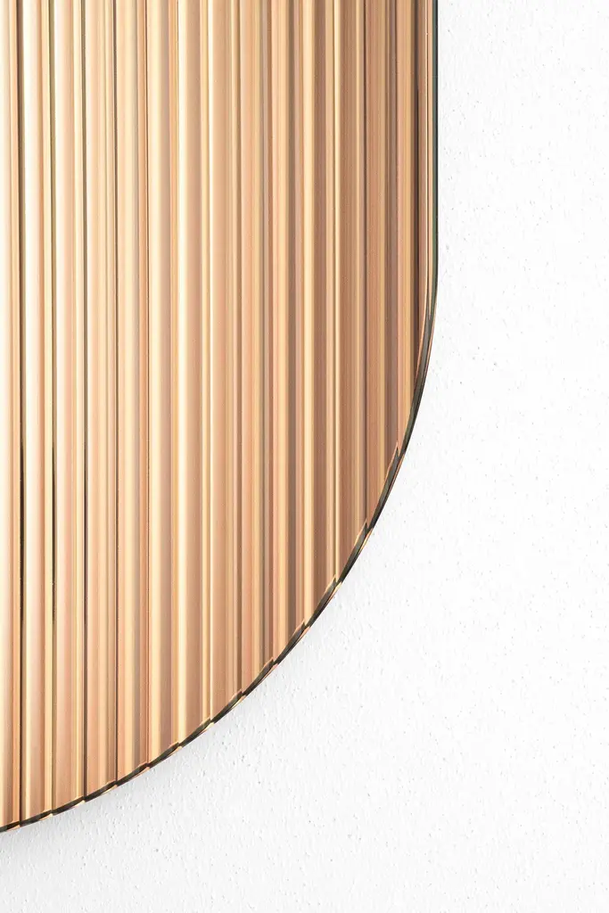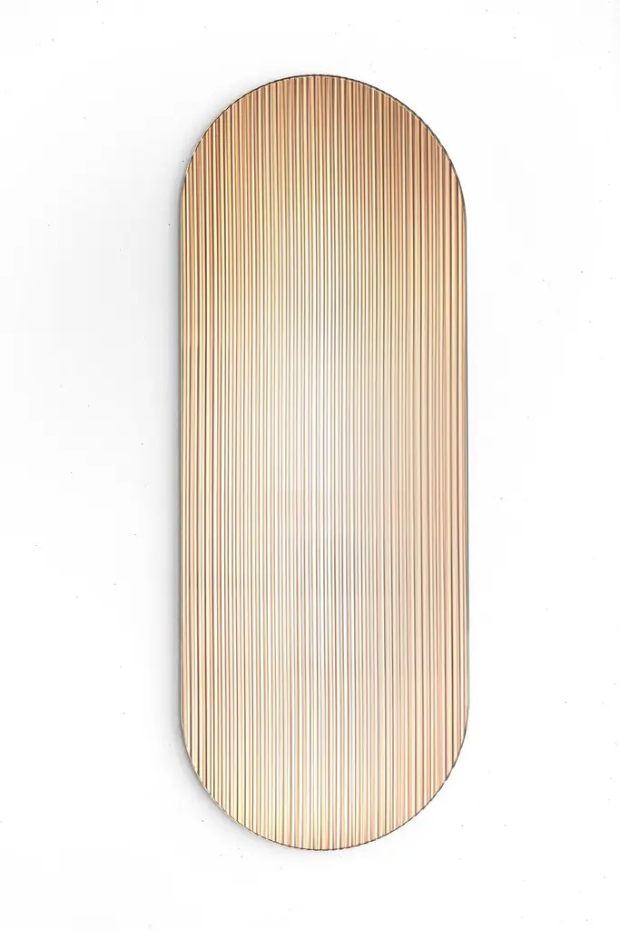 The reflective, colored, rippled glass panel – designed to add a palette of colour to spaces – reflects light in spaces and adds movement and color whilst creating abstracted reflections. The piece disperses light through its rippled surface creating transitions of colour from various viewpoints. It works as an artistic object for spaces and has been designed with the intention of use for larger scale interior and architectural projects. It ships with a hanging system suitable for most wall types.This piece is inspired by brass and its rich, warm golden color.About the Designer:Rive Roshan is the artistic practice of Ruben de la Rive Box and Golnar Roshan. The studio creates to connect with people intuitively through exploring visual wonder as a means to emotional well-being. Through experimental processes the studio designs immersive spatial experiences, materials and objects that enrich lives and create memories that we treasure.