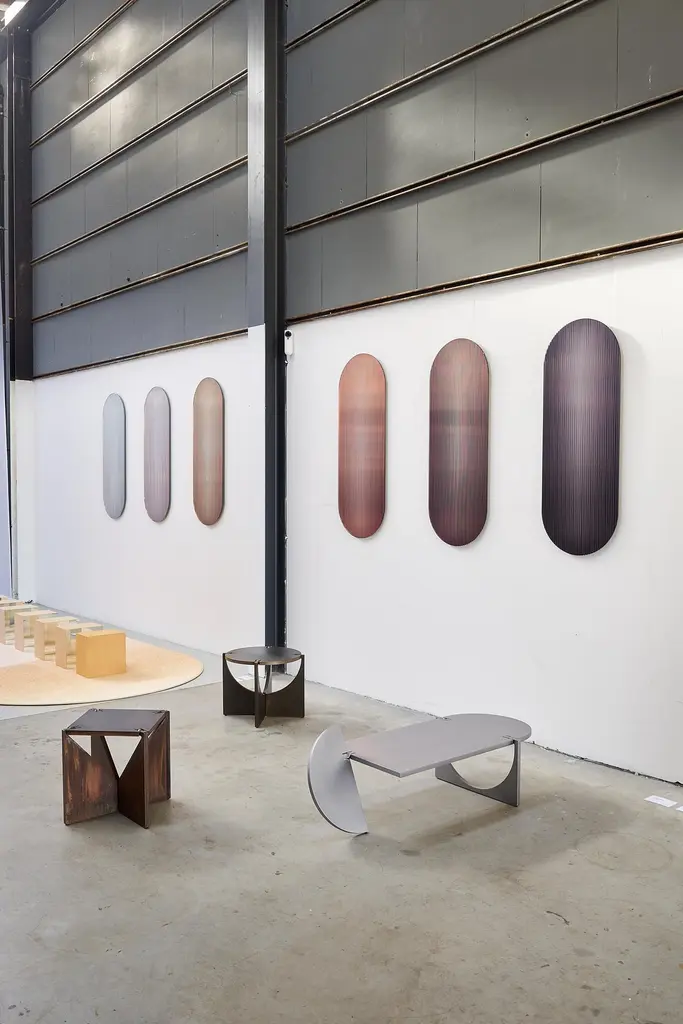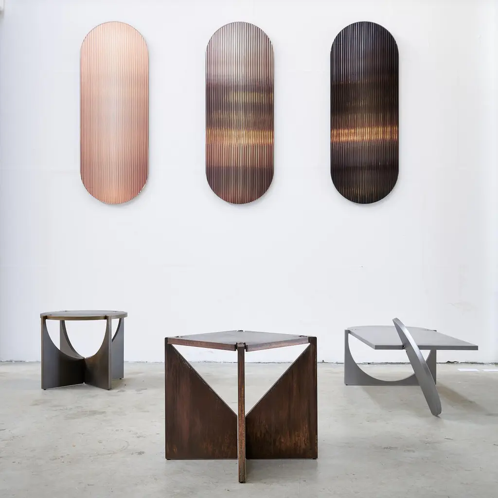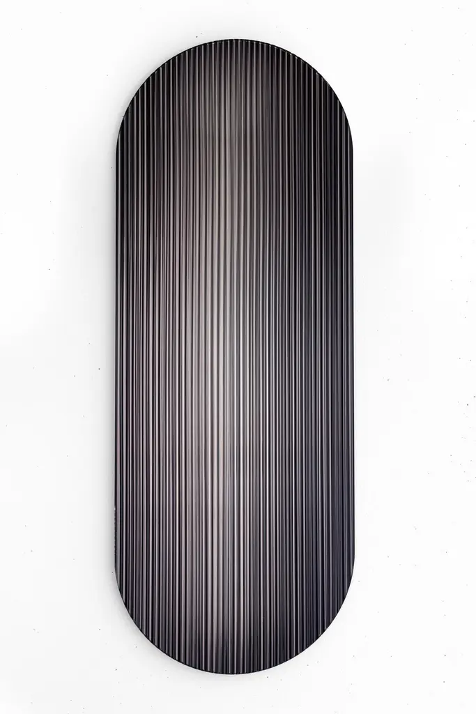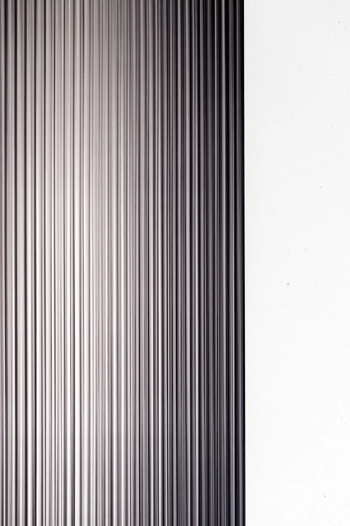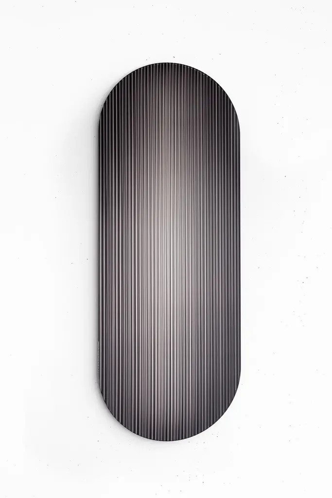 The reflective, coloured, rippled glass panel – designed to add a palette of colour to spaces – reflects light in spaces and adds movement and color whilst creating abstracted reflections. The piece disperses light through its rippled surface creating transitions of colour from various viewpoints. It works as an artistic object for spaces and has been designed with the intention of use for larger scale interior and architectural projects. It ships with a hanging system suitable for most wall types.This piece is inspired by the deep and dark tones of cast iron. Metal shift panels are designed to work well in interiors that use metal details, metal patinas or interior trimmings that complement certain metal colors. By integrating Metal Shift Iron in an interior with cast iron or dark metal accents there is a seamless integration between art and interior detailing. Metal Shift Iron also works well with blackened steel or rolled steel and dark anodized aluminum.About the Designer:Rive Roshan is the artistic practice of Ruben de la Rive Box and Golnar Roshan. The studio creates to connect with people intuitively through exploring visual wonder as a means to emotional well-being. Through experimental processes the studio designs immersive spatial experiences, materials and objects that enrich lives and create memories that we treasure.
