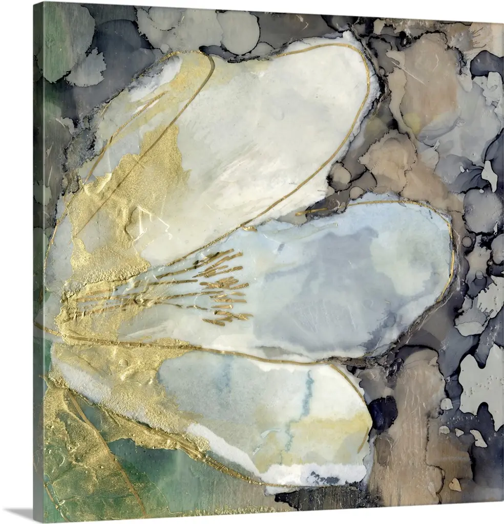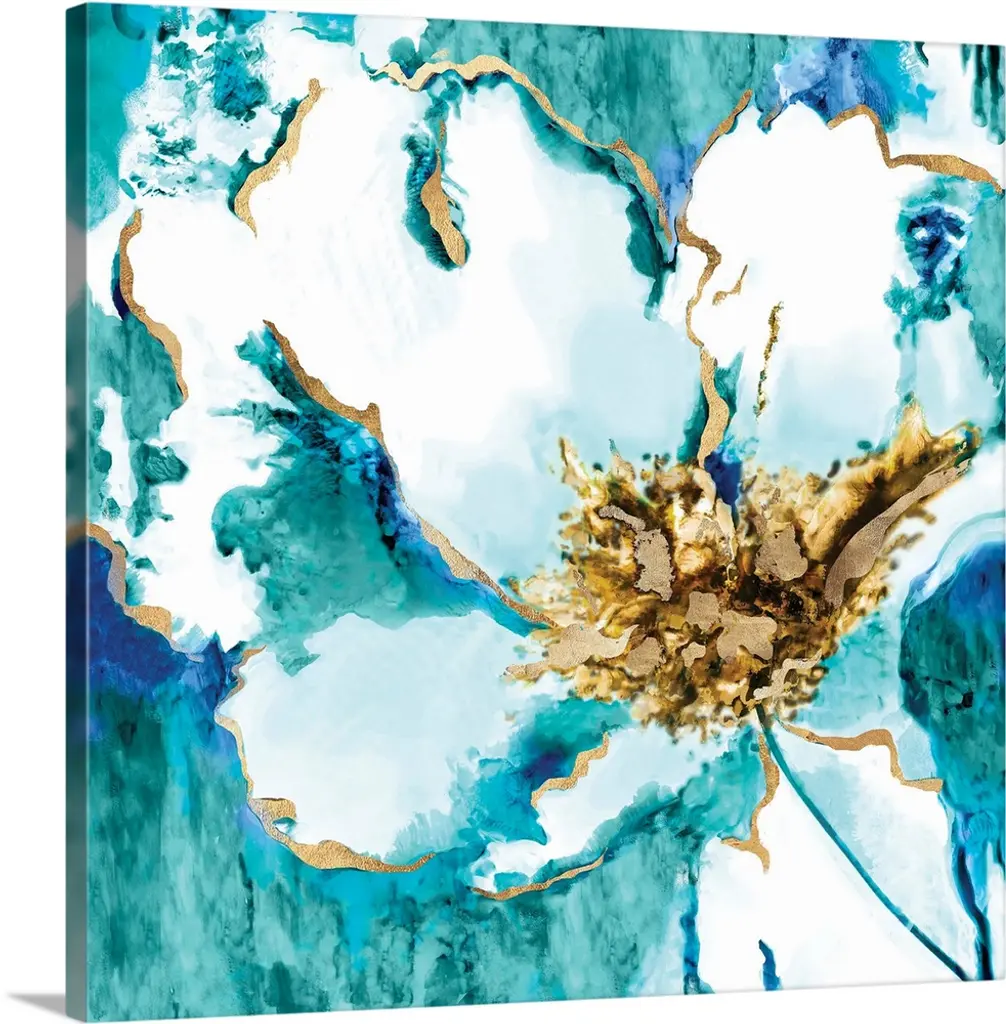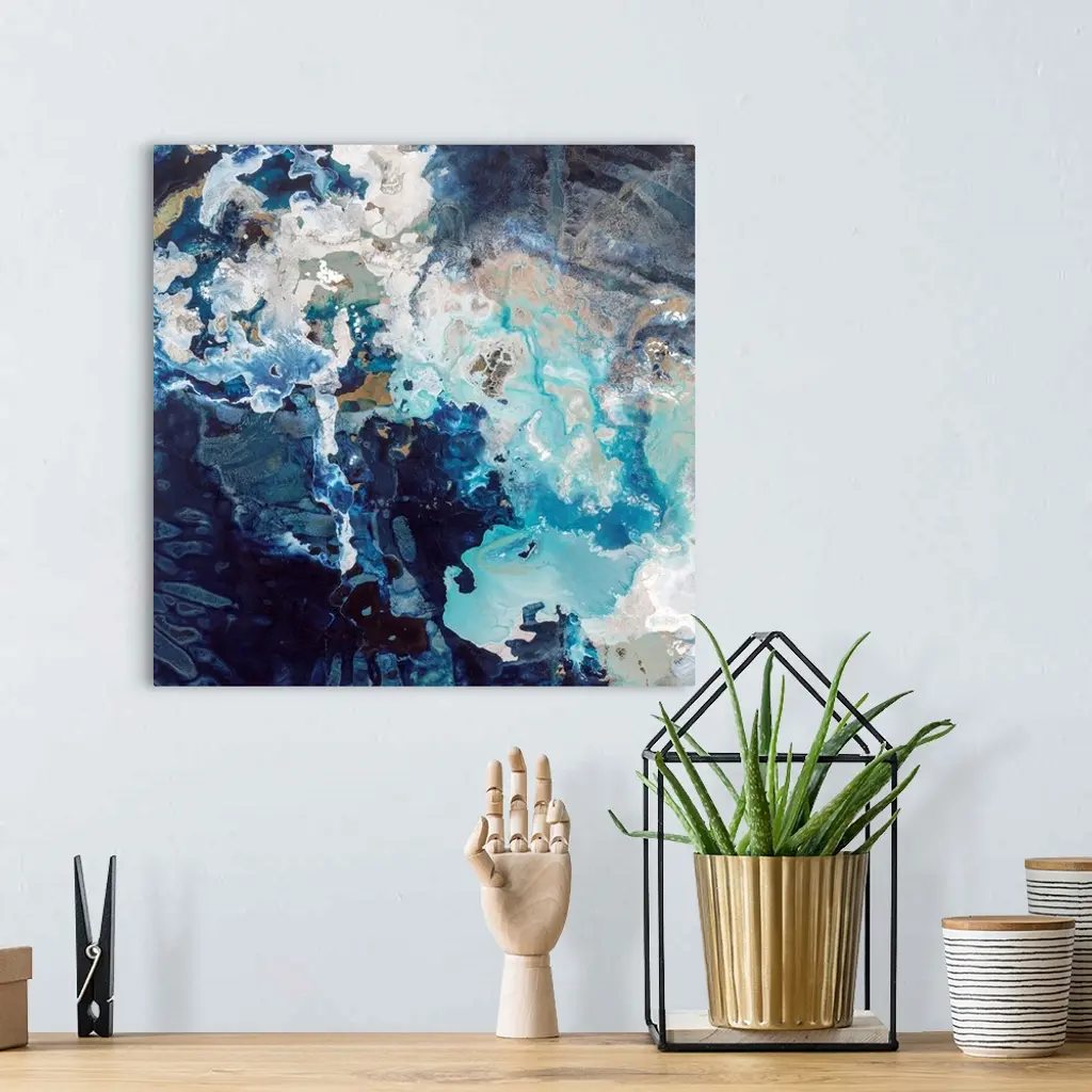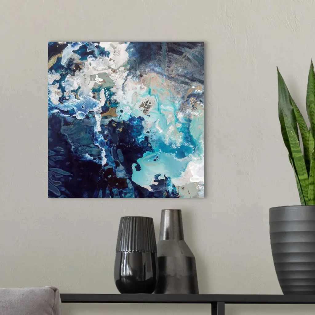 Abstract contemporary painting with dark navy and bright blue splashes.