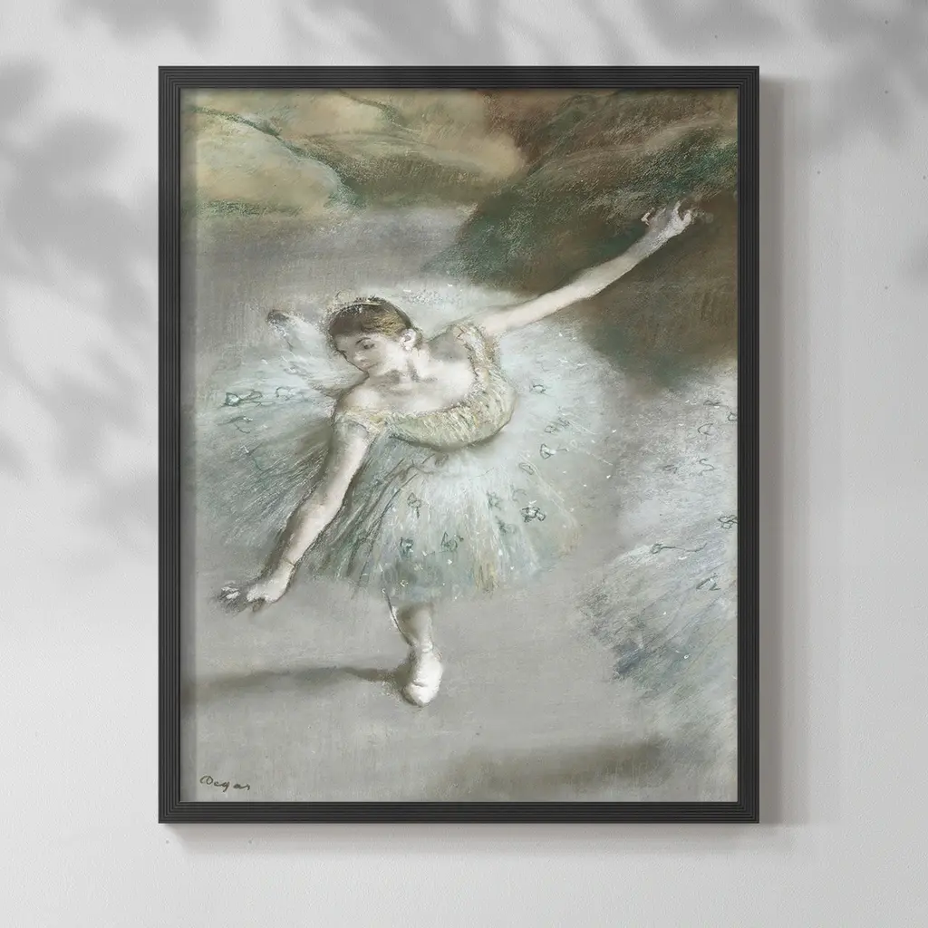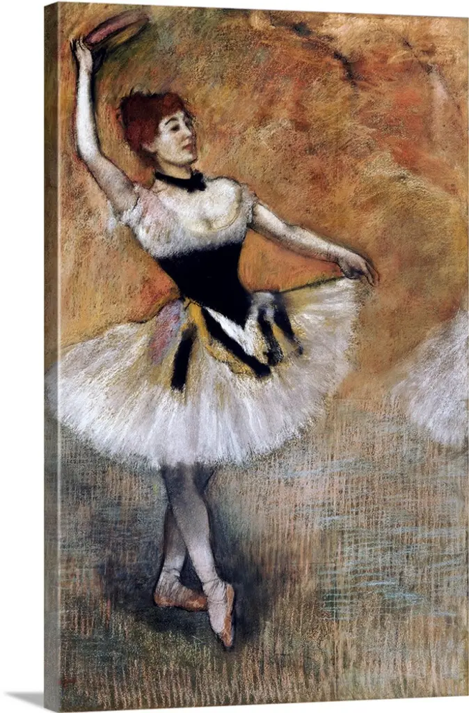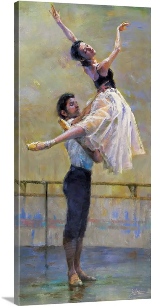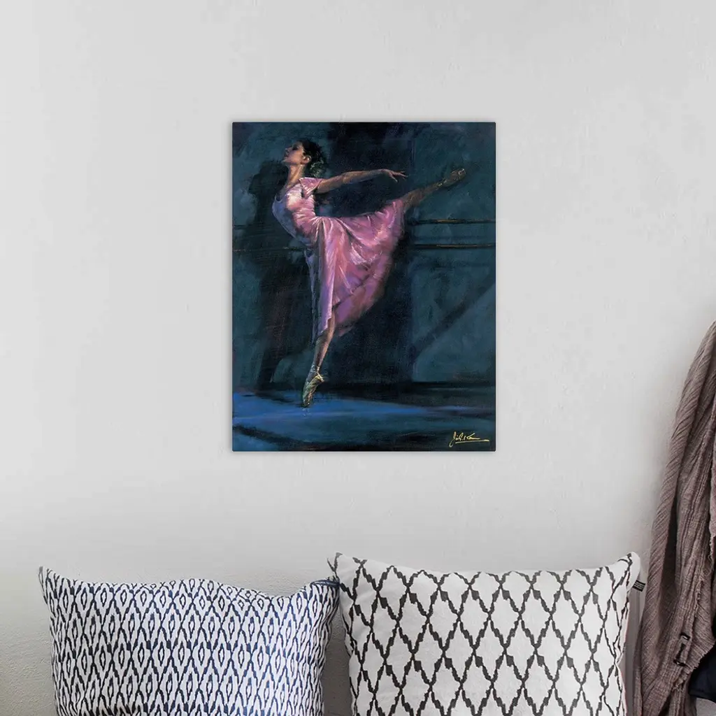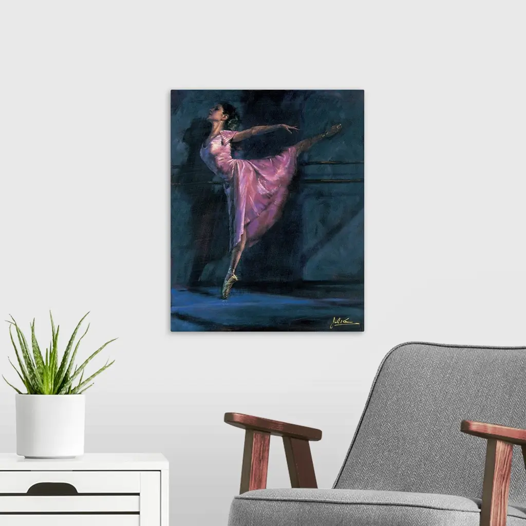 Contemporary painting of a ballerina in pink holding an arabesque on pointe next to a ballet barre.