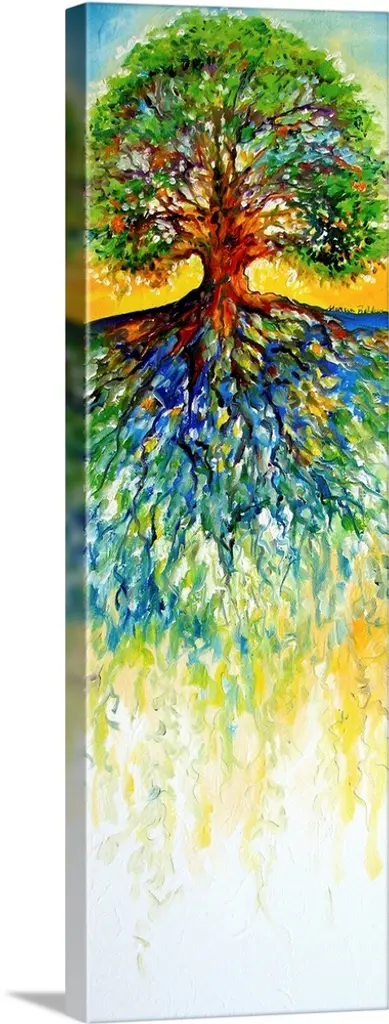 Portrait, contemporary painting on a big wall hanging of a small landscape at the very top of the image with two small trees with red, fall foliage. The trees trunks extend underground into a large, long root system that makes up a majority of the image.