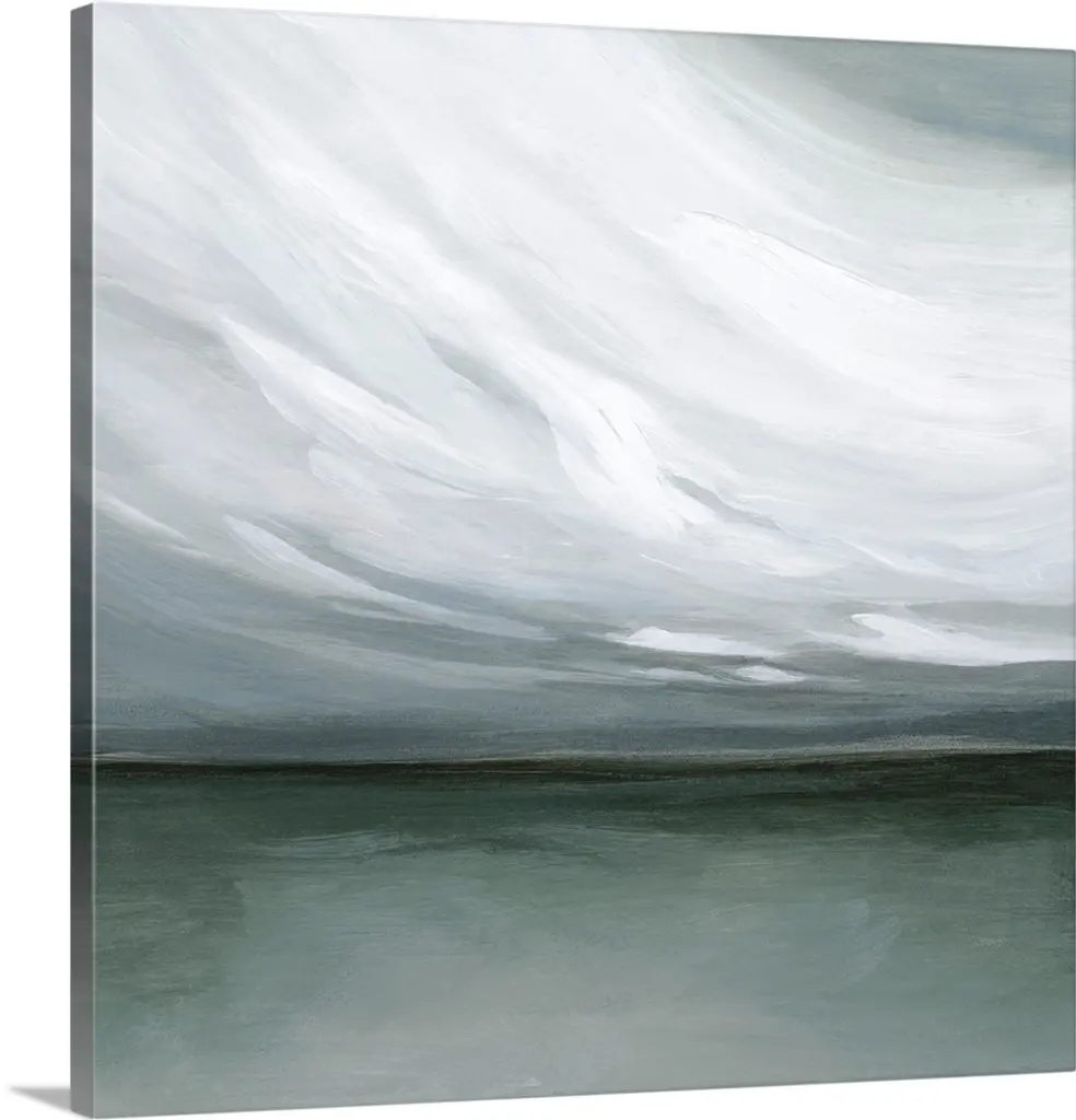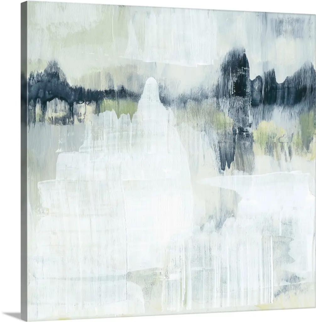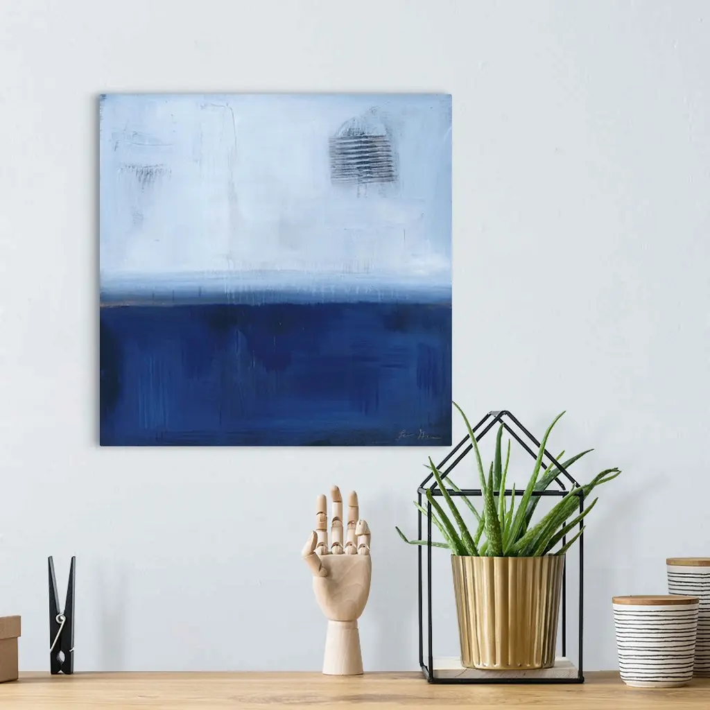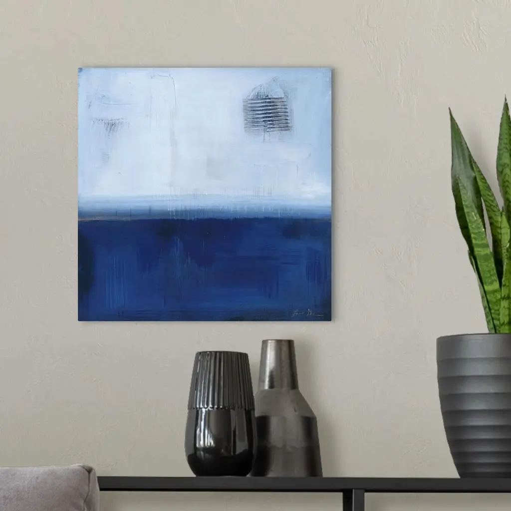 Square, abstract painting featuring large blocks of color in light and dark blue