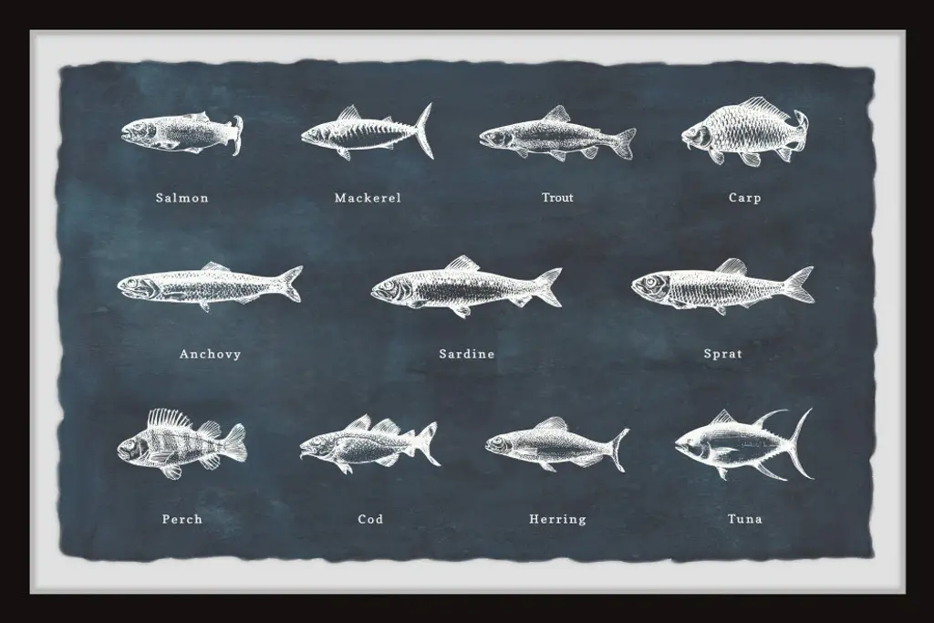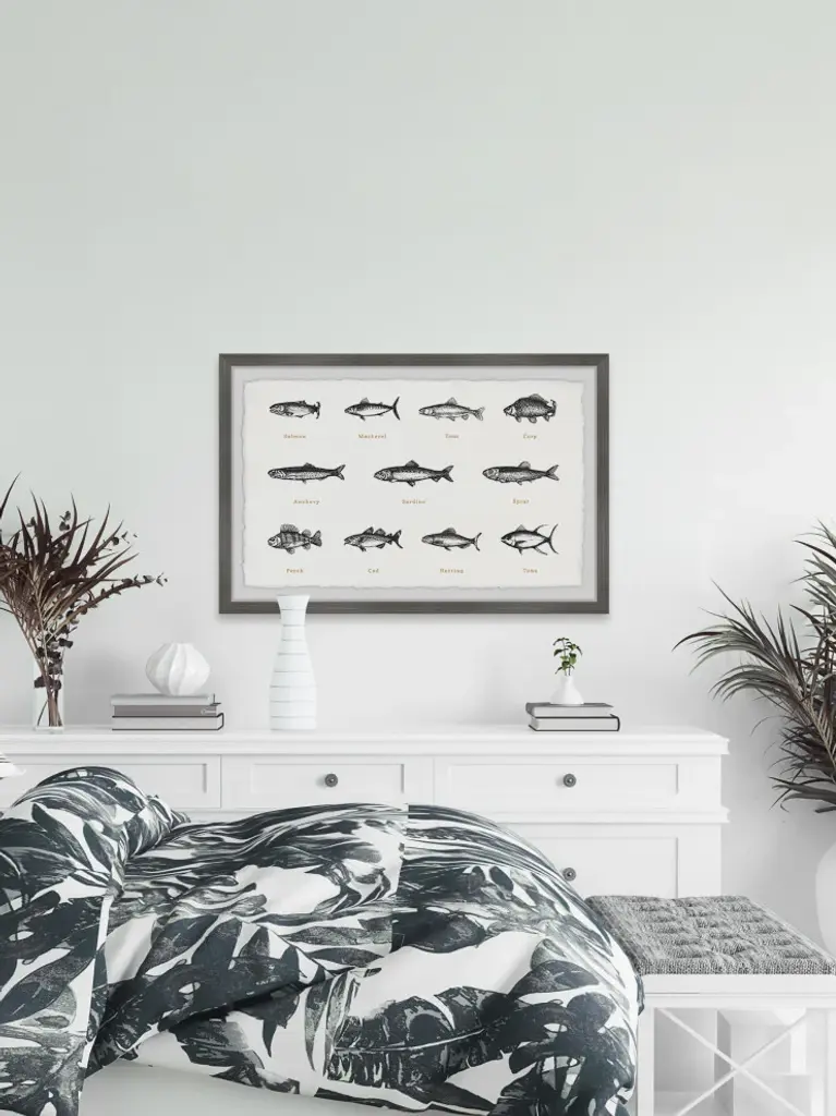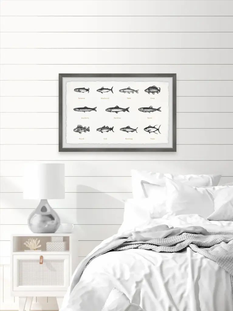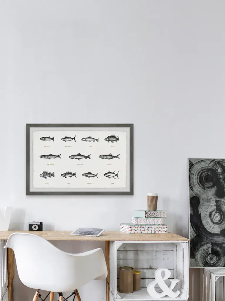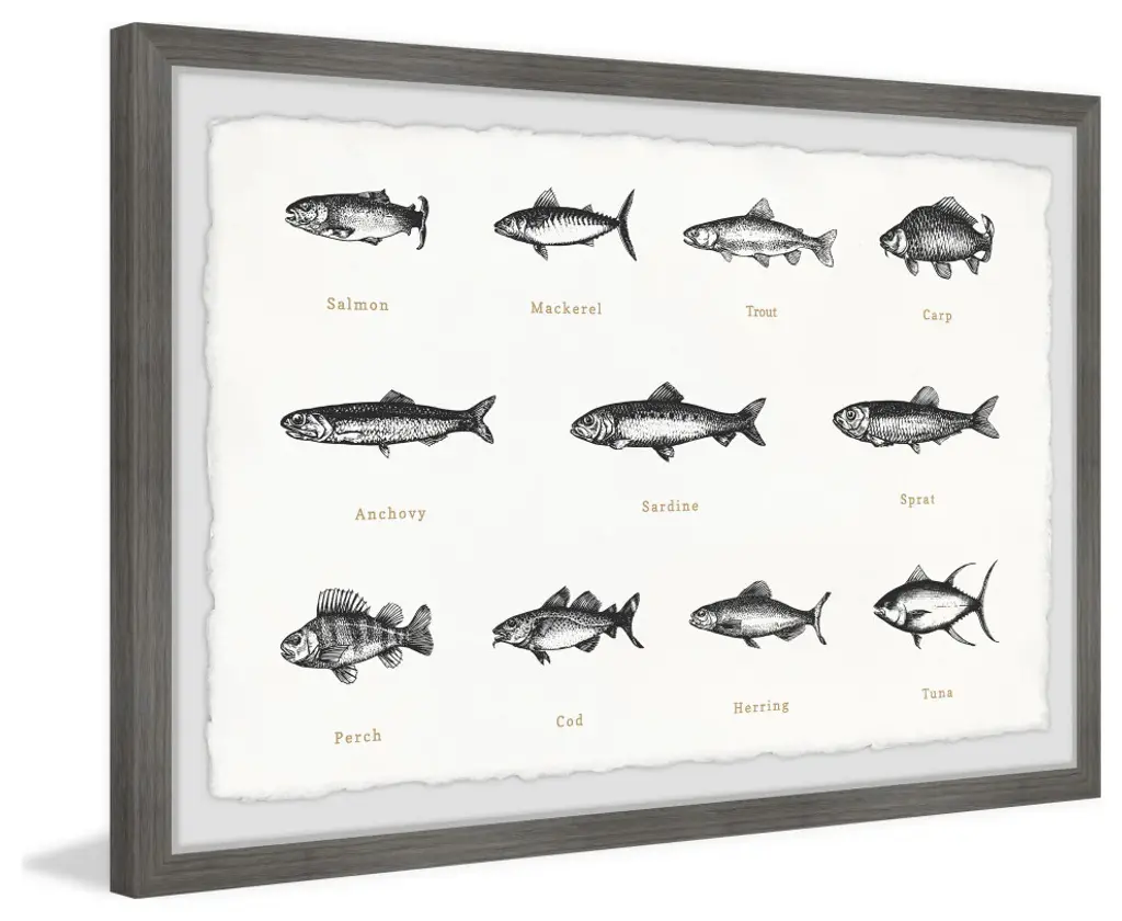 This drawing print is meant to be pondered over, featuring various fish from the sea and a label underneath each one. Proudly printed in the USA, this piece is printed on high quality archive paper and professionally hand-framed. With wall-mounting hooks included, this artful accent is ready to hang up as soon as it reaches your front door.- Top quality Giclee print on high resolution Archive Paper- Hand cut deckled edges- High quality durable non-warping frame- Finished under shatter resistant plexiglass- Arrives ready to hang- Includes a certificate of authenticity- Printed in the USA