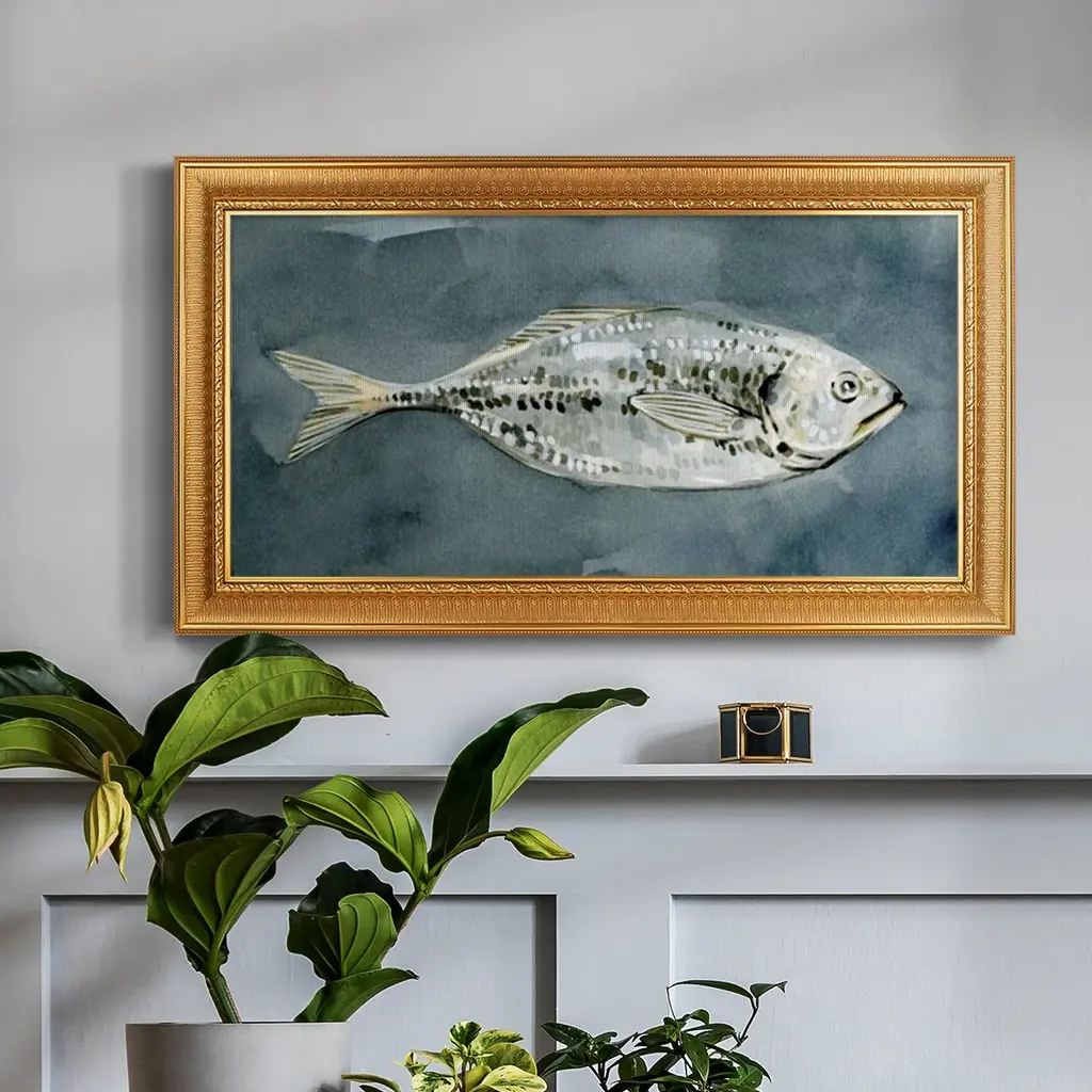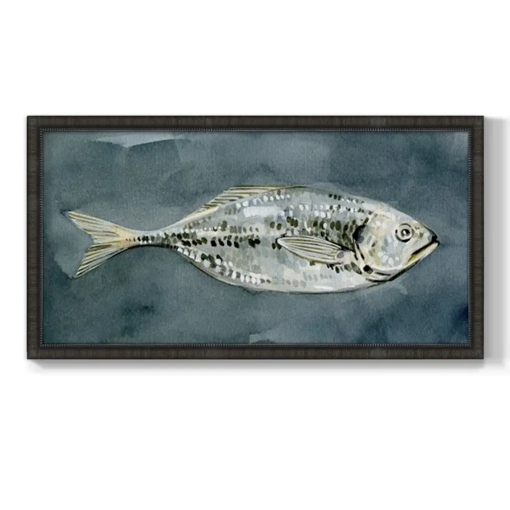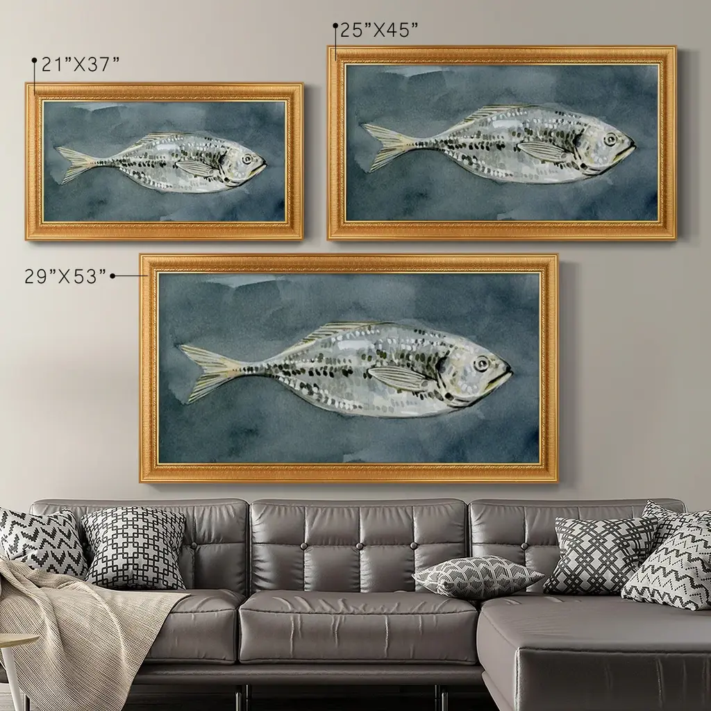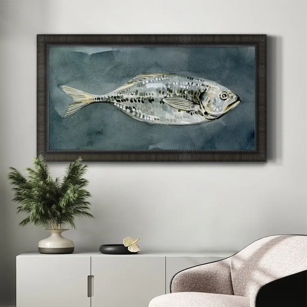 Deep Sea Swimmer II Premium Framed Canvas- Ready to Hang A Premium Framed Canvas created to last. Framed in distressed wood and available in an array of sizes and colors Featuring a beveled a solid wood stretcher bar, each piece comes ready to hand 3 SIZES AVAILABLE 21''X37'' - Overall Size 25''X45'' - Overall Size 29''x53'' - Overall Size Each piece is made to order. Each piece comes with hanging hardware. Made in the USA Ready to Hang Giclee Paper Print Acrylic Glass Beveled Matt Board
