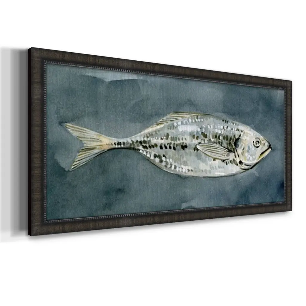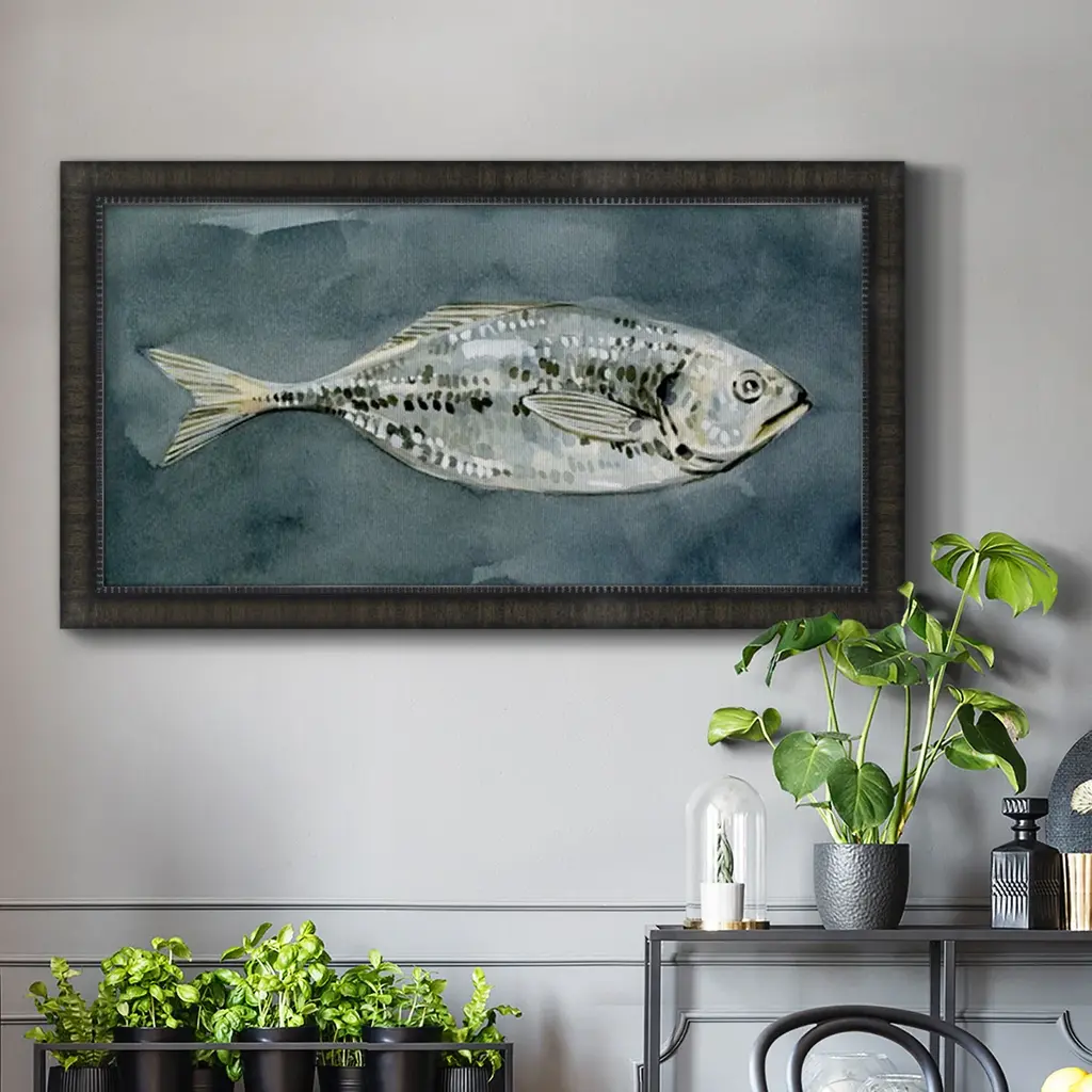Deep Sea Swimmer II Premium Framed Canvas- Ready to Hang A Premium Framed Canvas created to last. Framed in distressed wood and available in an array of sizes and colors Featuring a beveled a solid wood stretcher bar, each piece comes ready to hand 3 SIZES AVAILABLE 21''X37'' - Overall Size 25''X45'' - Overall Size 29''x53'' - Overall Size Each piece is made to order. Each piece comes with hanging hardware. Made in the USA Ready to Hang Giclee Paper Print Acrylic Glass Beveled Matt Board