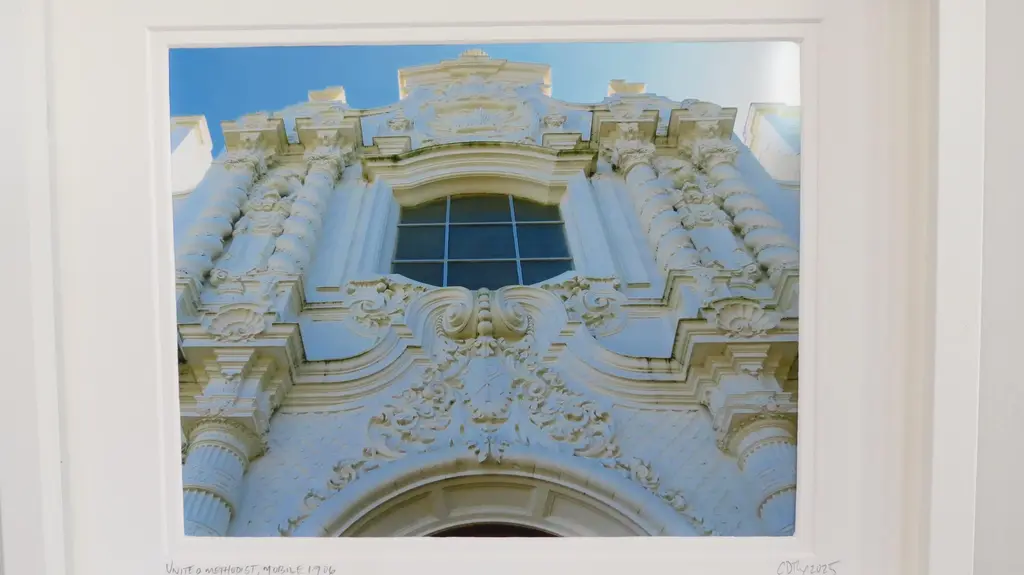 Spring 2025 I started a tour of the deep South from Mississippi, Alabama, Georgia and South Carolina. Using a distinct perspective of capturing the essence of the cultural and historical often off the track and hidden gems of the costal south, my new series of Limited Edition Framed Photography is now being presented with many more images to come as I travel across the coast. Digitally enhanced framed Limited Edition photography of the Awe inspiring Methodist Church Mobile, AL. Ca. 1906.. Deep contrast digital filter adds a unique dimension to this Limited Edition Travel and Architectural photography framed and matted under glass. 12" x 15". Size matted at 11" x 14", image is 10" x 14". Signed, dated, and numbered. White modern frame with backing and hanging hardware attached. Each image comes with a card describing the significance and story behind the image with descriptions and details of the place and mark in history.
