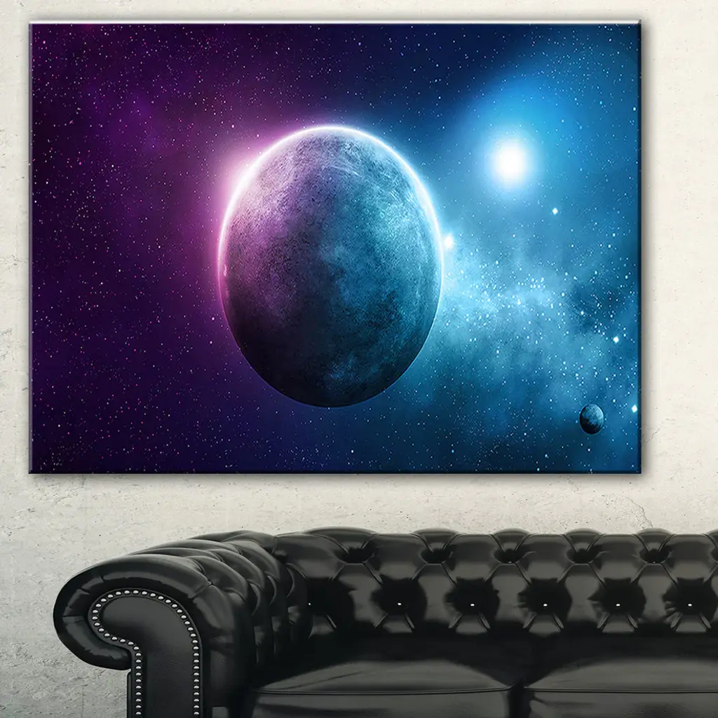 The Deep Space Planet canvas art print is sure to make an impression on anyone who sees it. This artwork is gallery wrapped around a 1-inch solid wood frame and arrives carefully packaged and entirely ready to hang on the wall. Design Art only uses the highest resolution and pigments to ensure a crisp colorful print that is never faded or pixelated. This artwork is sure to be a conversation starter in any home or office.