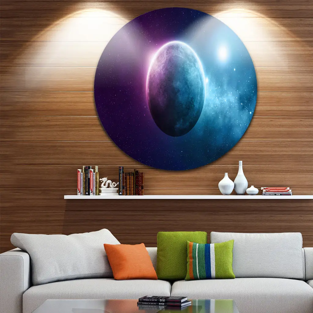 Bring Contemporary Abstraction to your home with this large Circle Metal wall art. This Deep Space Planet Metal Artwork makes it the focal point of any room or office. - White Gloss Coating ensures colors are extra vibrant with light reflection.- Aluminum grade Sheet Metal with 1 inch mounting frame on the back giving the illusion that the artwork is floating on the wall..- Mounting Brackets are included along with instructions.- High Quality Digital images are created directly into a glossy aluminum panel producing a stunning and captivating print into the glossy finish of the metal.- Water, Fire and Scratch resistant HD Aluminum panels.- Looks better than any photo paper and guaranteed to last at least 20 years- Easy to clean with a microfiber cloth. Colors are far superior to regular Canvas Art. - Easy to Hang