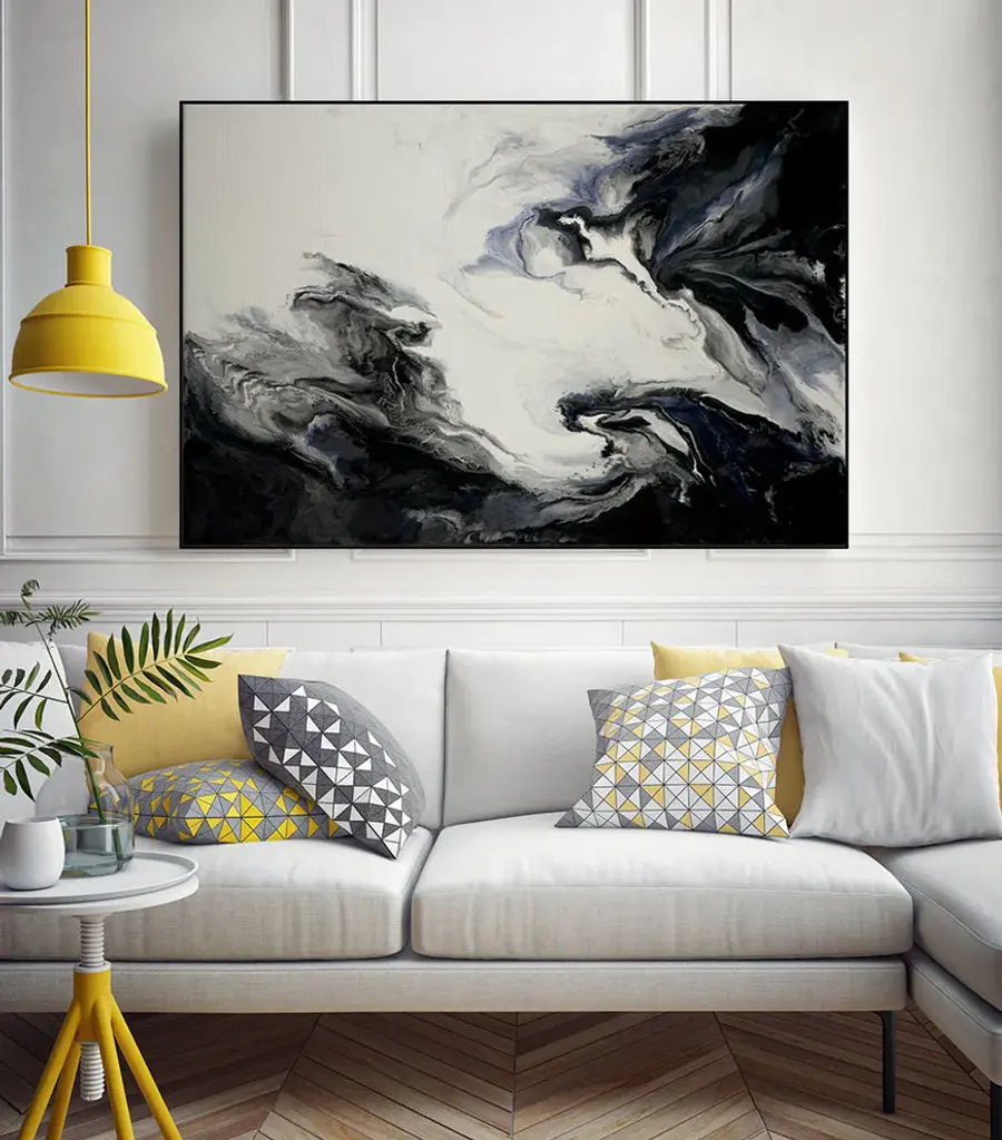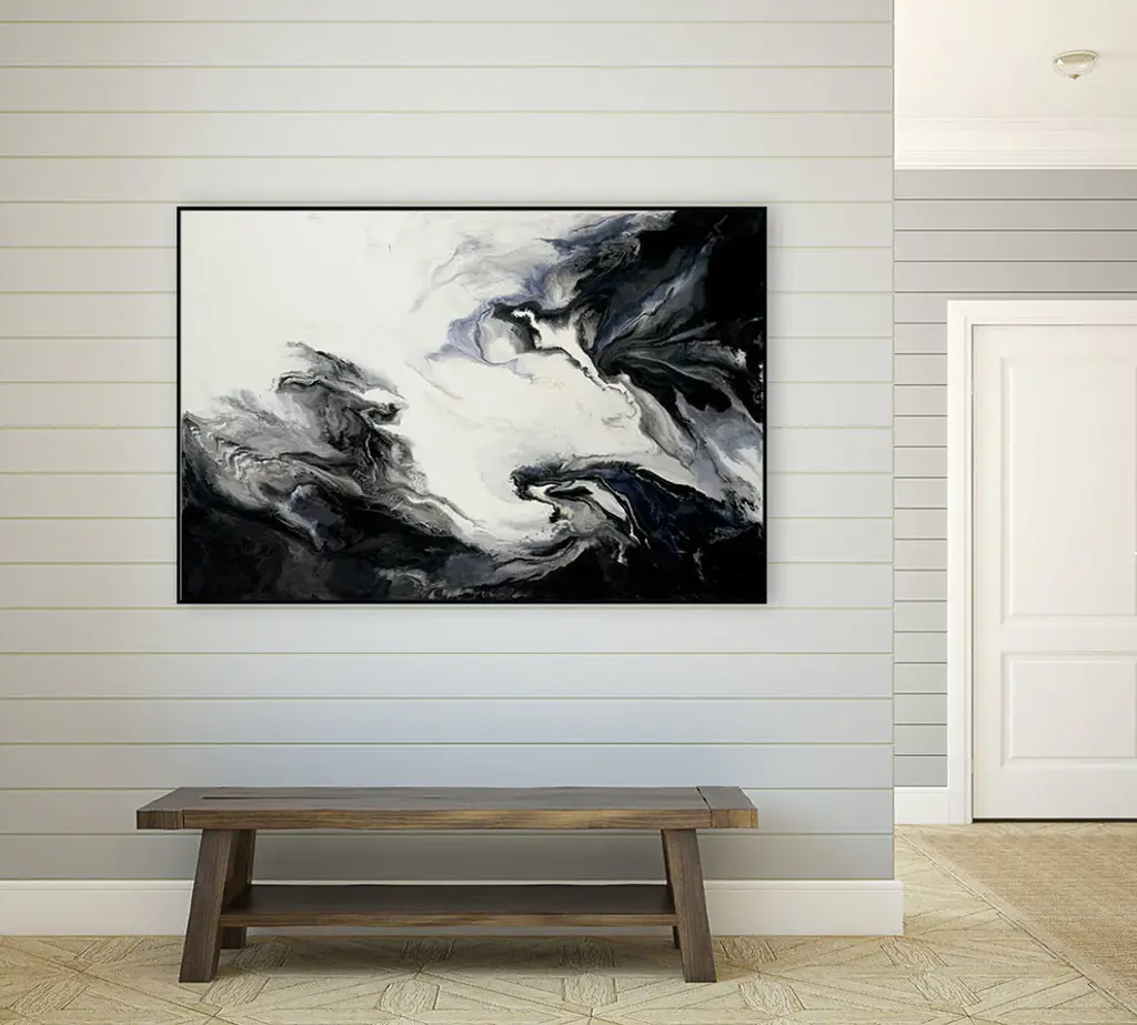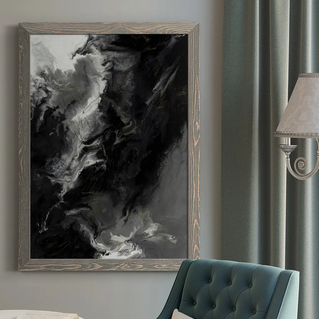 Your ready to hang artwork is printed on canvas then stretched and mounted to a 2-inch thick - hand stained black wood frame. Arrives at your door complete with an easy to use self-leveling hangking kit.