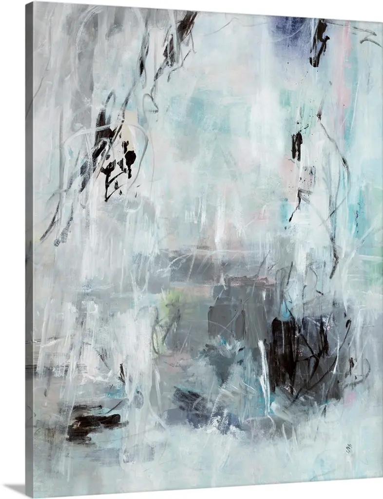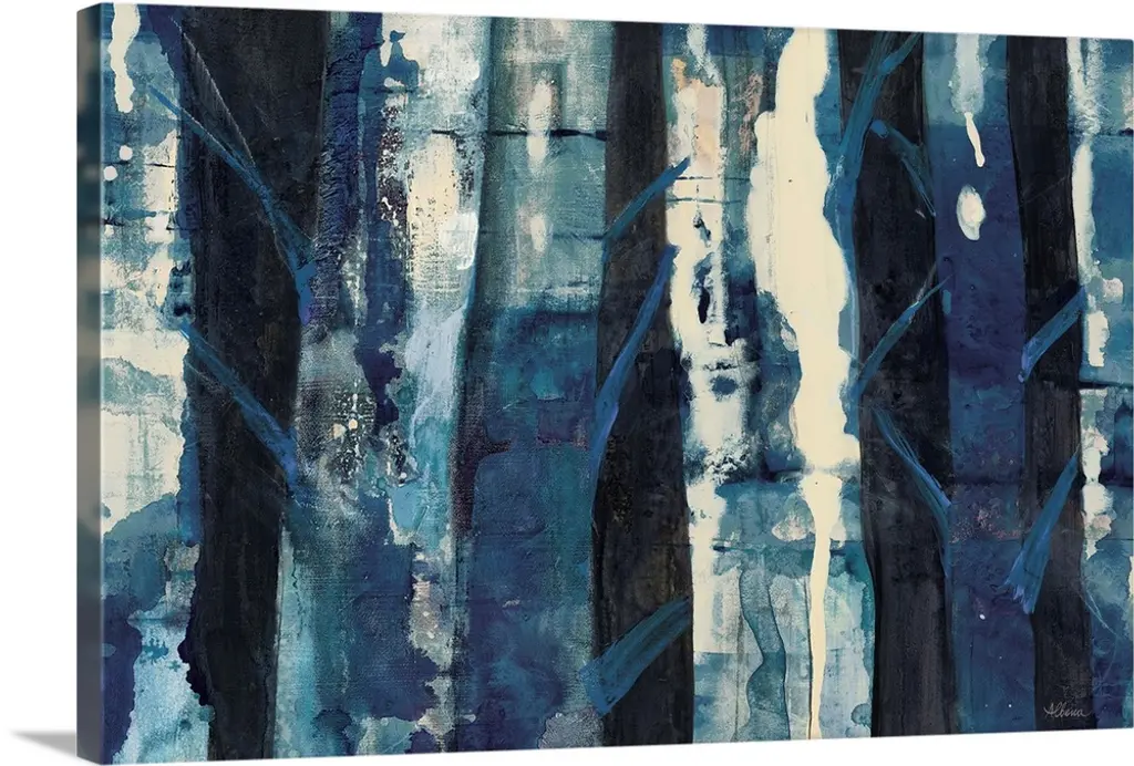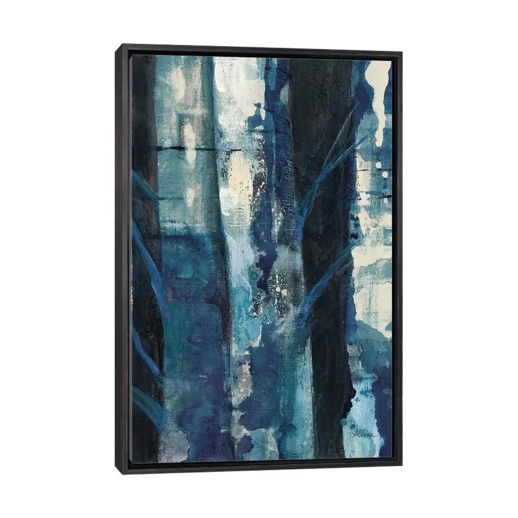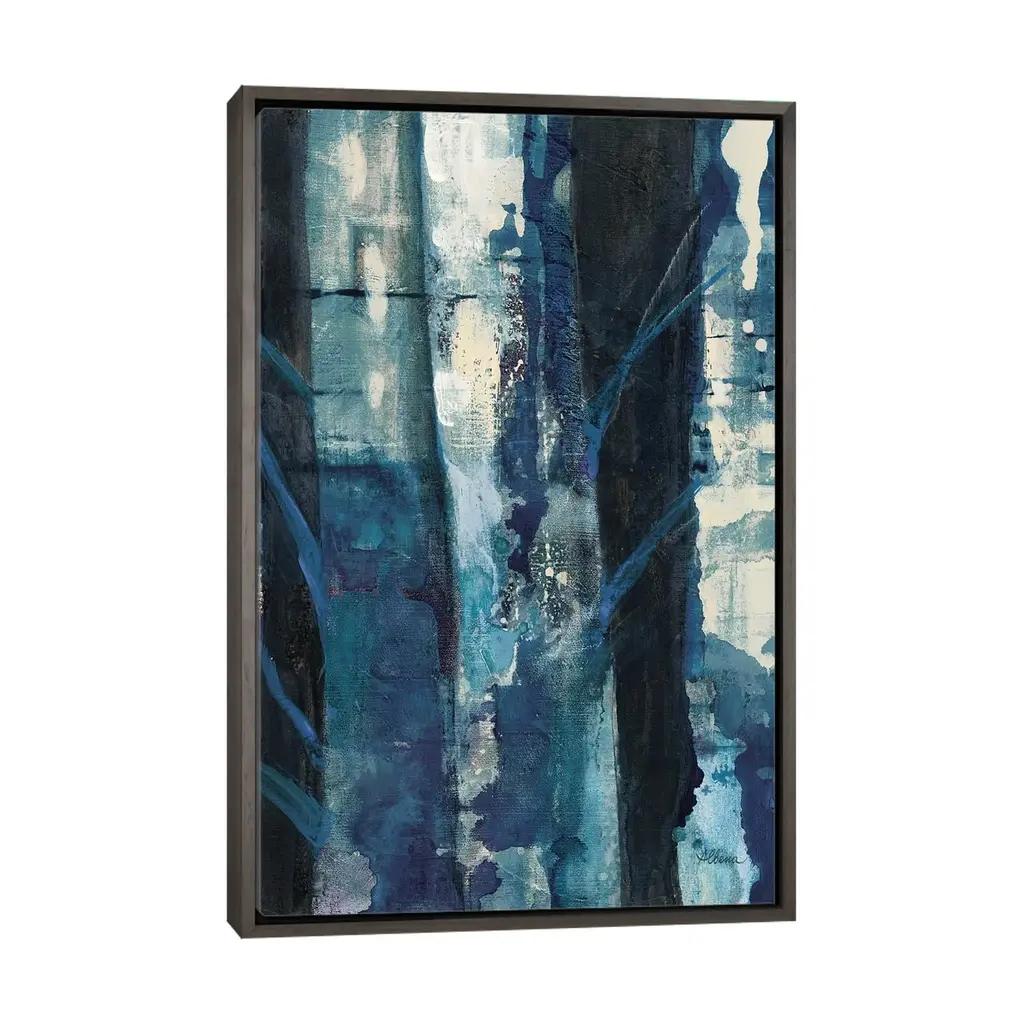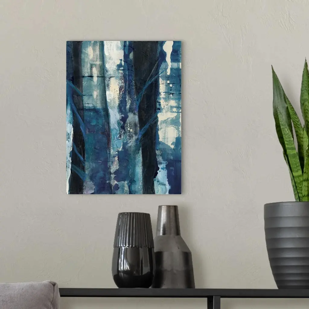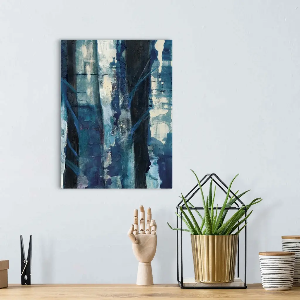 Vertical abstract painting of textured roughed vertical lines in shades of blue.