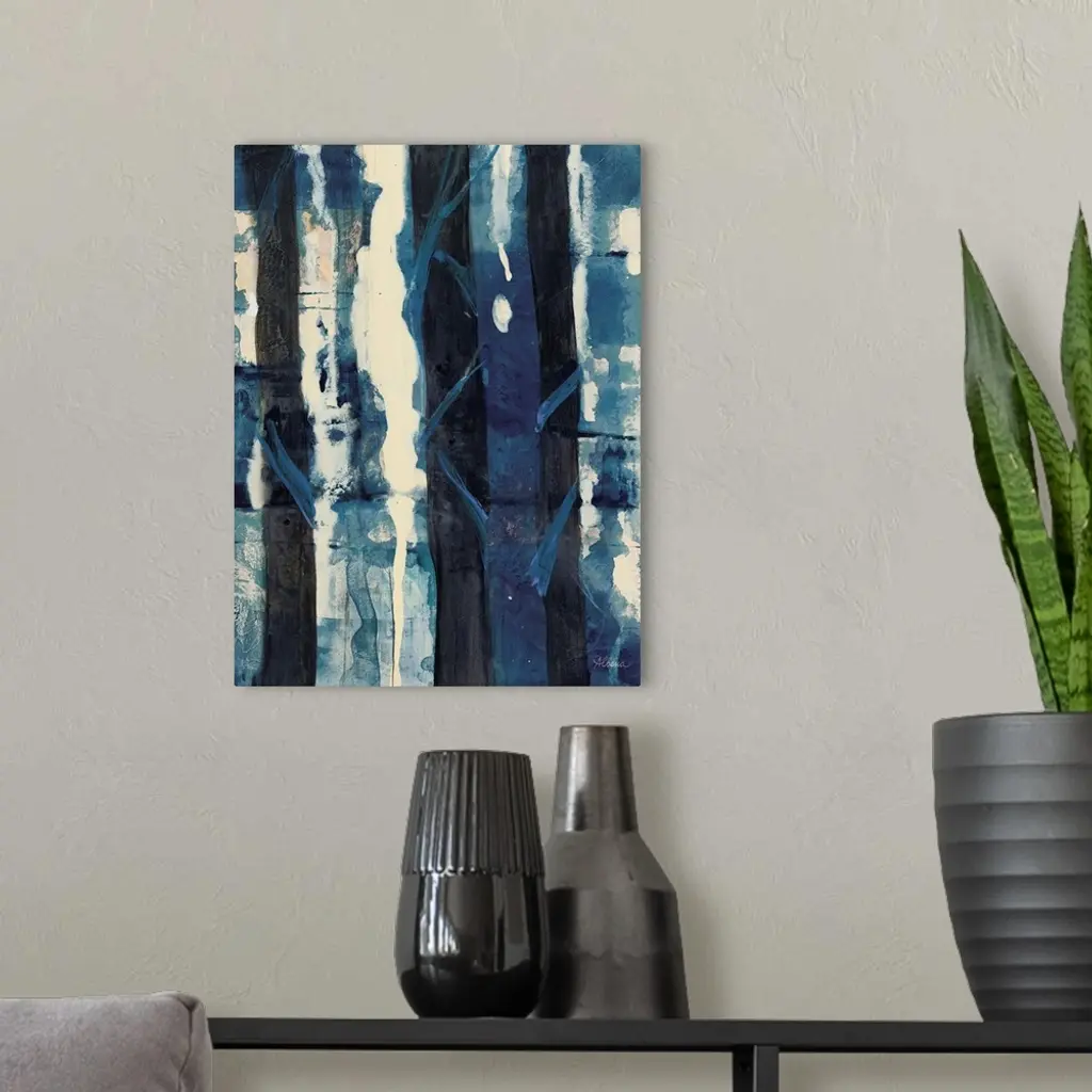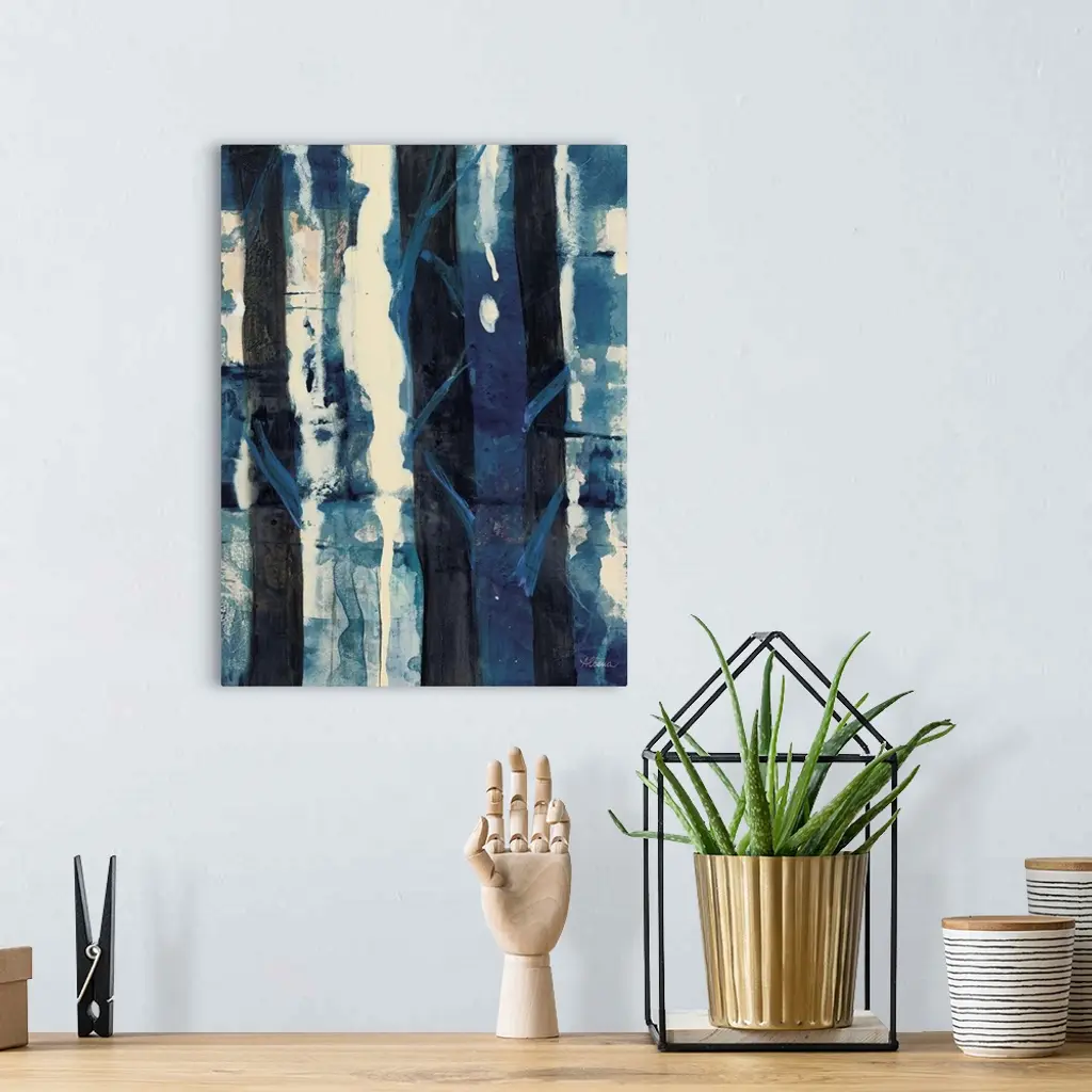 Vertical abstract painting of textured roughed vertical lines in shades of blue.