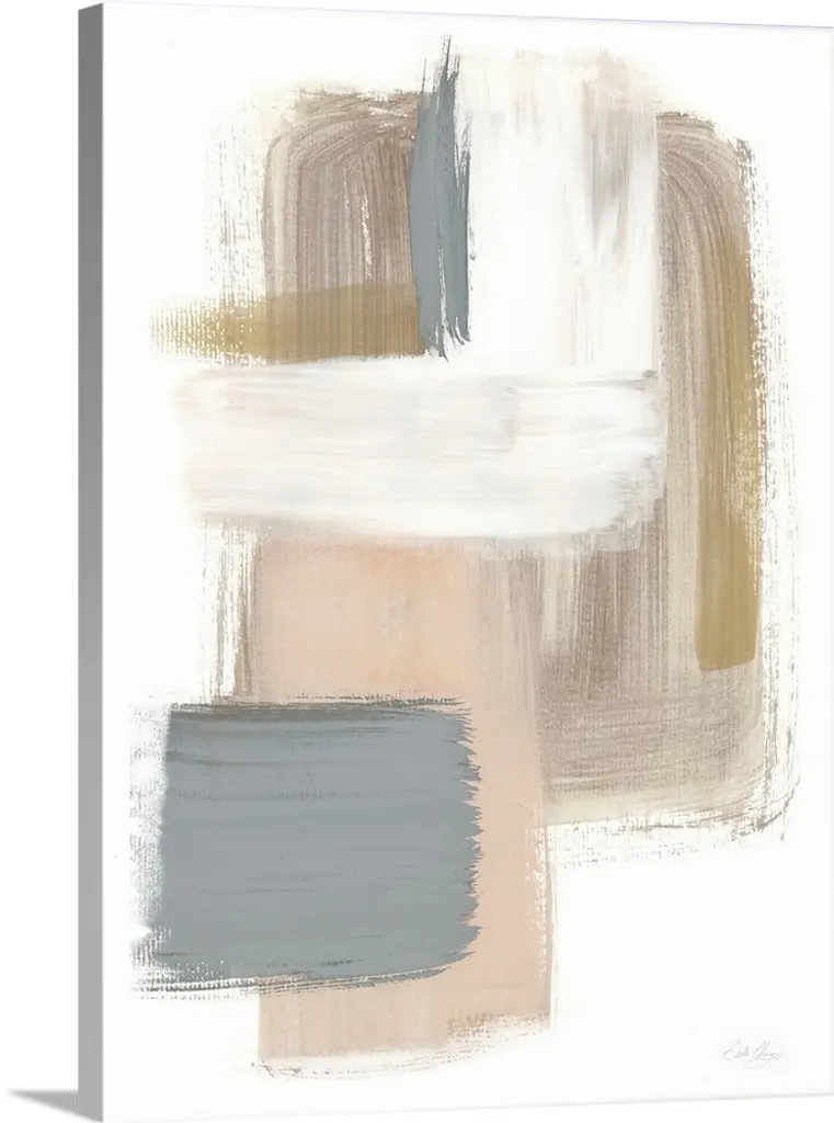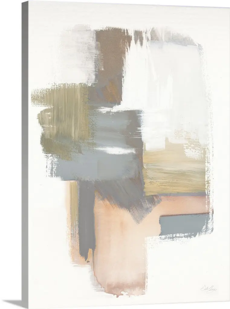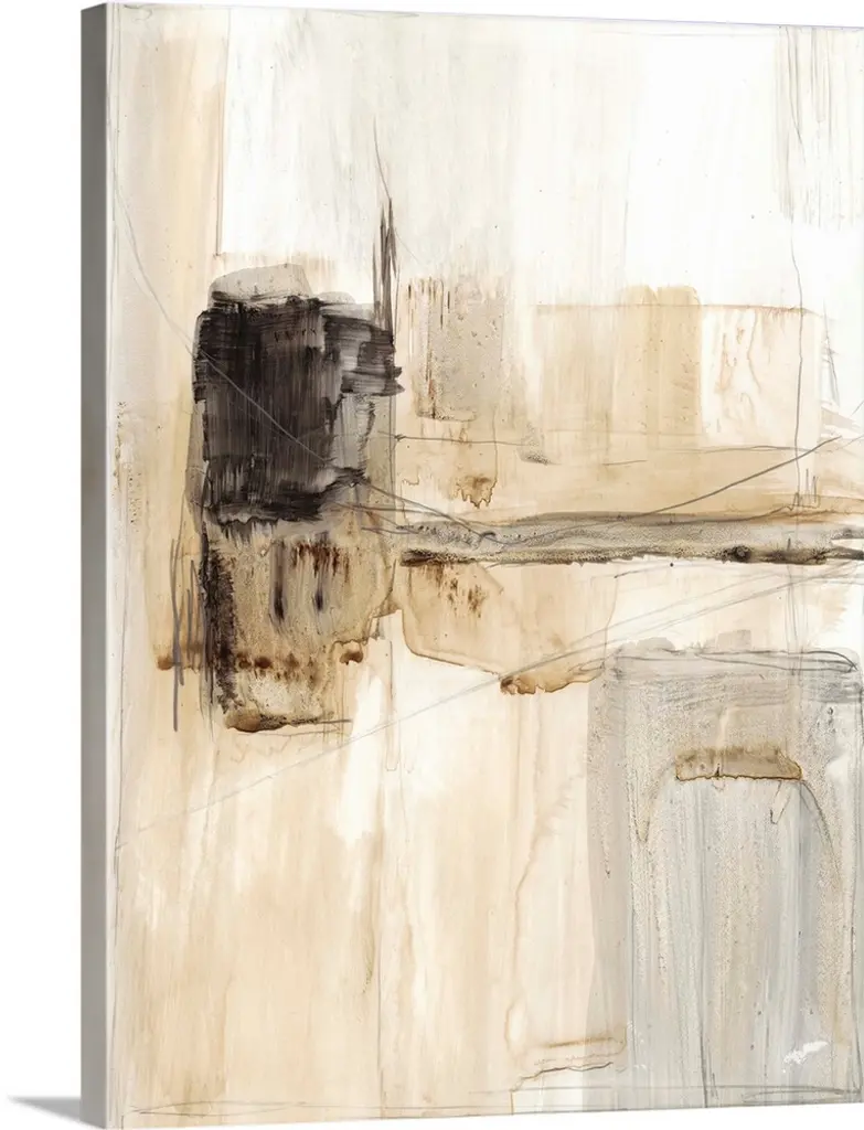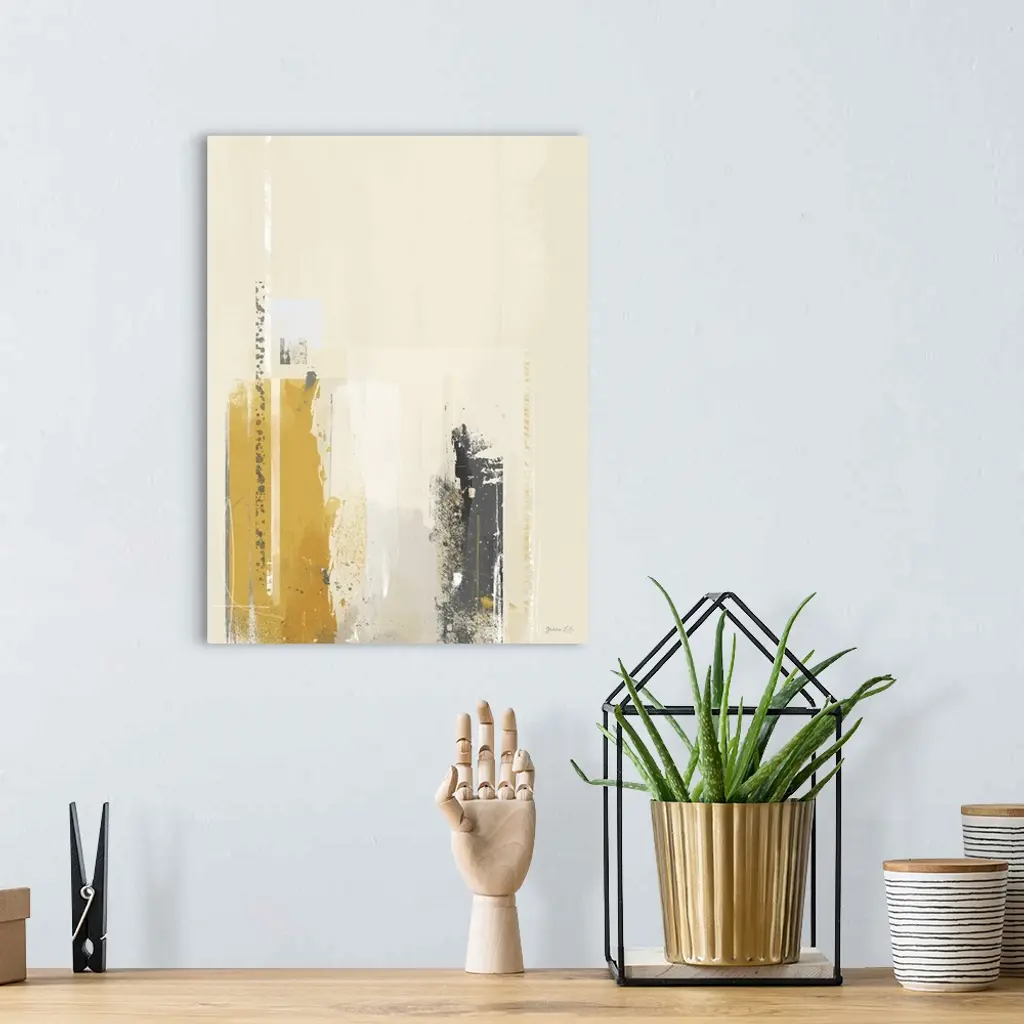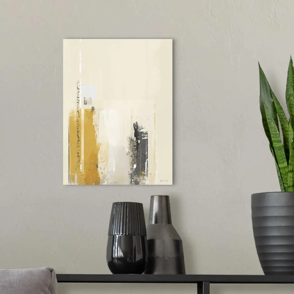 Abstract contemporary painting in black and yellow with angular shapes and paint splatters.