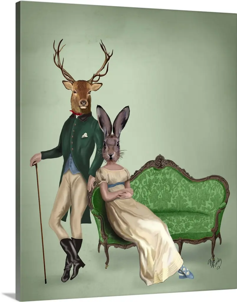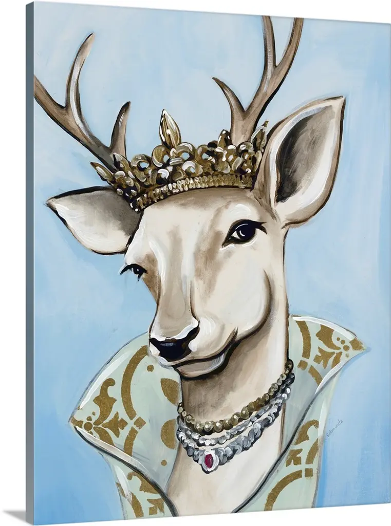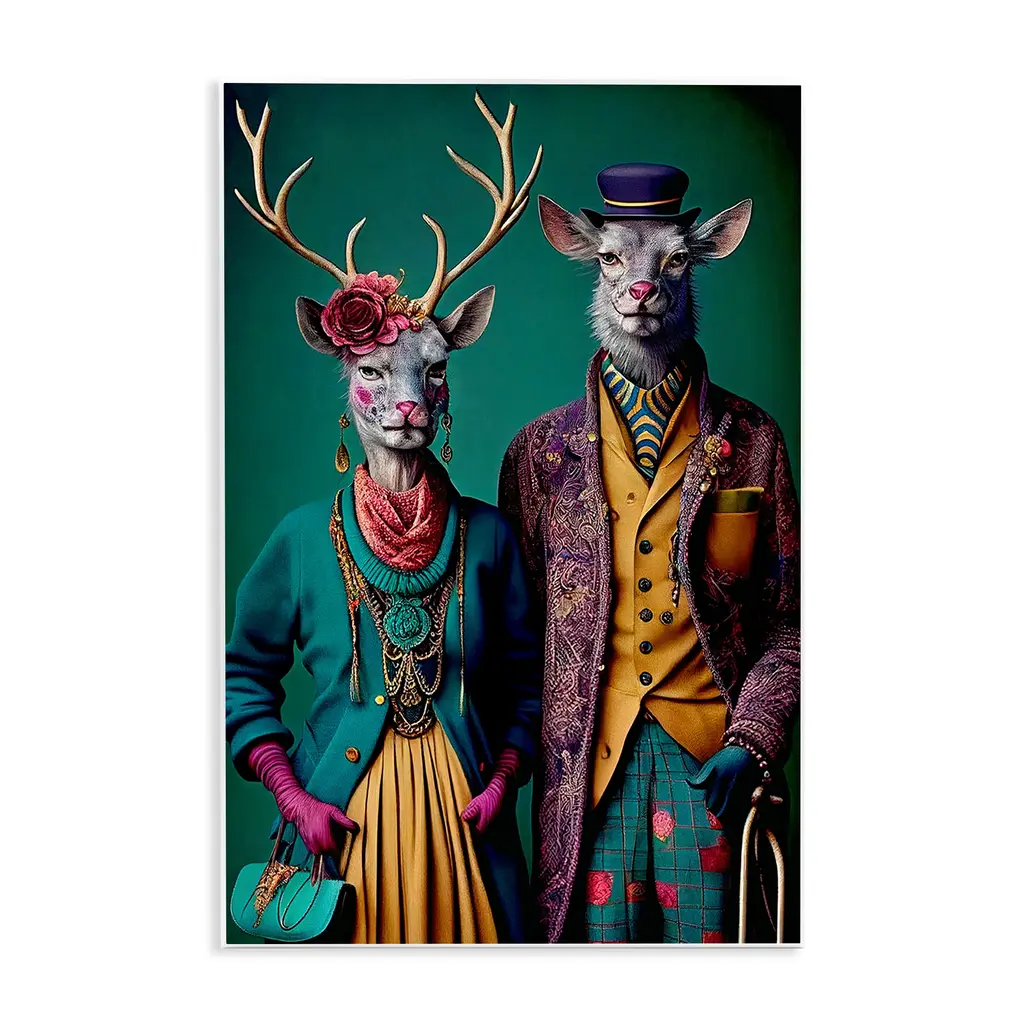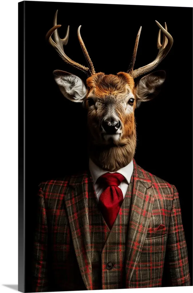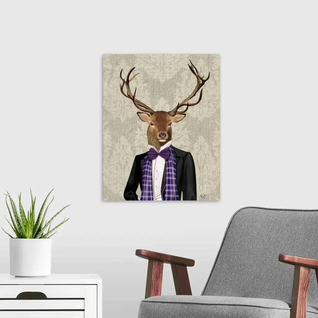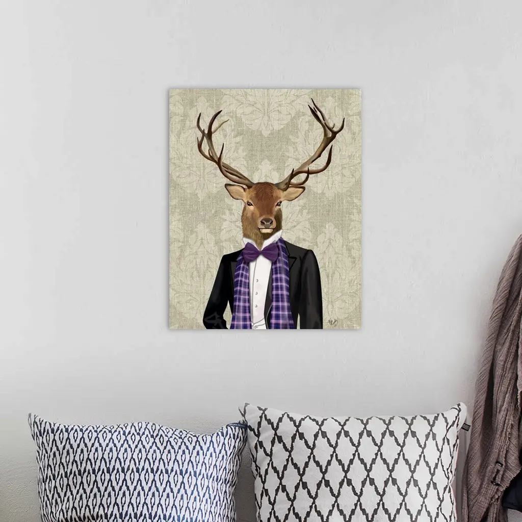 An anthropomorphic deer wearing a suit with a purple bow tie.
