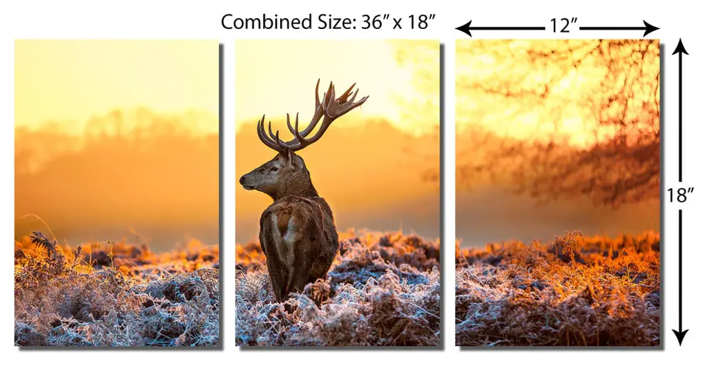 36"œ x 18"œ total size. Ready To Hang! (3 pieces - 12"œ x 18"œ each). 3 Panel Split (Triptych) Metal Print of a horned deer under the graceful haze of the morning sun, looking calmly into the horizon. Modern metal wall art for home or office wall decor & interior design. Printed on Luxurious, HD aluminum glossy metal panels. HD aluminum panels. Metal print wall art. Includes Shadow Wall Mount on the back.• Aluminum Metal Wall Art• Made in USA• Ready to hang - No assembly required• Shadow mount hardware on the back• 0.045"œ thick HD Aluminum Panels• Scratch resistant, glossy finish• Superb color clarity, luxurious prints• Epson printing process• For indoor or moisture rich environment use• Easy to clean. Gently wipe with microfiber cloth.