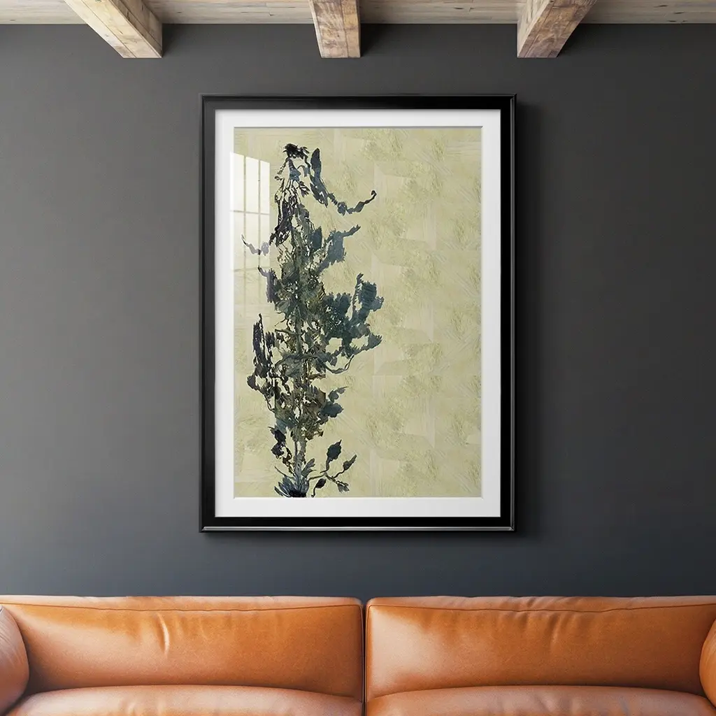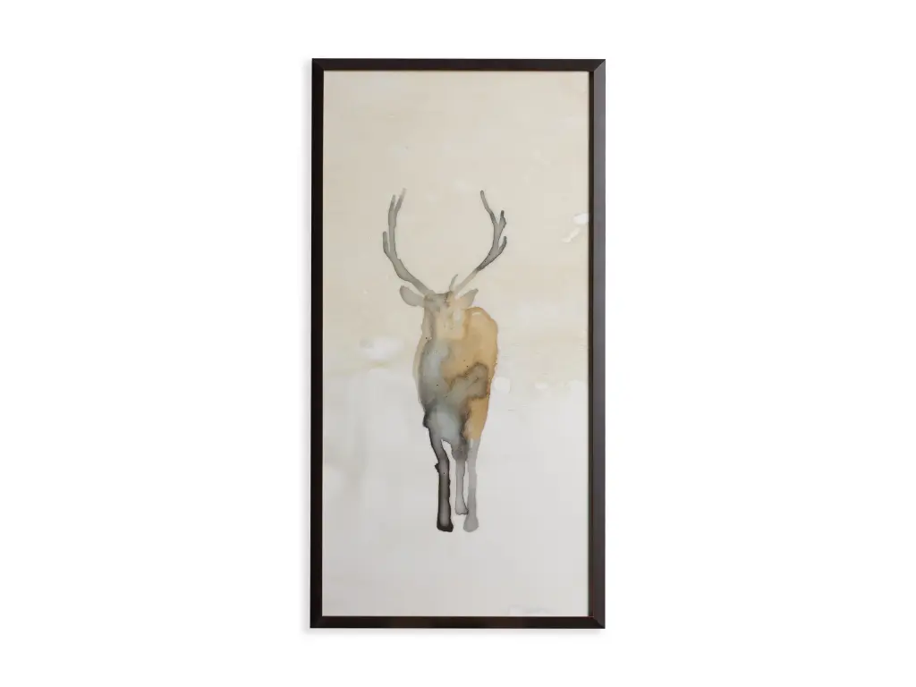 Inspired by an Arhaus favorite, The Herd print, artist Alexandra Carter creates a giclée reproduction of a stunning watercolor painting featuring the elegant silhouette of a deer as it walks across a snowy ground. This piece is framed in wood with a black finish.