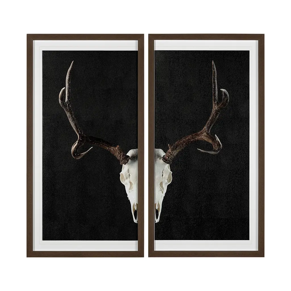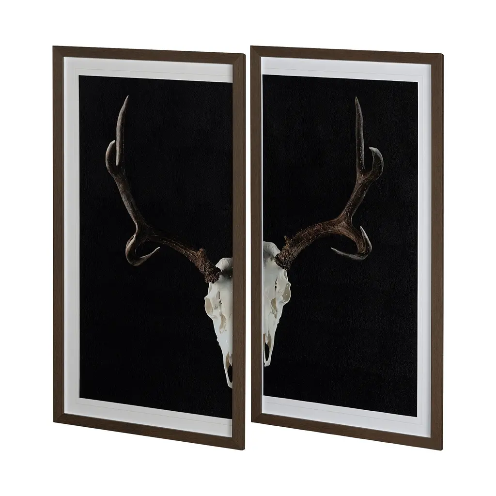 Introducing our stunning Deer Skull (Set of 2) Framed Art Print, a striking piece that beautifully combines nature and artistry. Each print features intricate details of deer skulls, hand-embellished to enhance their unique textures and patterns, making them truly one-of-a-kind.Dimensions: 33.0" L x 2.5" W x 63.0" HOrigin: Proudly produced in CanadaCustomization: Made to order for a personal touchThese framed art prints serve as a captivating focal point in any space, whether you're looking to add a touch of rustic elegance to your home or a bold statement in a gallery setting. The carefully chosen embellishments create a sense of depth and dimension, inviting viewers to explore the beauty of nature's artistry. Perfect for nature lovers and art enthusiasts alike, this set is an exquisite addition to your decor.