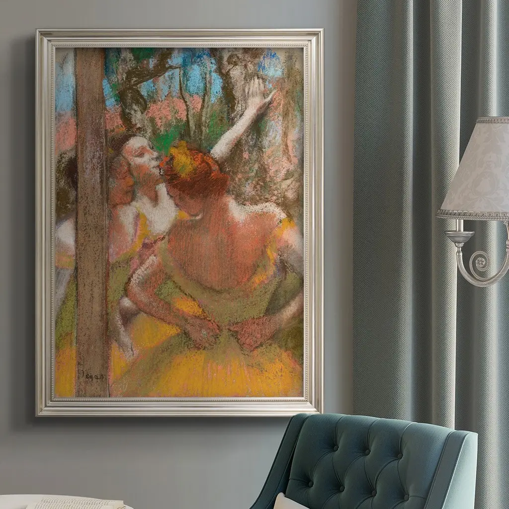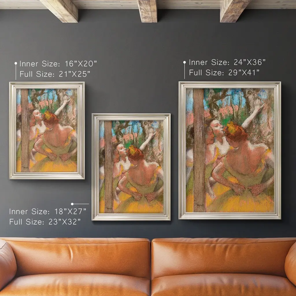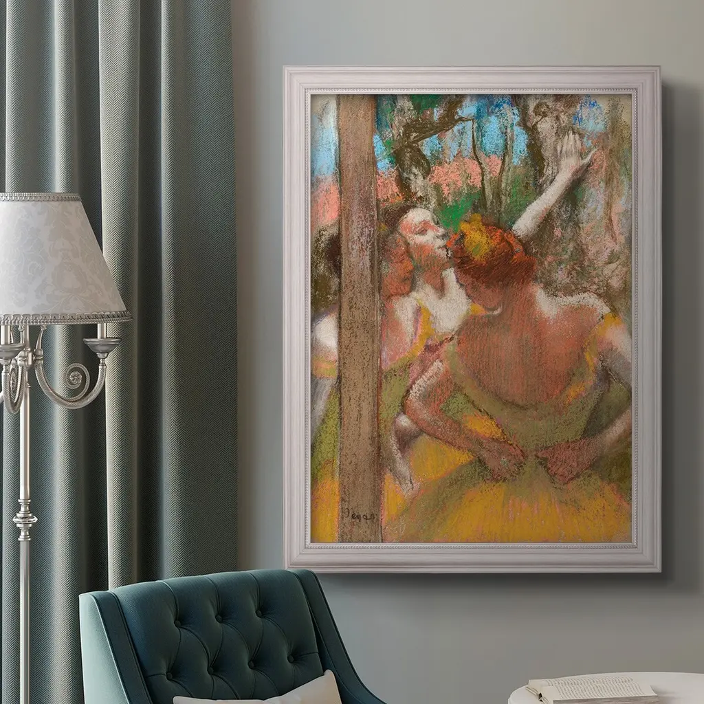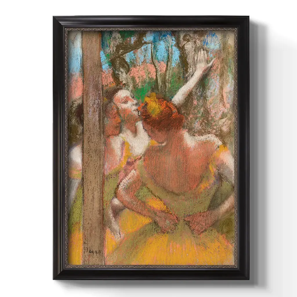 degas dancers 1896 Premium Framed Canvas- Ready to Hang A Premium Framed Canvas created to last. Framed in distressed wood and available in an array of sizes and colors Featuring a beveled a solid wood stretcher bar, each piece comes ready to hand 3 SIZES AVAILABLE 16''X20'' - Overall Size 18'X27'' - Overall Size 24''x36'' - Overall Size Each piece is made to order. Each piece comes with hanging hardware. Made in the USA Ready to Hang Giclee Paper Print Acrylic Glass Beveled Matt Board
