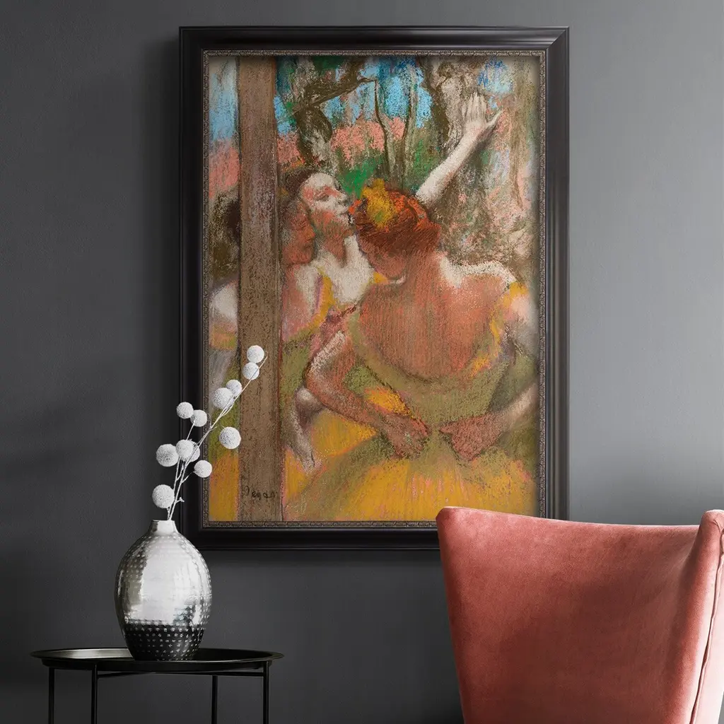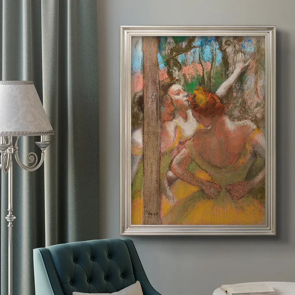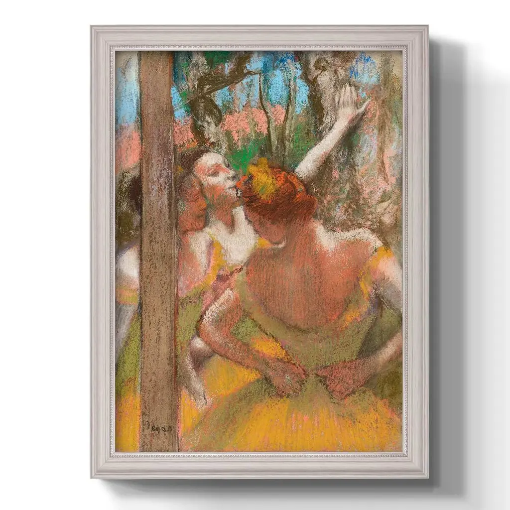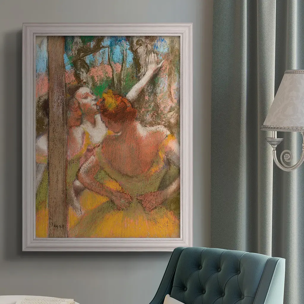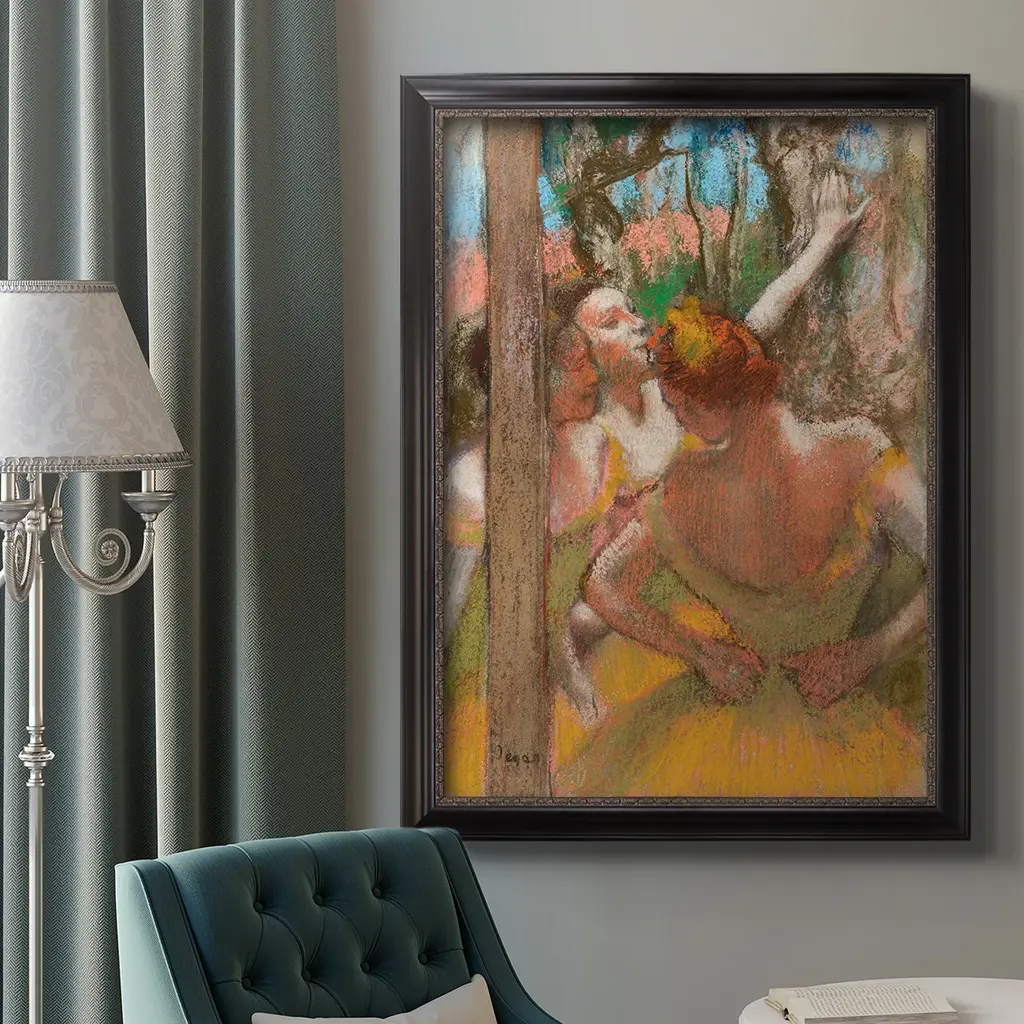 degas dancers 1896 Premium Framed Canvas- Ready to Hang A Premium Framed Canvas created to last. Framed in distressed wood and available in an array of sizes and colors Featuring a beveled a solid wood stretcher bar, each piece comes ready to hand 3 SIZES AVAILABLE 16''X20'' - Overall Size 18'X27'' - Overall Size 24''x36'' - Overall Size Each piece is made to order. Each piece comes with hanging hardware. Made in the USA Ready to Hang Giclee Paper Print Acrylic Glass Beveled Matt Board